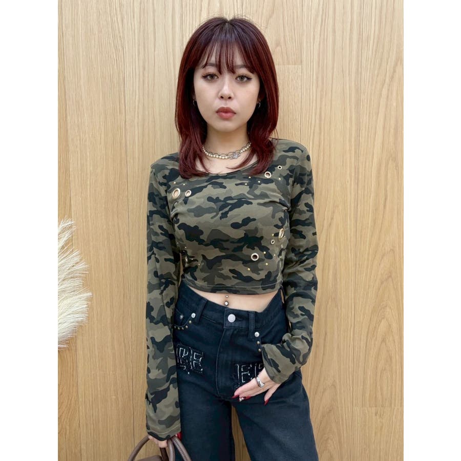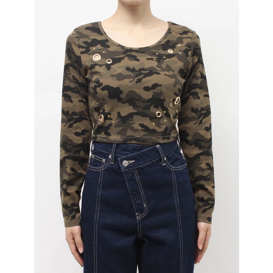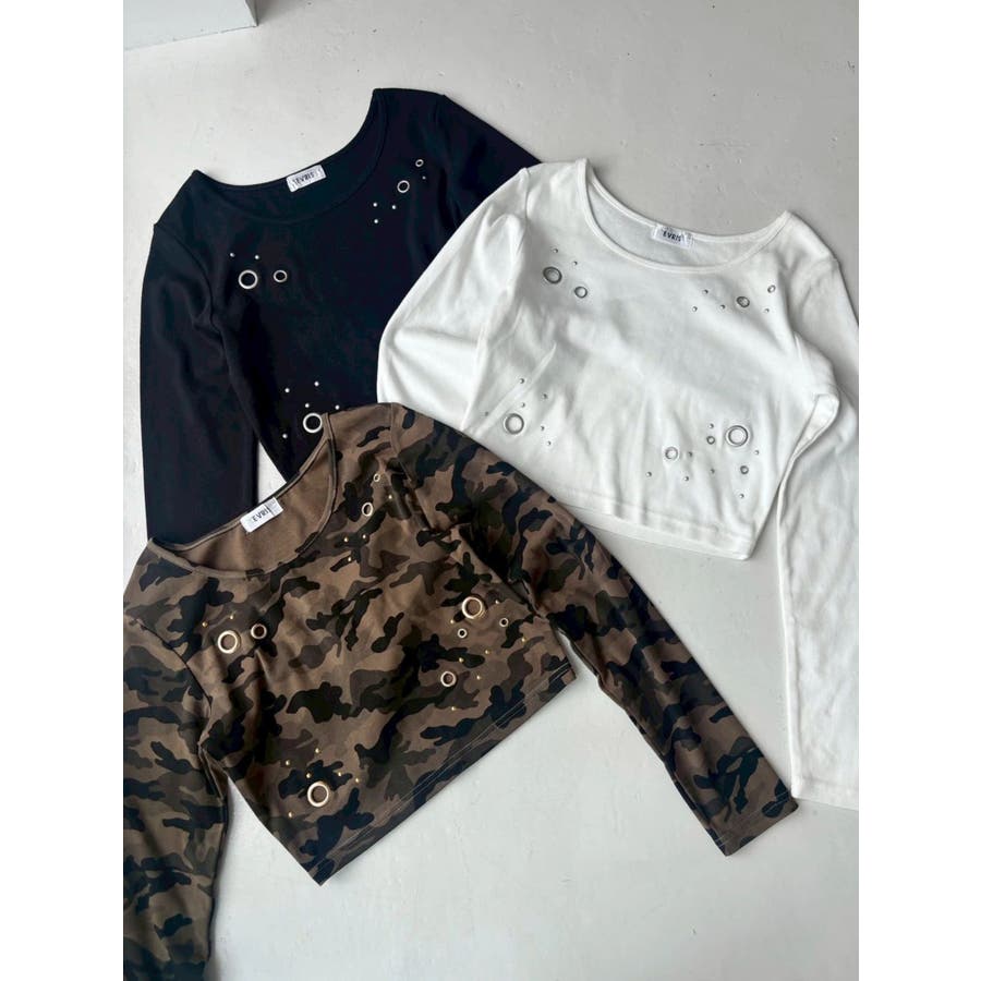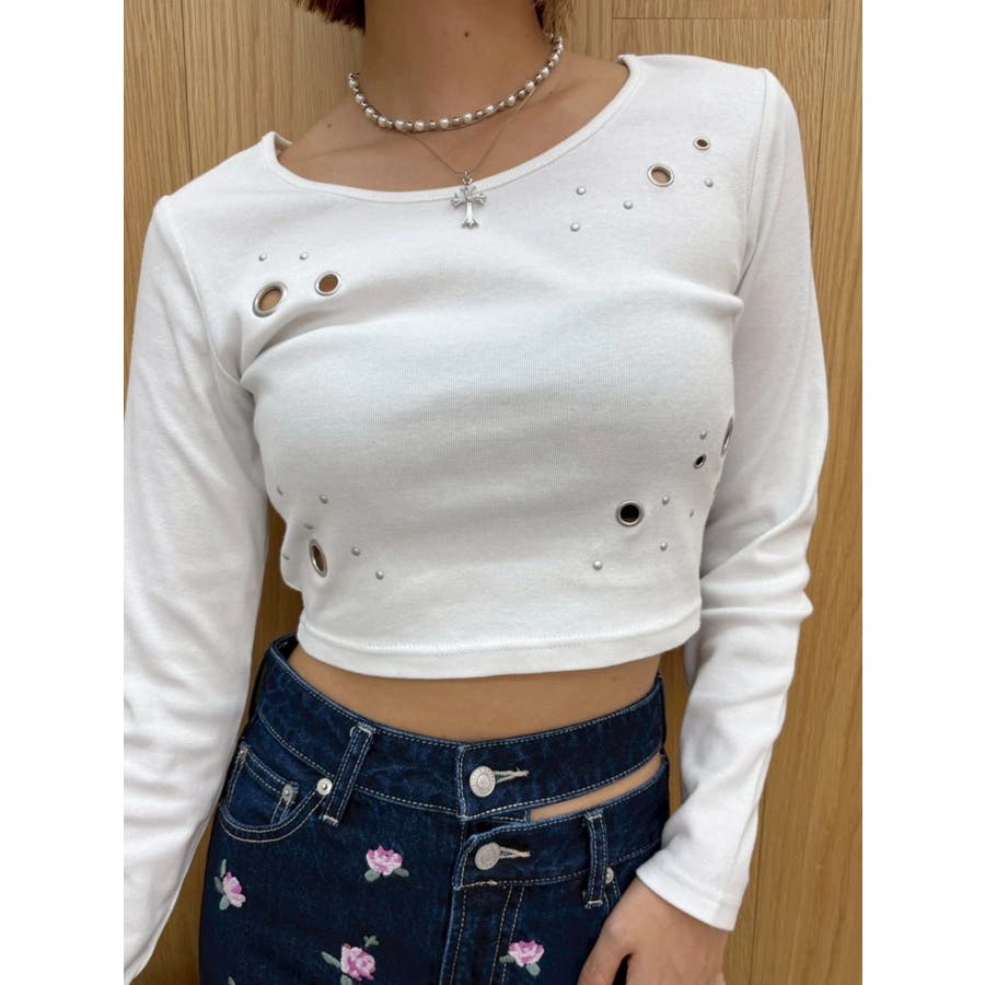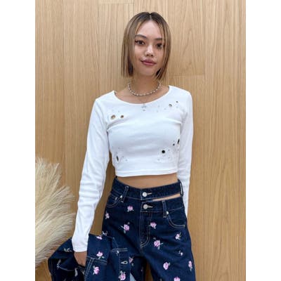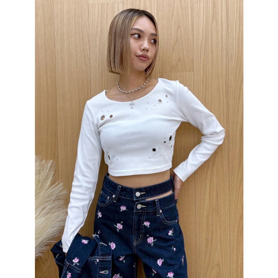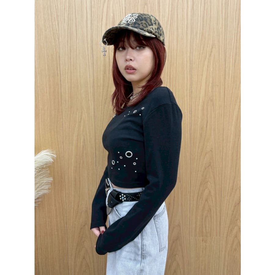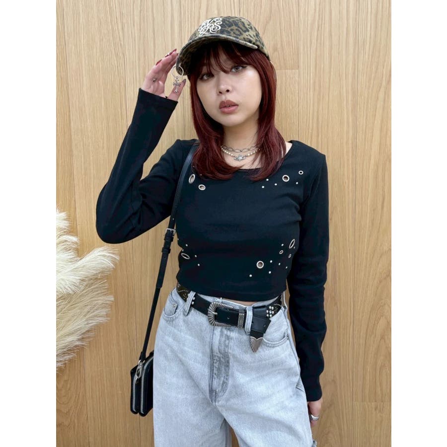 トレンドのアイレットデザインを落とし込んだクロップドロンTです。伸縮性のあるフライスを使用しており、着心地の良い1枚です。数種類のアイレットやスタッズを散りばめており、程よく肌見せスタイルが楽しめます。インナーが見えにくい位置にアイレットをつけているため安心して着用できます。