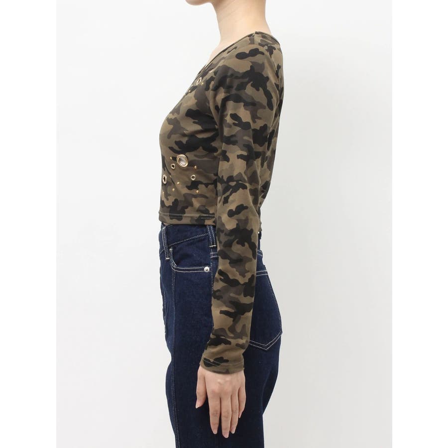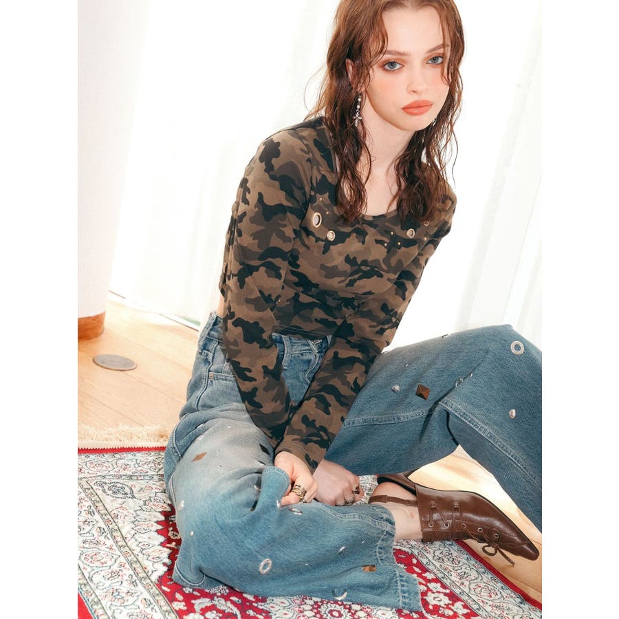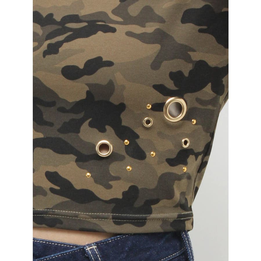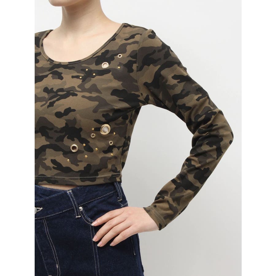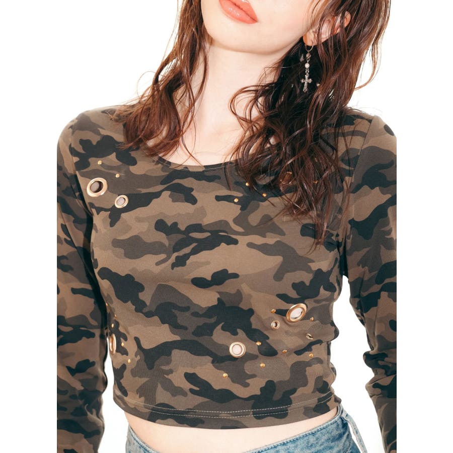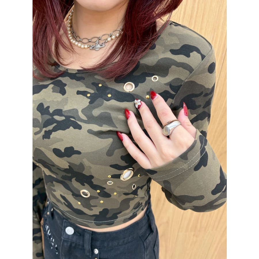 トレンドのアイレットデザインを落とし込んだクロップドロンTです。伸縮性のあるフライスを使用しており、着心地の良い1枚です。数種類のアイレットやスタッズを散りばめており、程よく肌見せスタイルが楽しめます。インナーが見えにくい位置にアイレットをつけているため安心して着用できます。