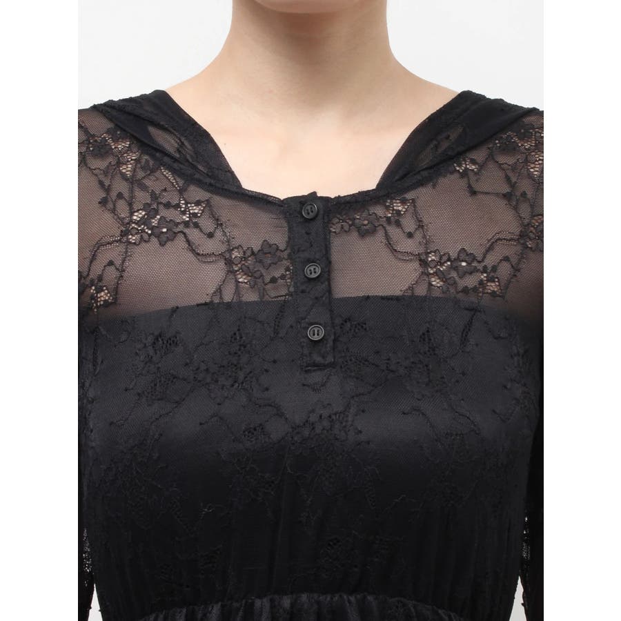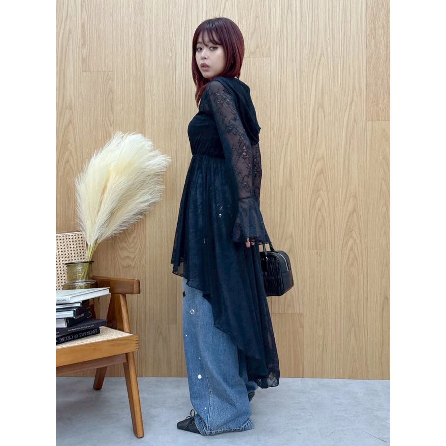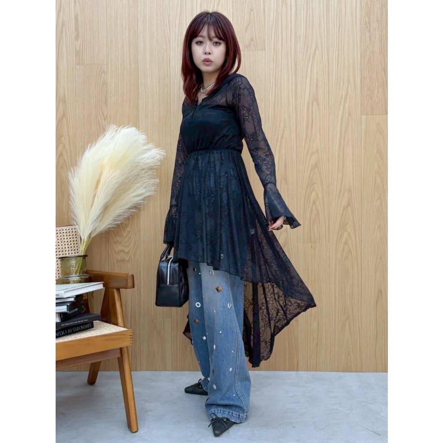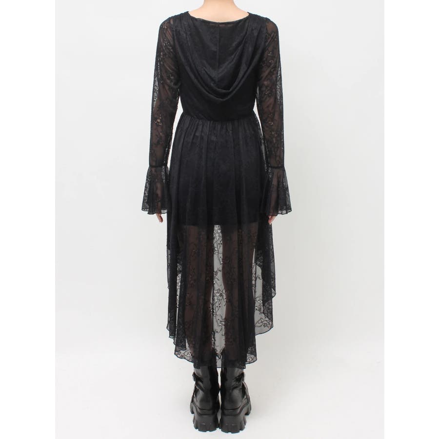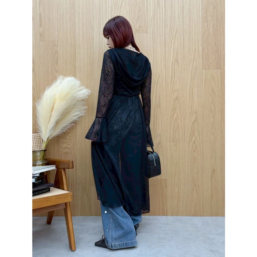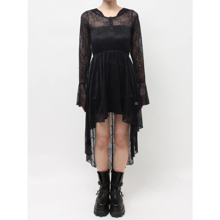 トレンドのフーディデザインのレースワンピースです。イレヘムになっており、後ろ側が長いデザインなので、スタイルアップ効果があります。インナーにベアワンピが付いており、1枚ではワンピース風に着用可能ですし、インナーにキャミソールやデニムをレイヤードしたスタイリングなども楽しめます。甘目のワンピースはエッジの効いたアウターやブーツなどと合わせるスタイリングがおすすめです。