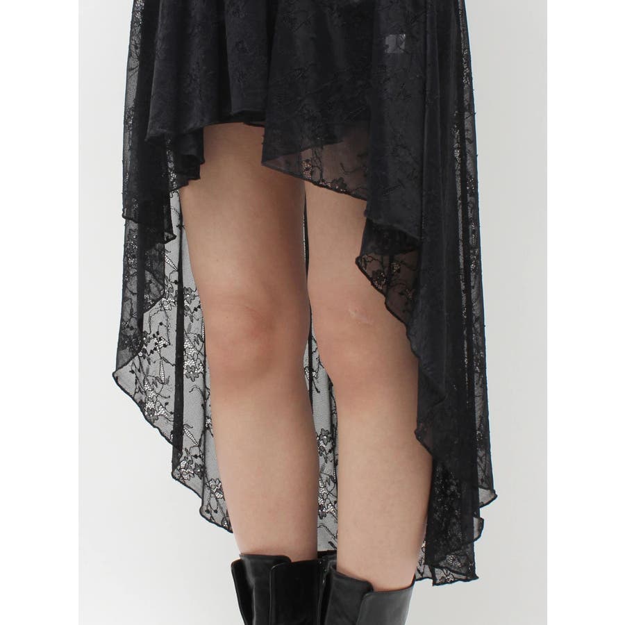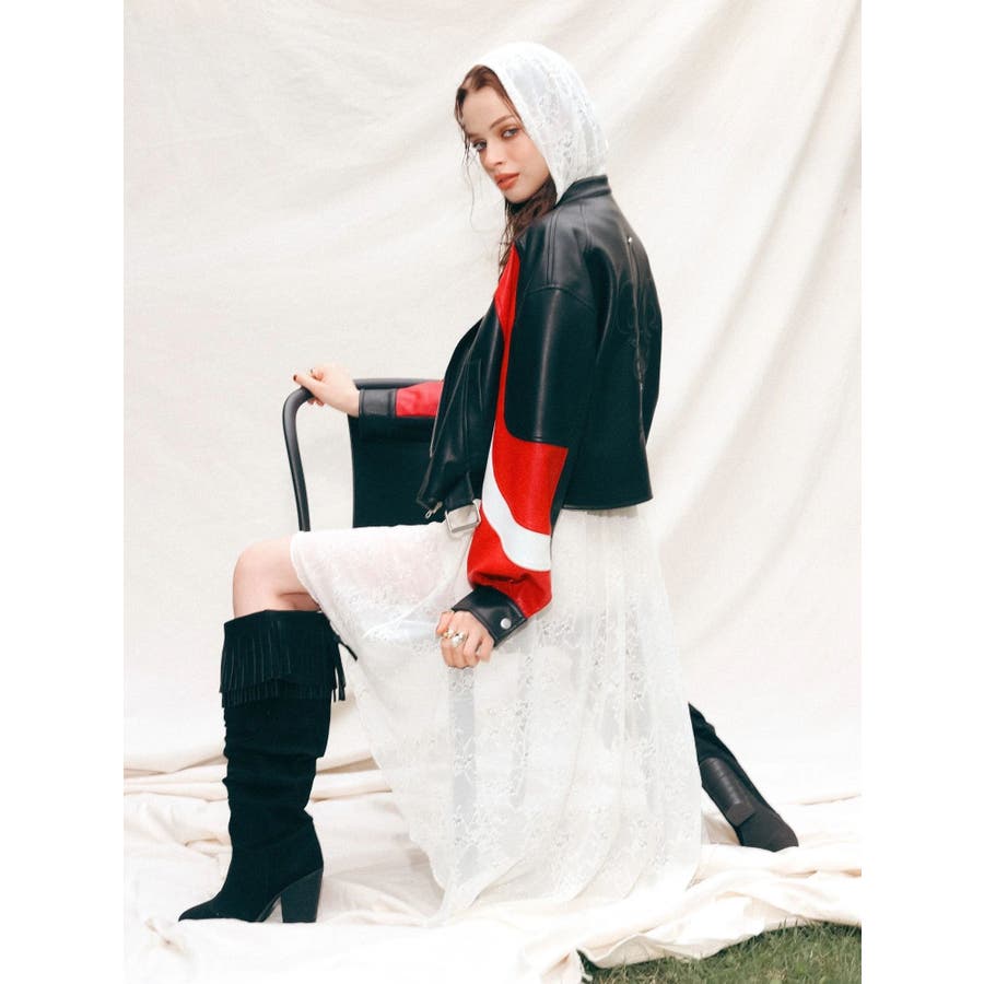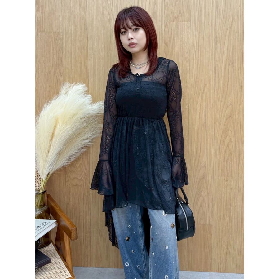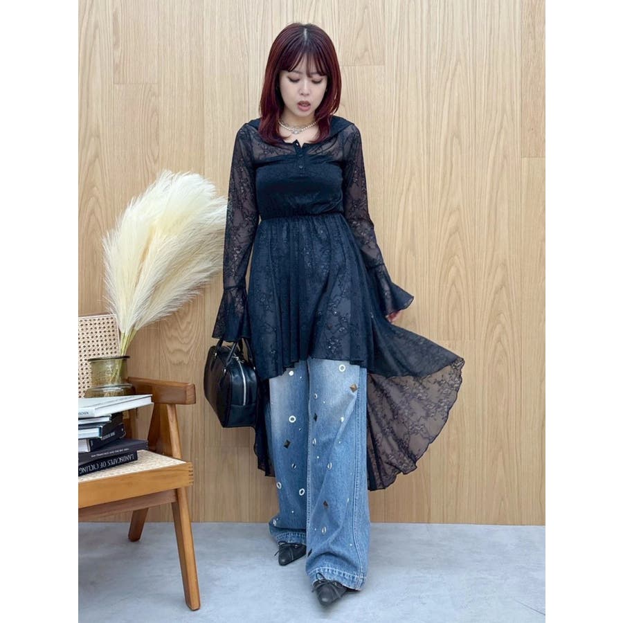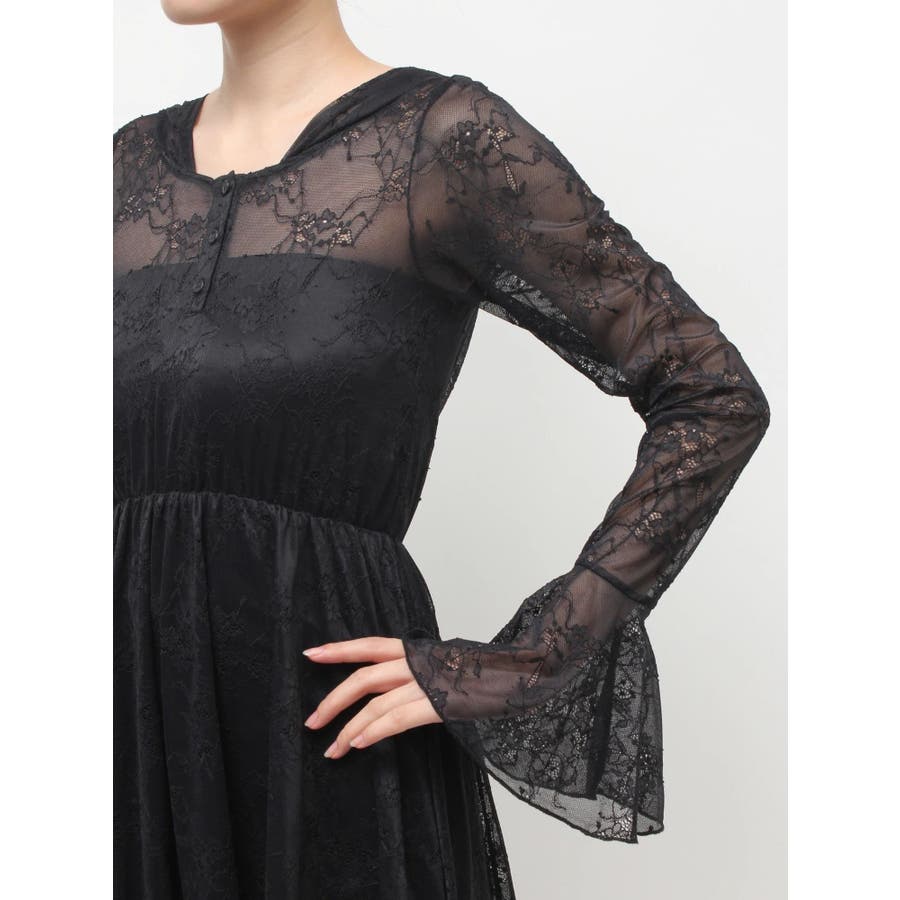 トレンドのフーディデザインのレースワンピースです。イレヘムになっており、後ろ側が長いデザインなので、スタイルアップ効果があります。インナーにベアワンピが付いており、1枚ではワンピース風に着用可能ですし、インナーにキャミソールやデニムをレイヤードしたスタイリングなども楽しめます。甘目のワンピースはエッジの効いたアウターやブーツなどと合わせるスタイリングがおすすめです。