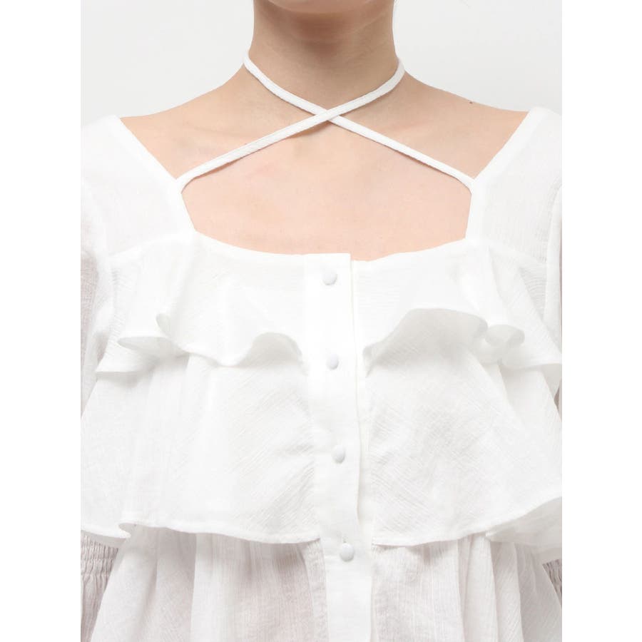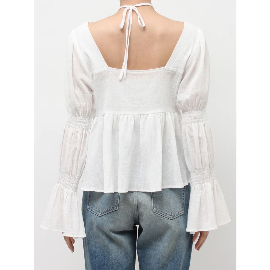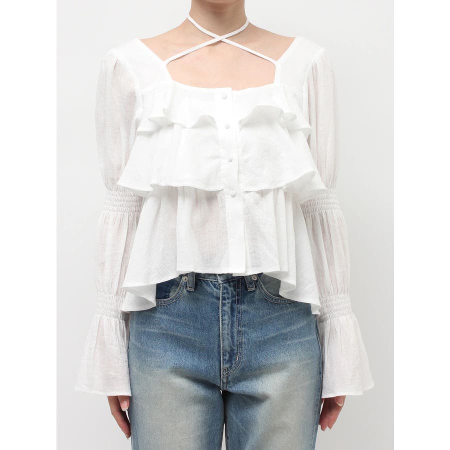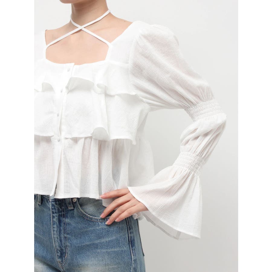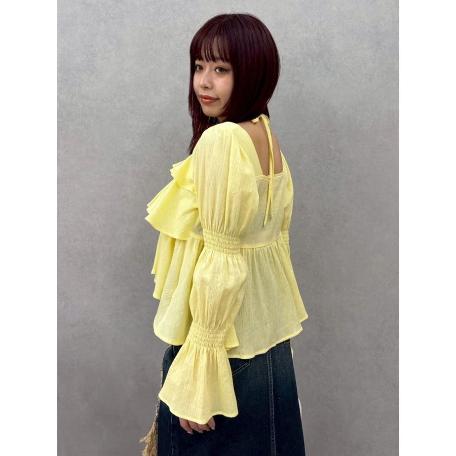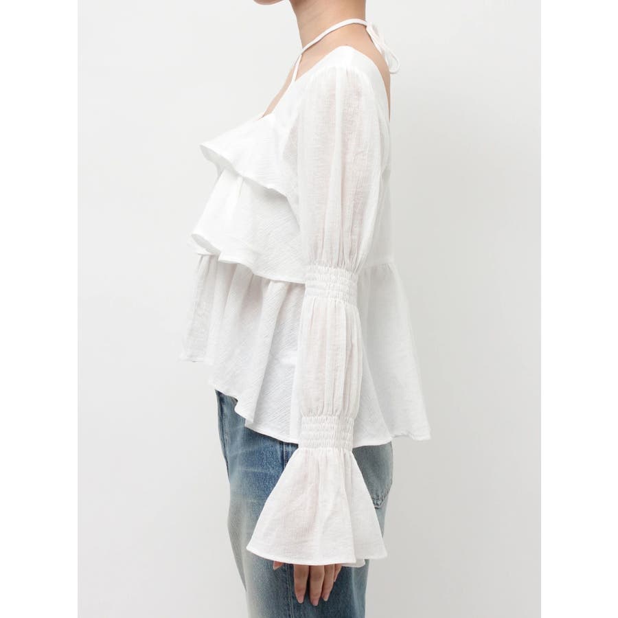 今季トレンドのBOHOスタイルにはかかせない甘めブラウスです。ラッフルとキャンディースリーブでガーリーデザインに仕上がっています。EVRISらしくホルターネックデザインを取り入れ、キャッチーな印象に仕上げています。デコルテ周りも広めに開いているので抜け感がありどんなボトムにも合わせやすいです。ミニボトム×ブーツのスタイリングが今季おすすめのスタイリングです。※サイズ感はYLWのサンプルが正しいです。