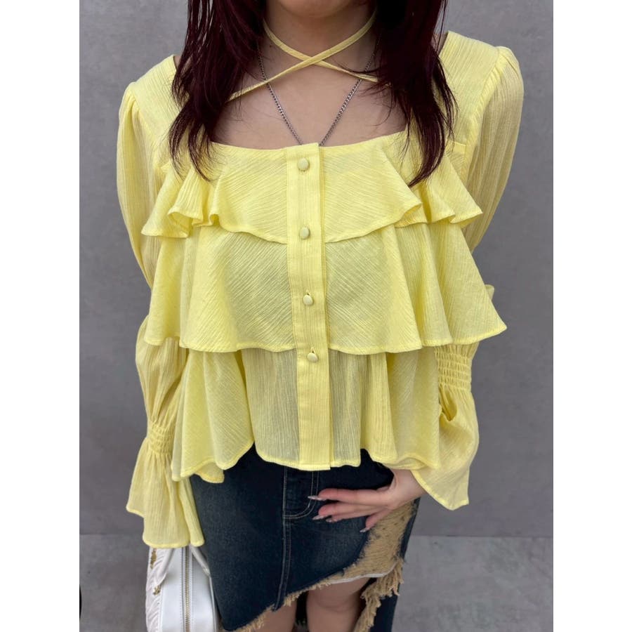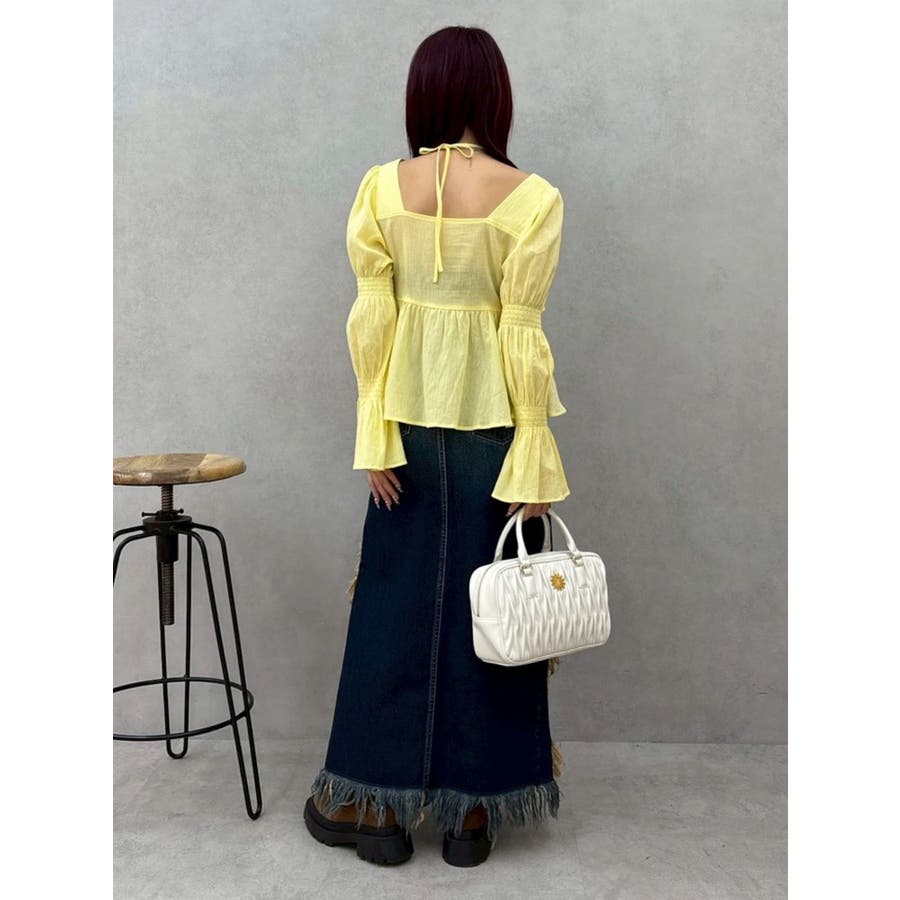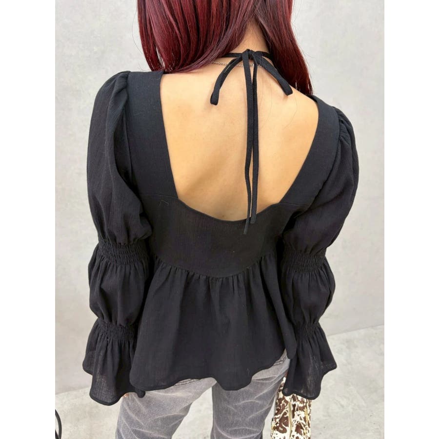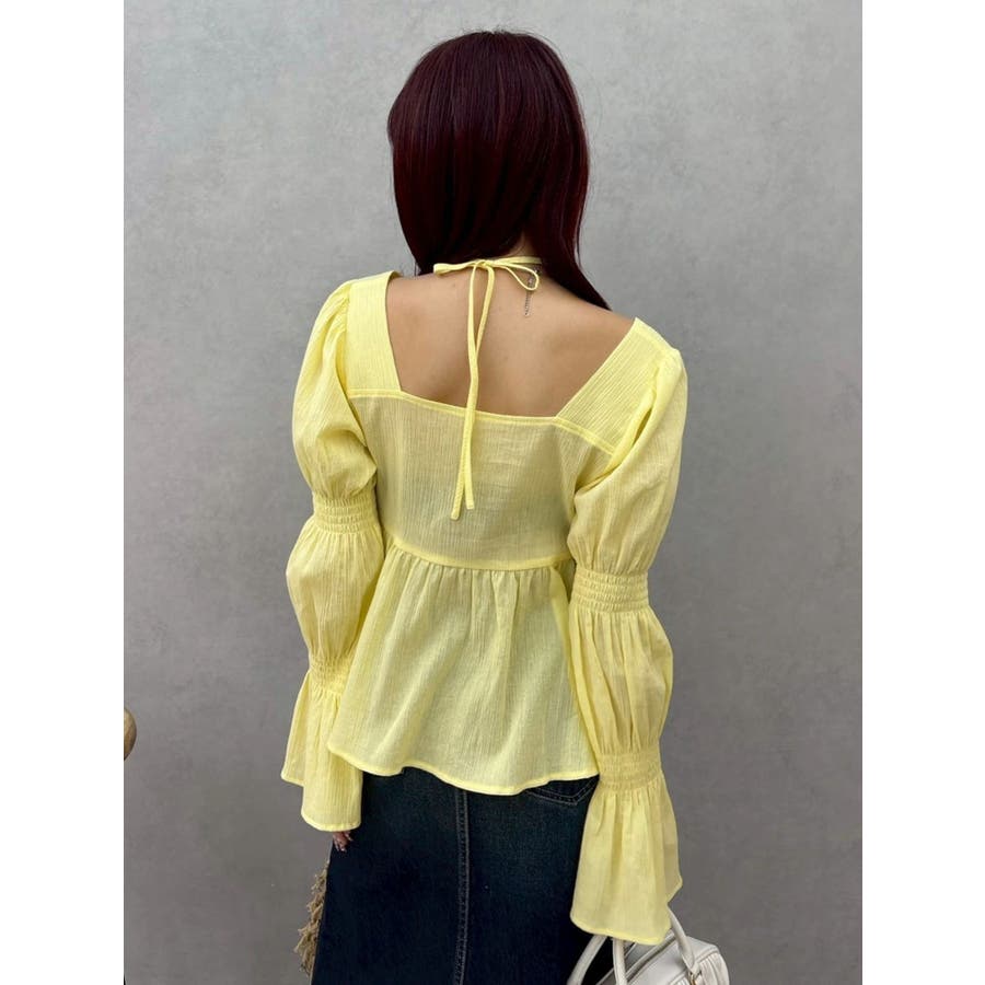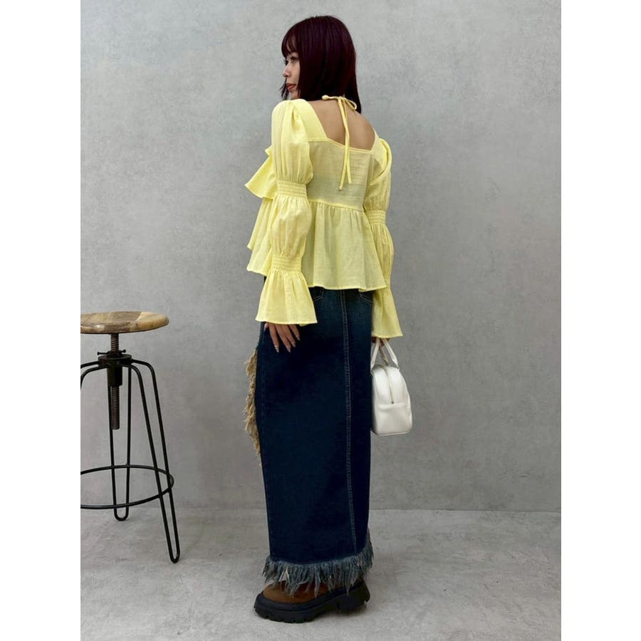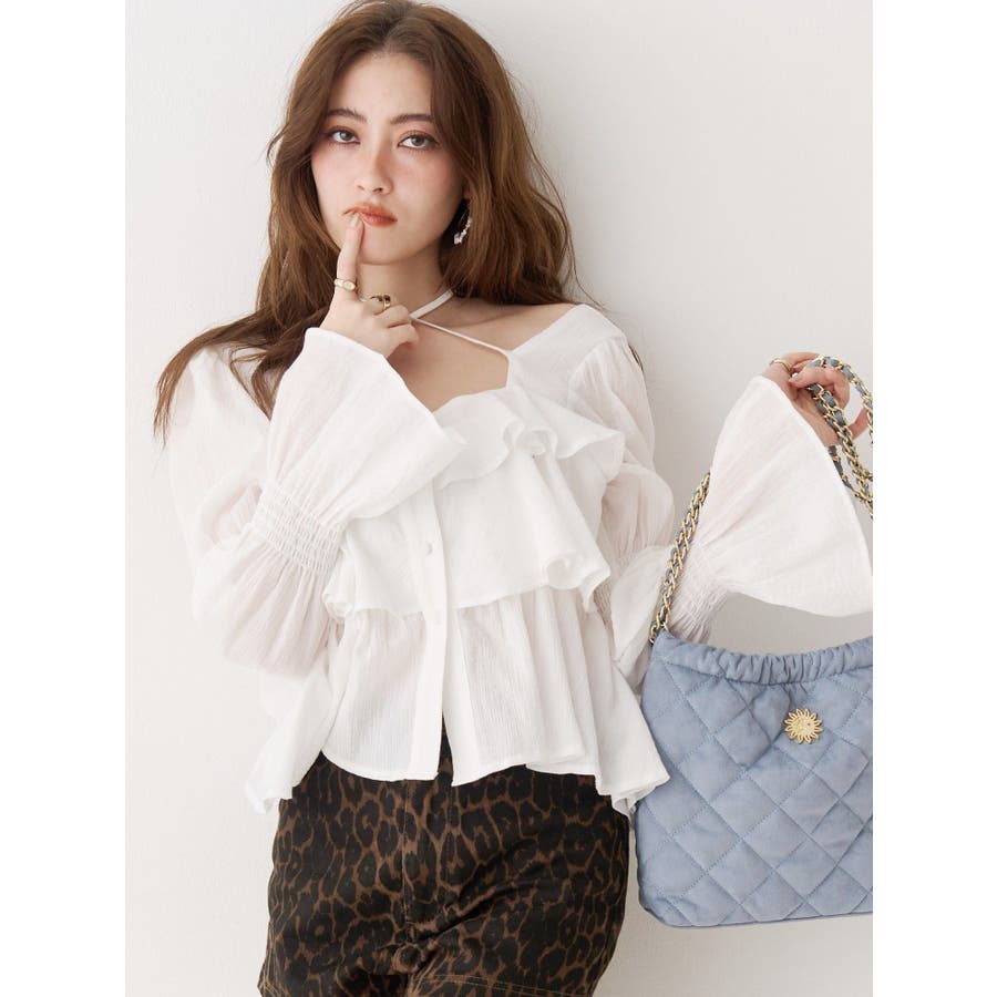 今季トレンドのBOHOスタイルにはかかせない甘めブラウスです。ラッフルとキャンディースリーブでガーリーデザインに仕上がっています。EVRISらしくホルターネックデザインを取り入れ、キャッチーな印象に仕上げています。デコルテ周りも広めに開いているので抜け感がありどんなボトムにも合わせやすいです。ミニボトム×ブーツのスタイリングが今季おすすめのスタイリングです。※サイズ感はYLWのサンプルが正しいです。