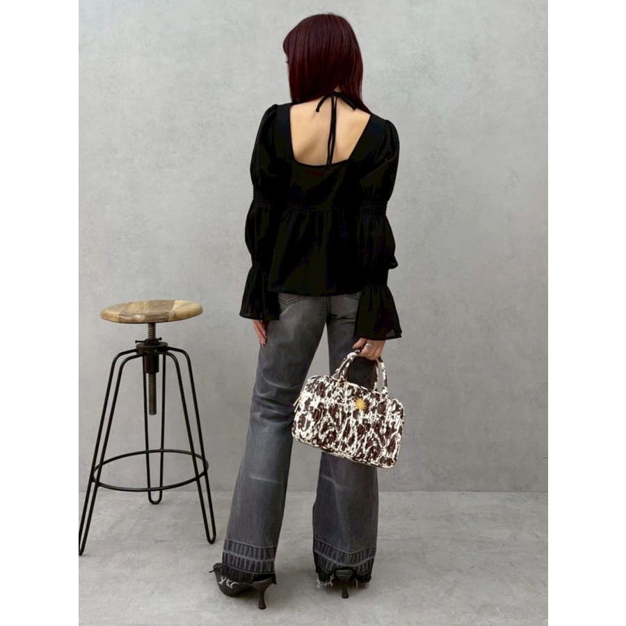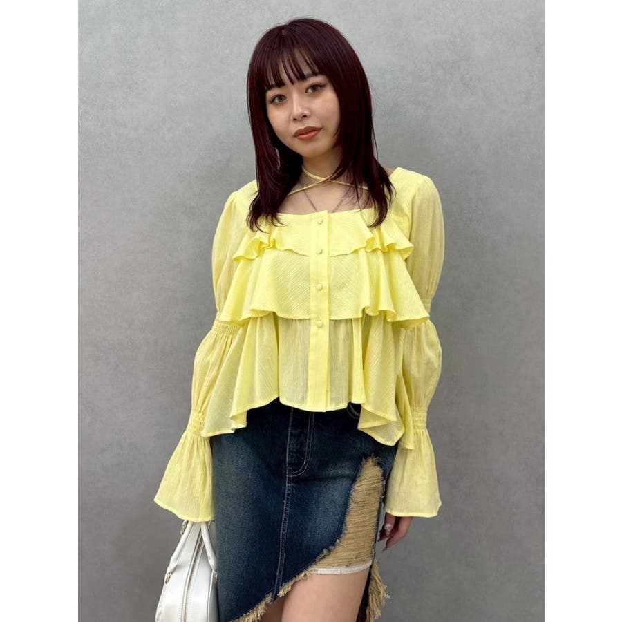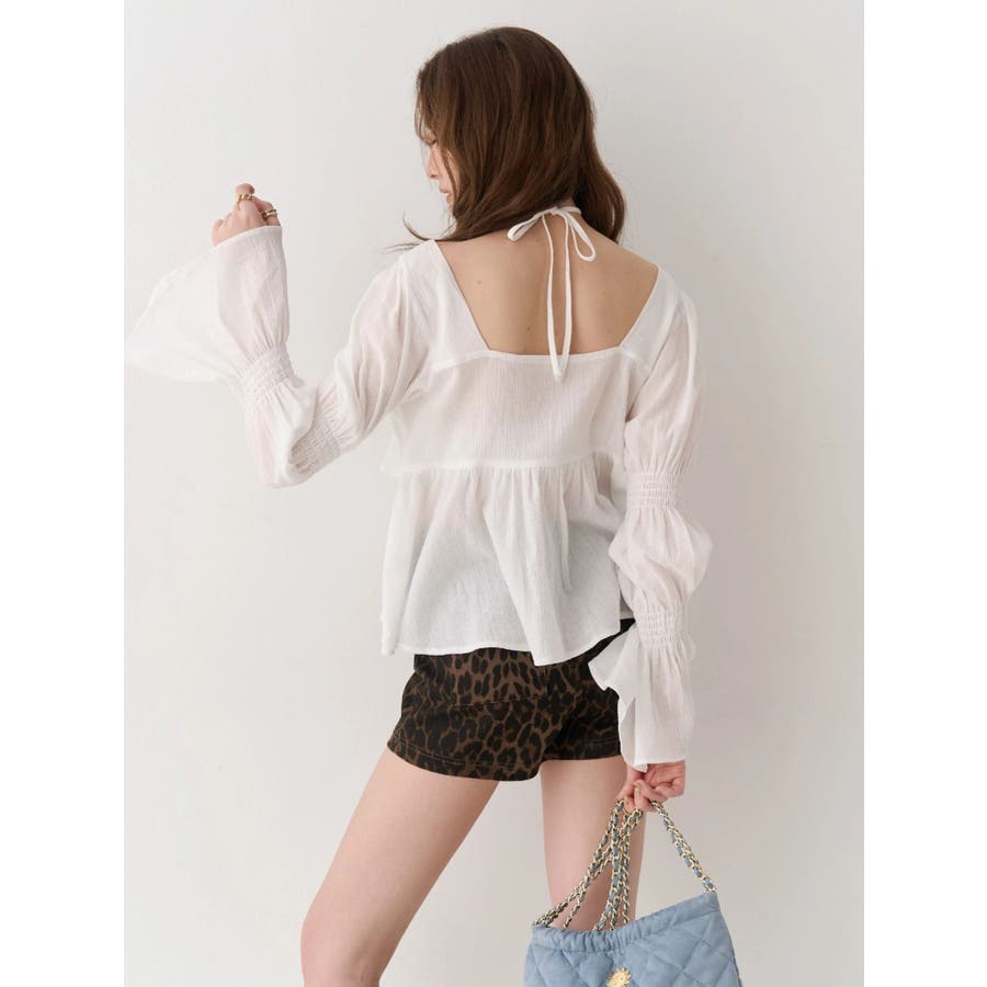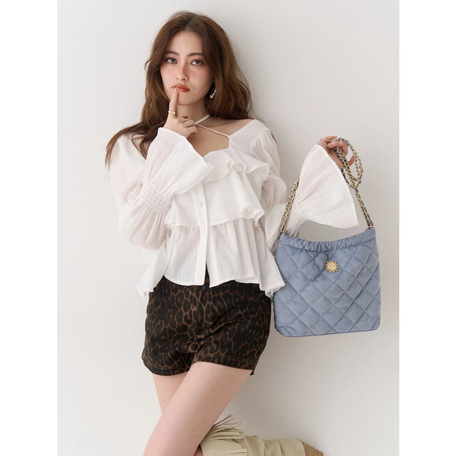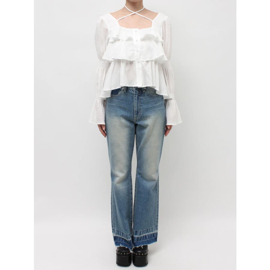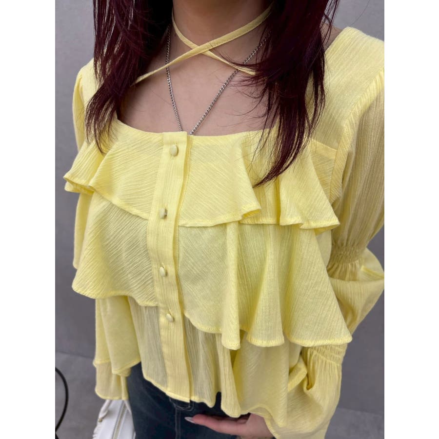 今季トレンドのBOHOスタイルにはかかせない甘めブラウスです。ラッフルとキャンディースリーブでガーリーデザインに仕上がっています。EVRISらしくホルターネックデザインを取り入れ、キャッチーな印象に仕上げています。デコルテ周りも広めに開いているので抜け感がありどんなボトムにも合わせやすいです。ミニボトム×ブーツのスタイリングが今季おすすめのスタイリングです。※サイズ感はYLWのサンプルが正しいです。