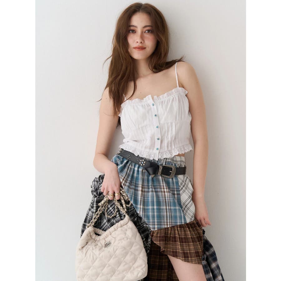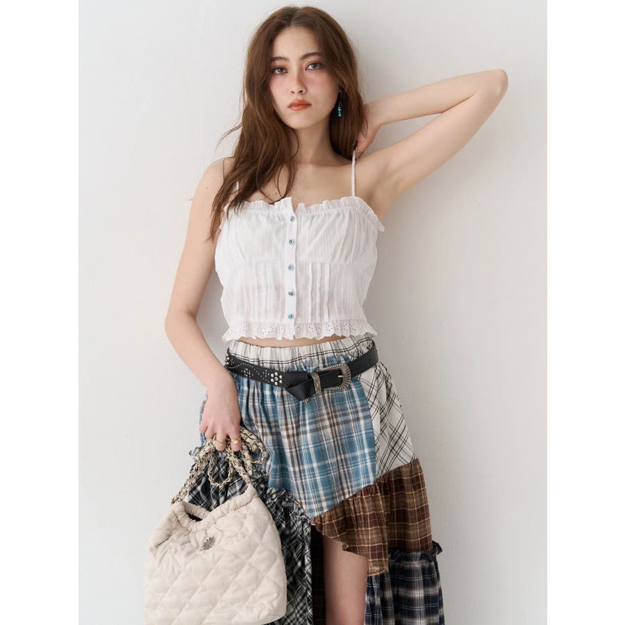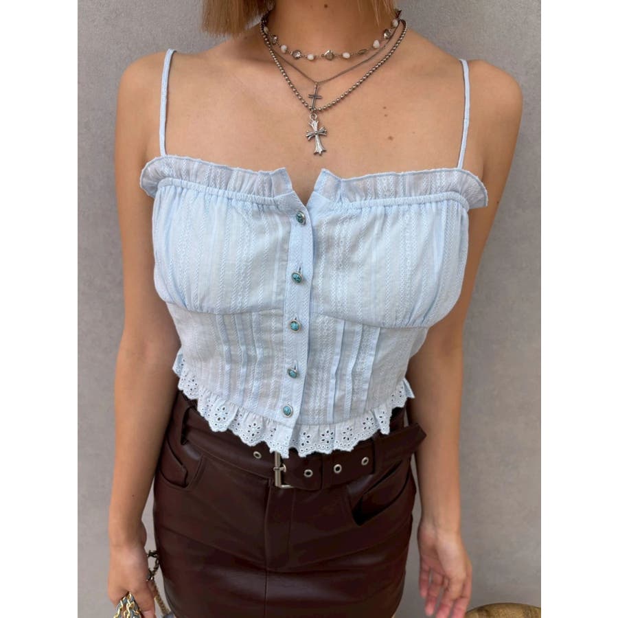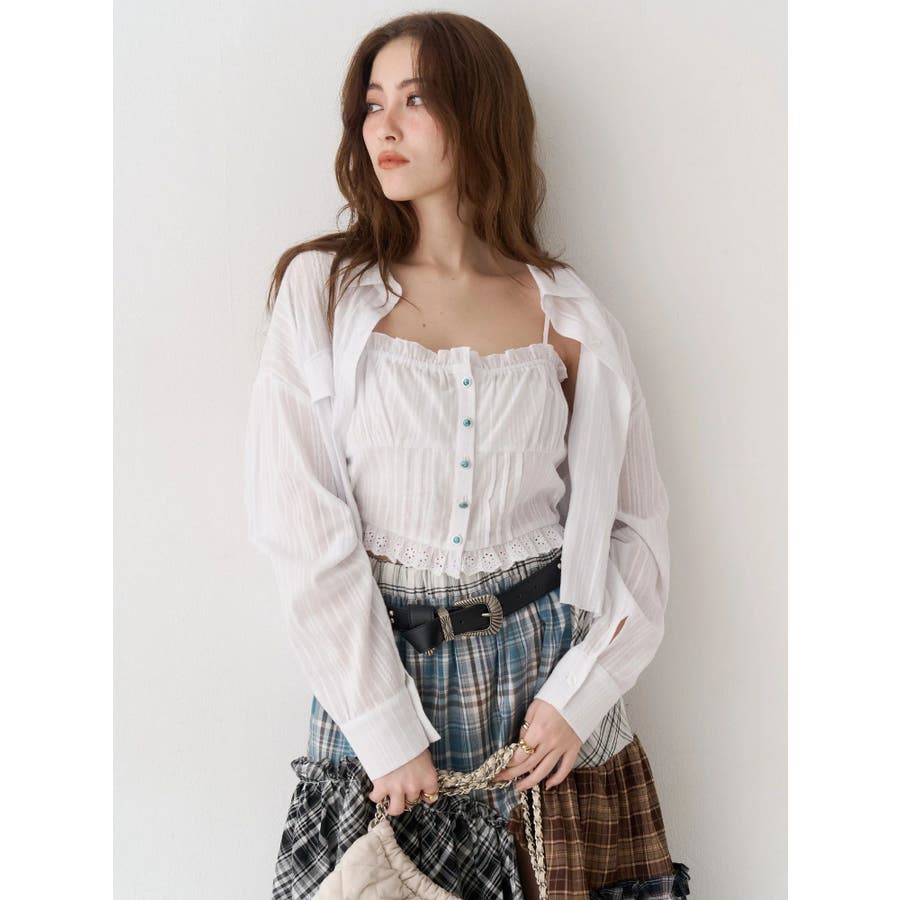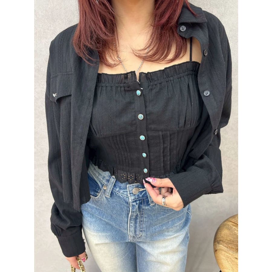 ■デザイン裾が断ち切り仕様のショートシャツとレースドッキングキャミソールをセットにしたアンサンブルシャツトップスです。シャツにはBOHOムード漂うターコイズシェルボタンを使用。キャミソールはコットンレースをドッキングしたデザイン性の高い1枚で、春から夏まで長く楽しめるアイテムです。■スタイリングボリュームのあるスカートをあわせたBOHOスタイルがおすすめ。シャツだけ、キャミソールだけそれぞれ別々にも着用できる着回し力の高いアイテムです。シンプルにデニムパンツとあわせてもターコイズボタンが映え、オシャレに決まります。 --------------透け感:ややあり裏地:なし生地の厚み:軽め伸縮性:なし--------------