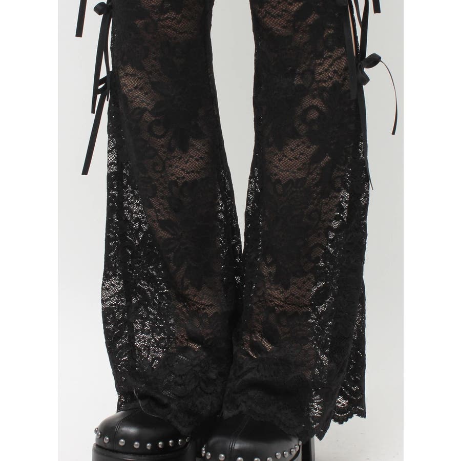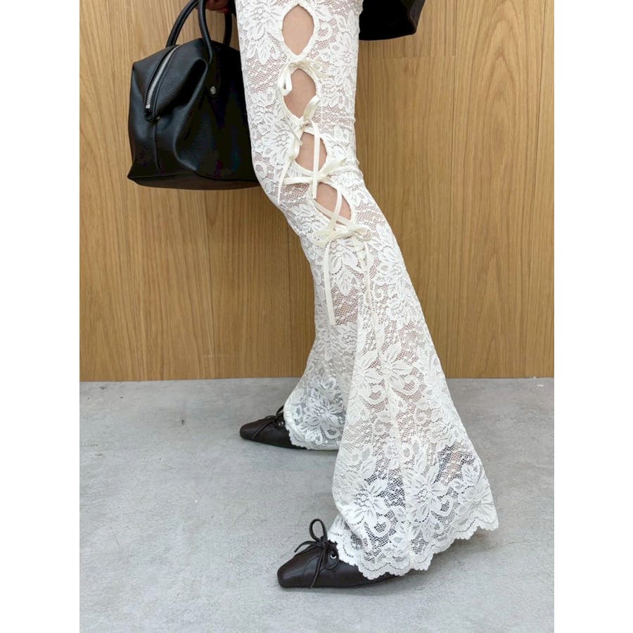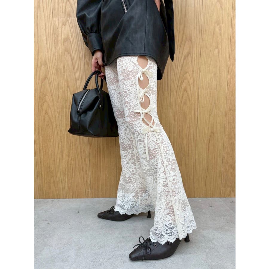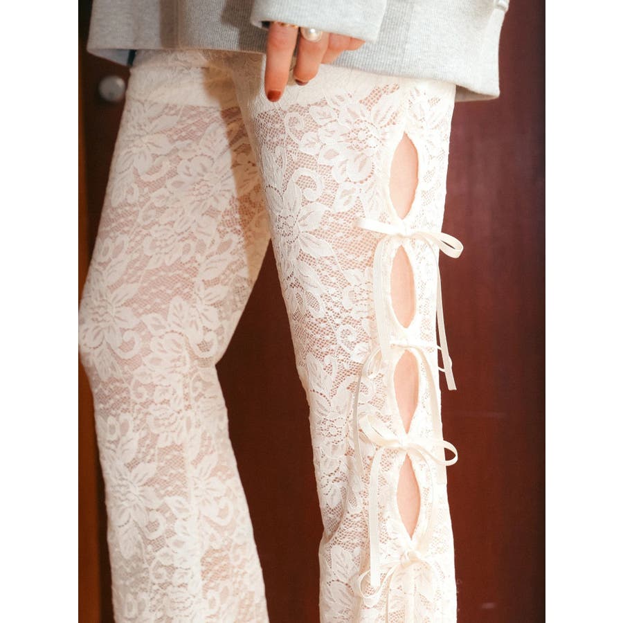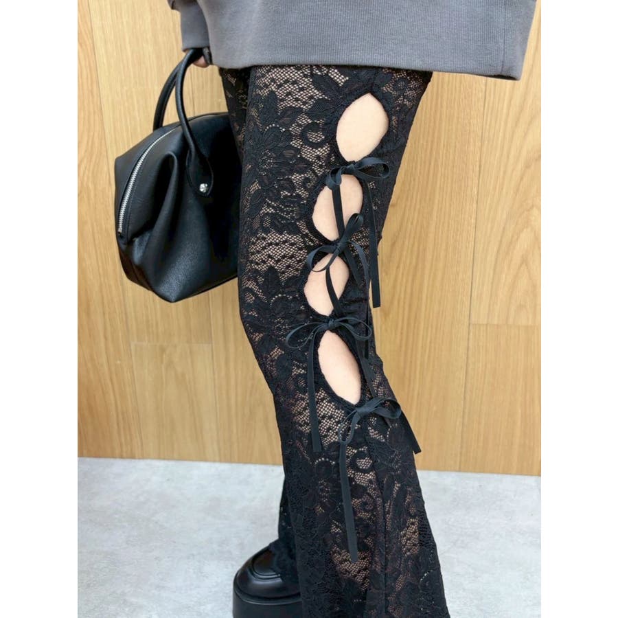 サイドにリボンデザインを入れたレス素材のフレアレギンスです。ウエストはゴム仕様で、レース自体もストレッチ性のある生地なのでストレスフリーに着用できます。裾はスカラップになっており、高見えする素材です。BIGサイズのトップスなどと合わせるとスタイルアップ効果があります。ショートパンツ丈で裏地が付いているため安心して着用できます。