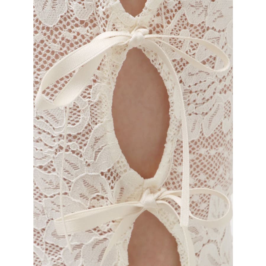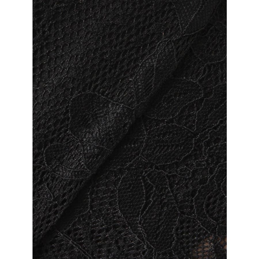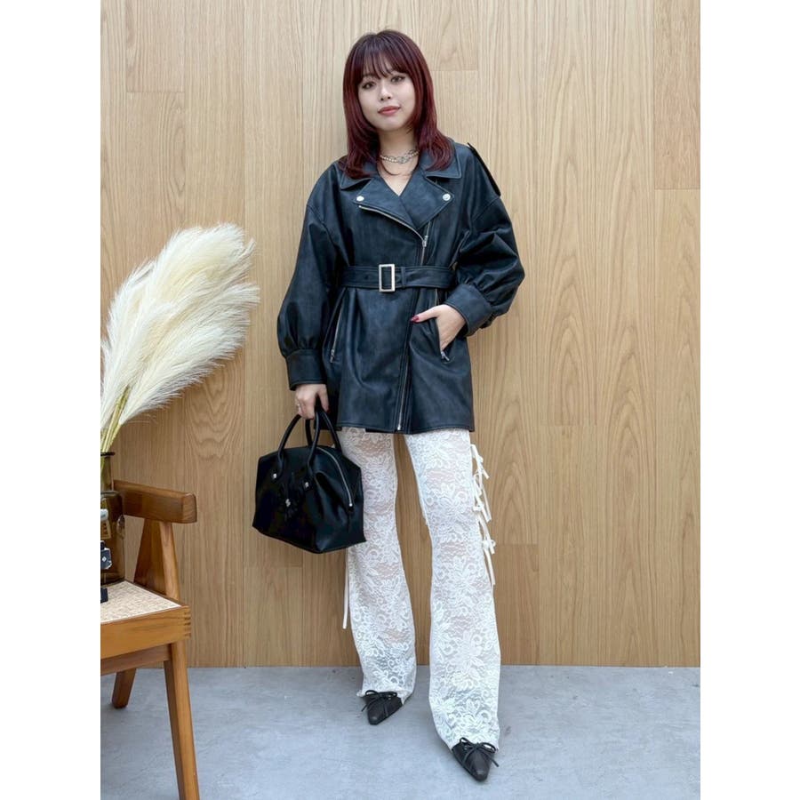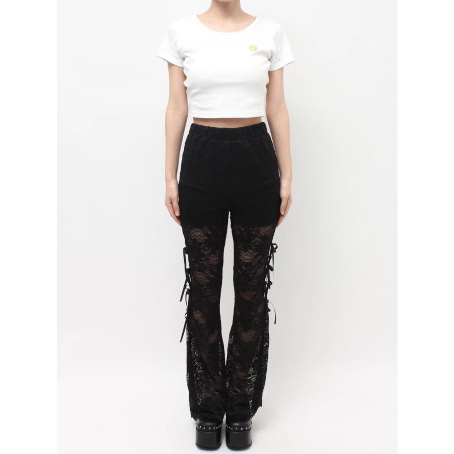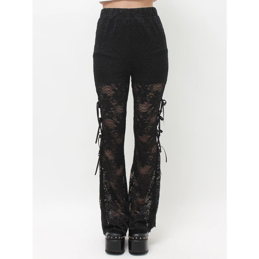 サイドにリボンデザインを入れたレス素材のフレアレギンスです。ウエストはゴム仕様で、レース自体もストレッチ性のある生地なのでストレスフリーに着用できます。裾はスカラップになっており、高見えする素材です。BIGサイズのトップスなどと合わせるとスタイルアップ効果があります。ショートパンツ丈で裏地が付いているため安心して着用できます。