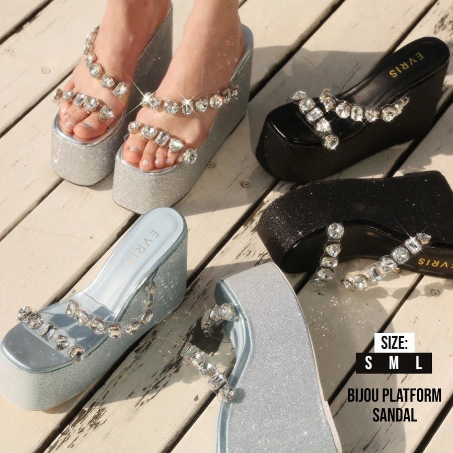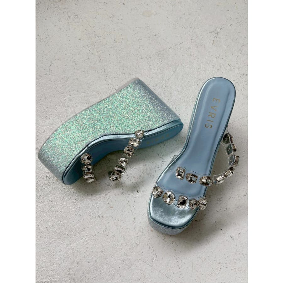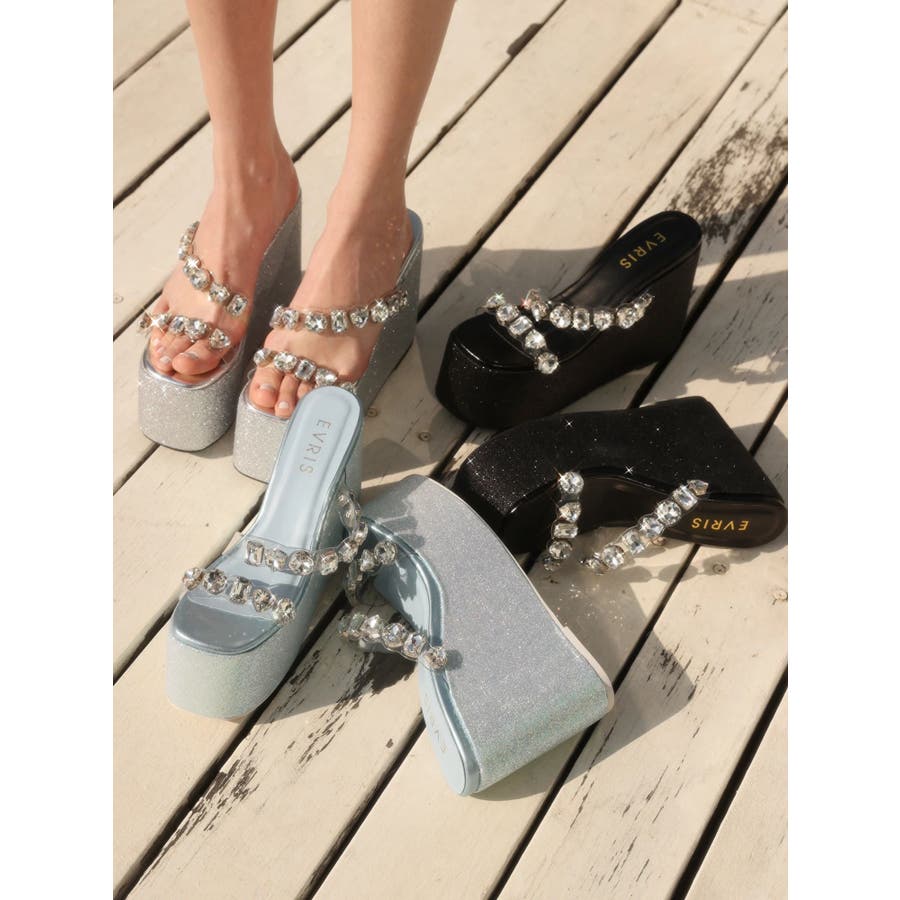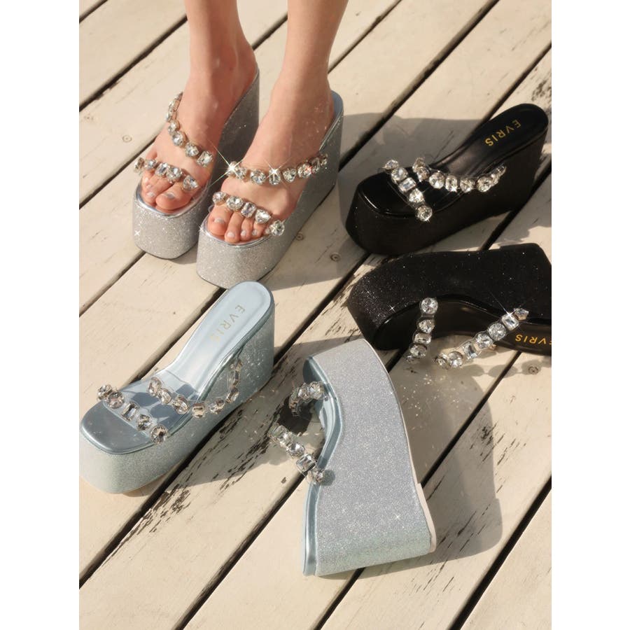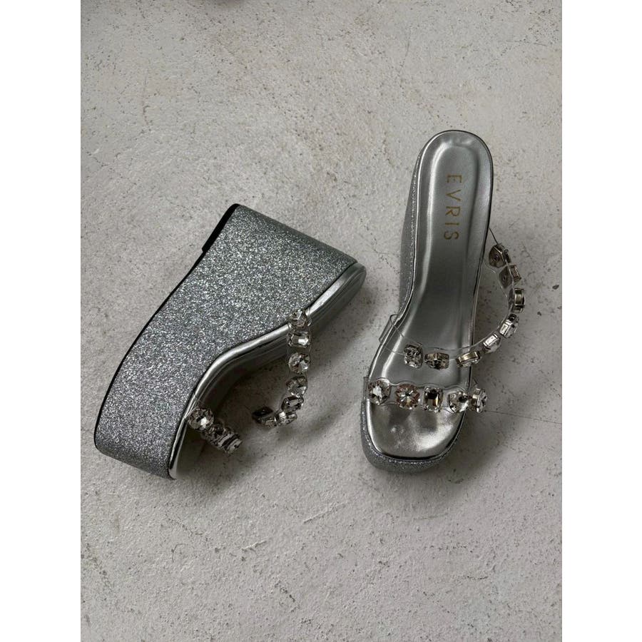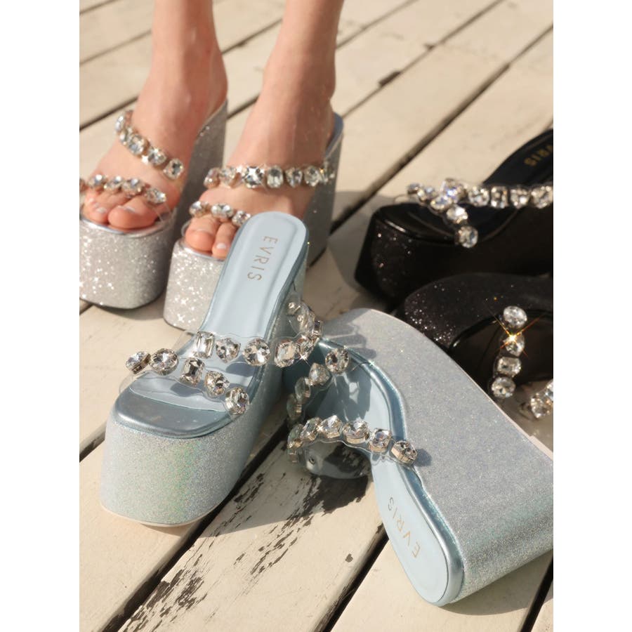 大粒のビジューとラメの素材でインパクト大なEVRISにしかないデザインのサンダルです。