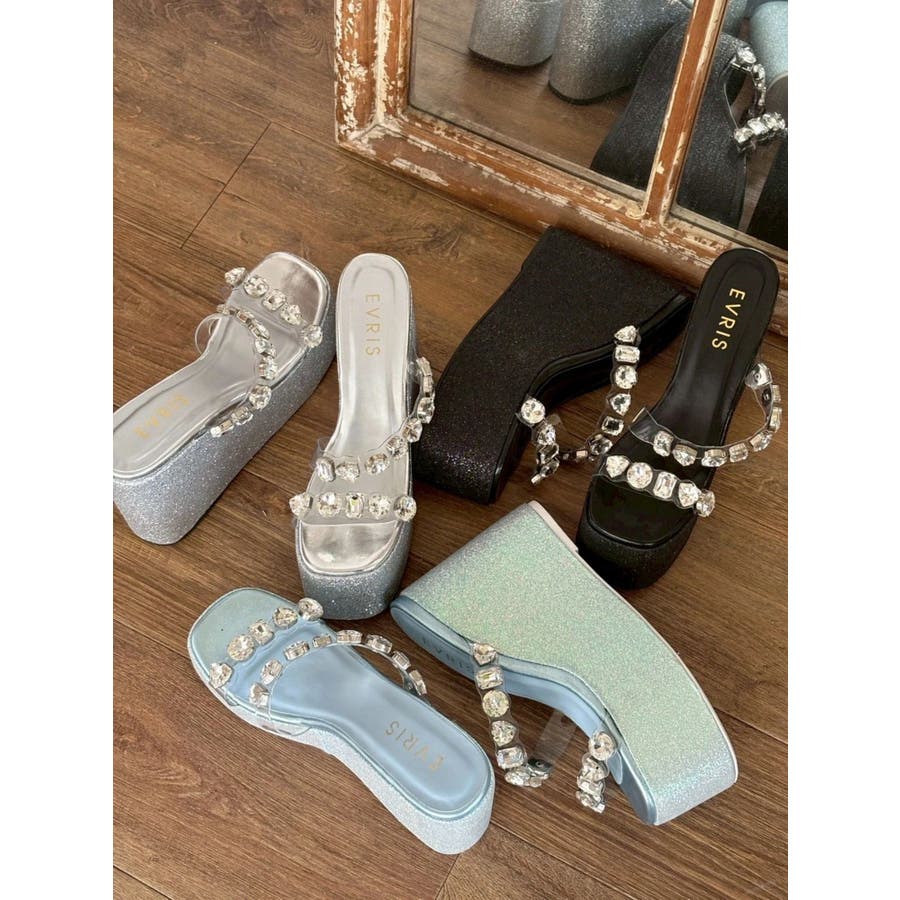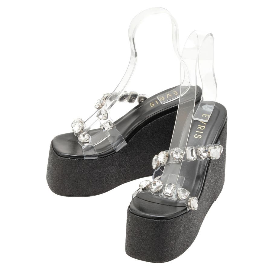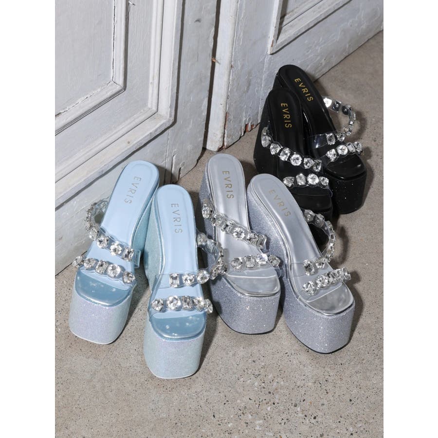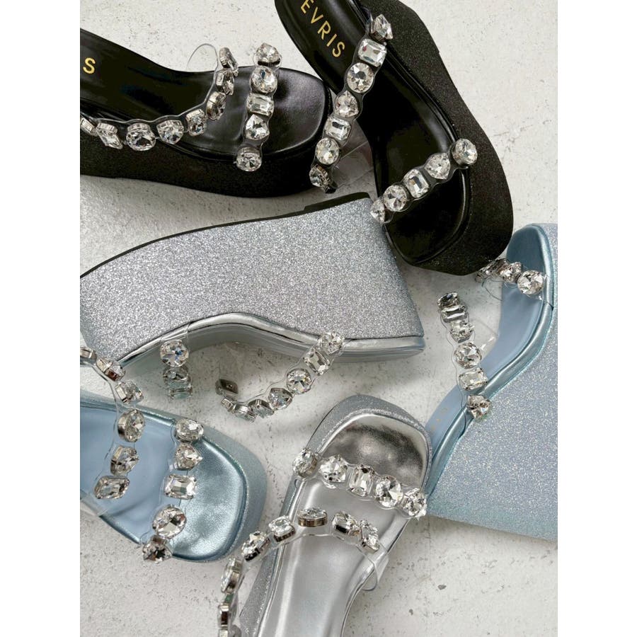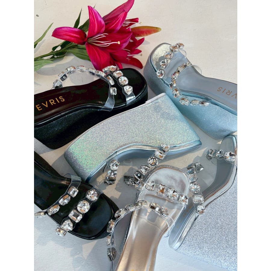 大粒のビジューとラメの素材でインパクト大なEVRISにしかないデザインのサンダルです。