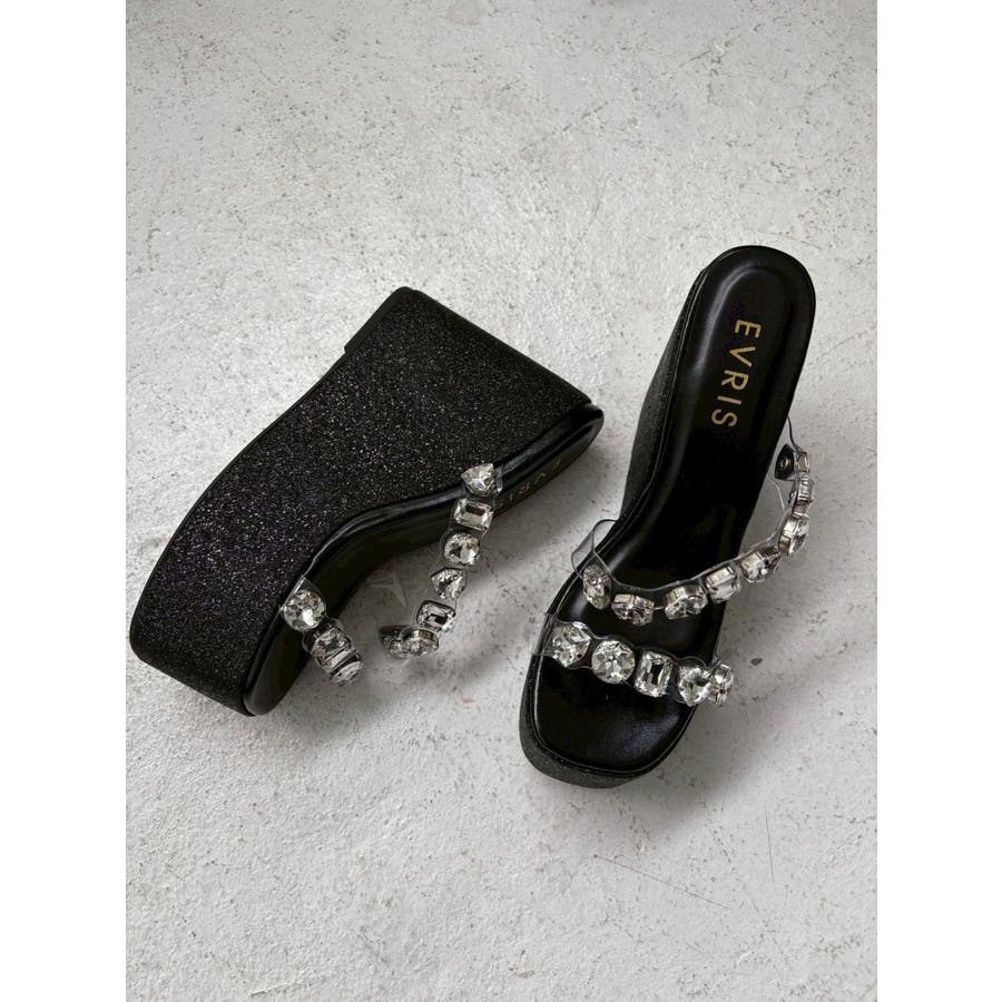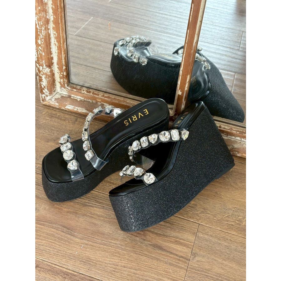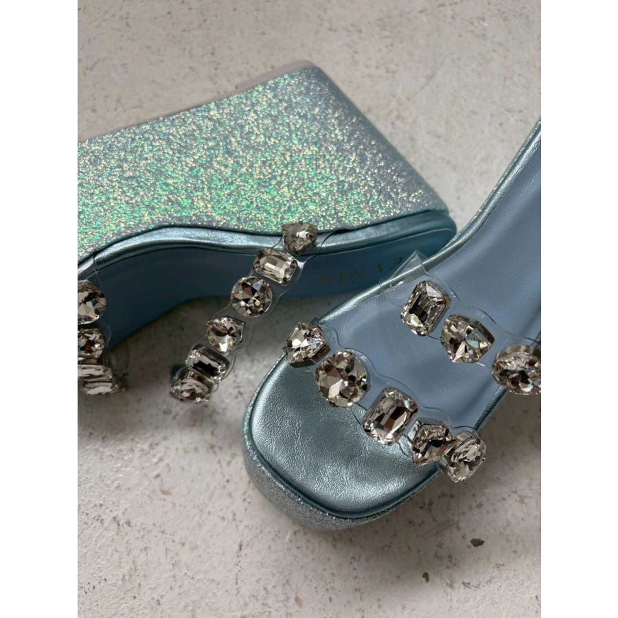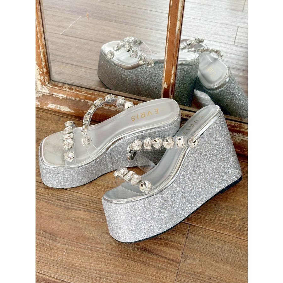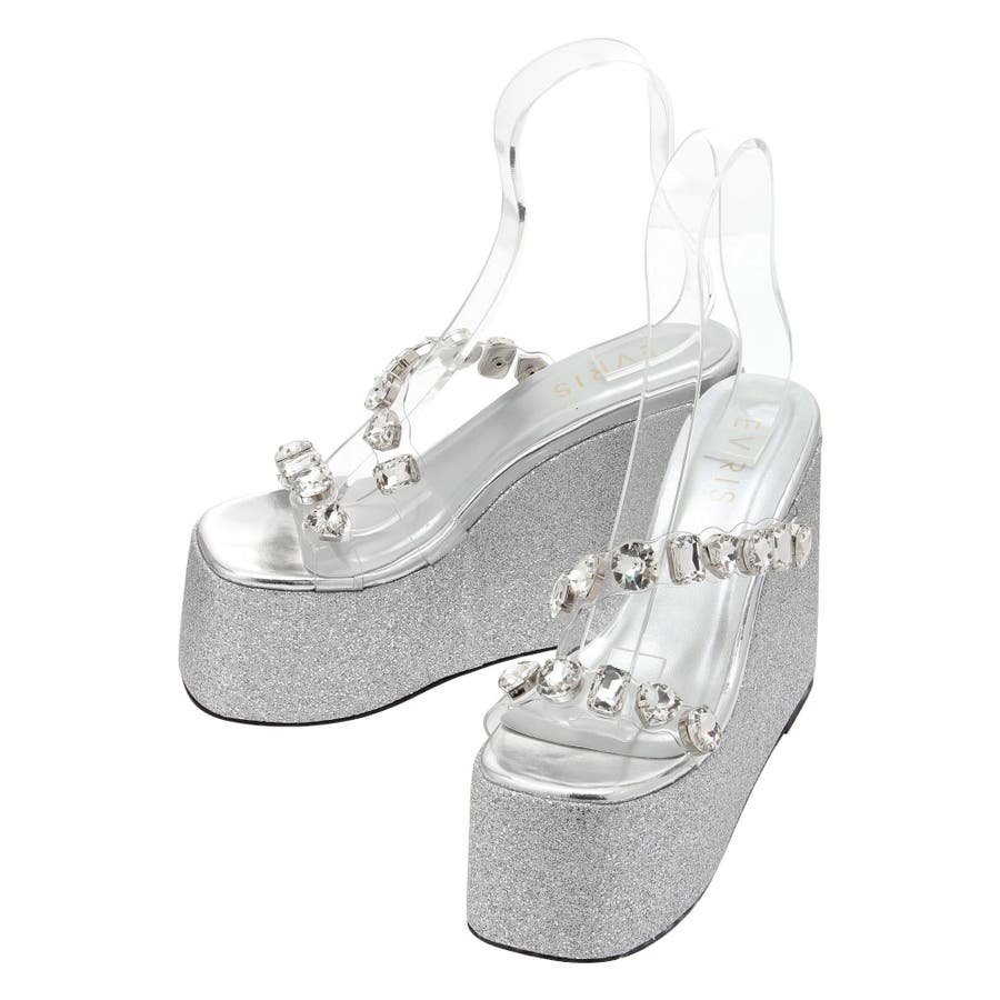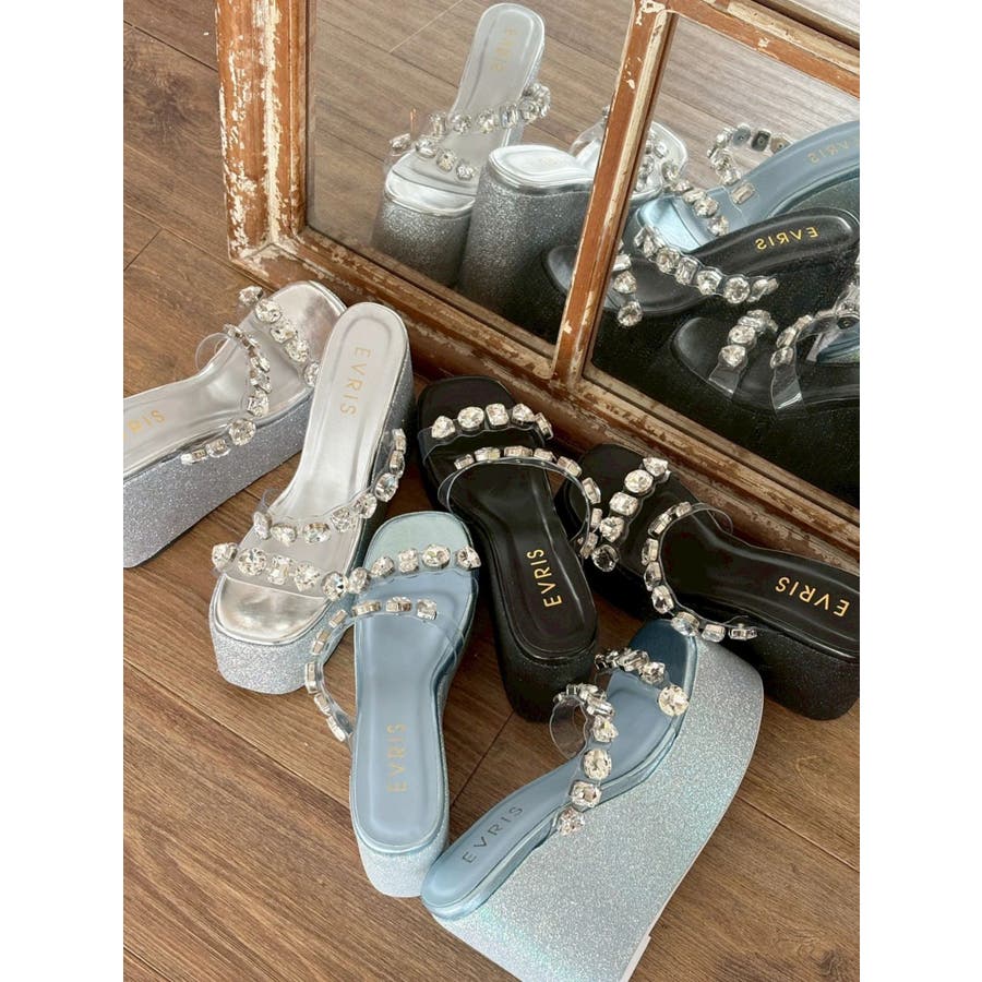 大粒のビジューとラメの素材でインパクト大なEVRISにしかないデザインのサンダルです。