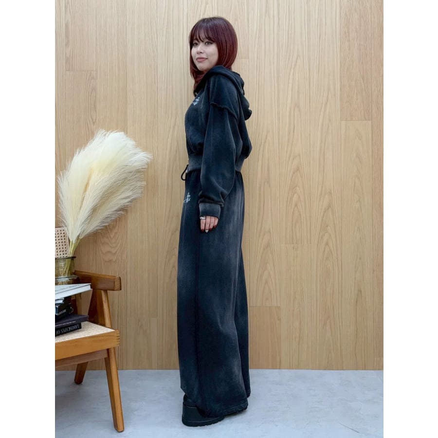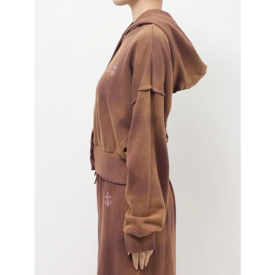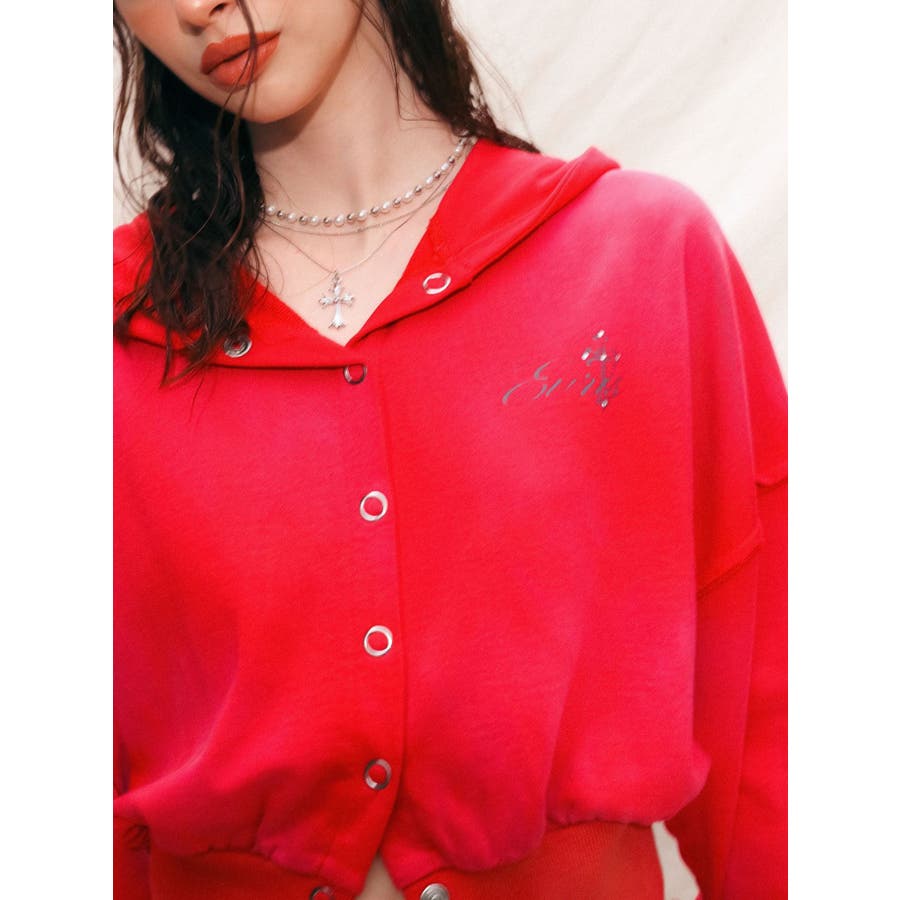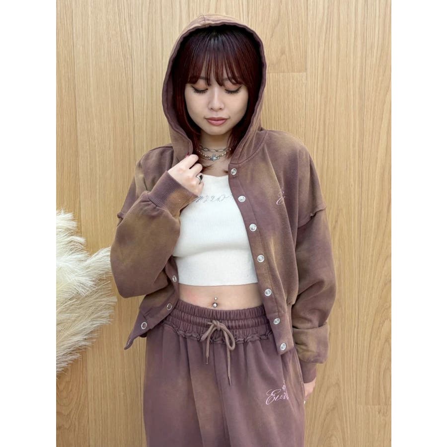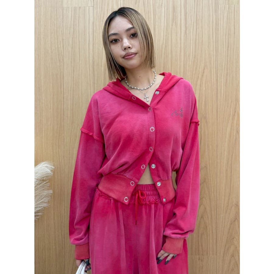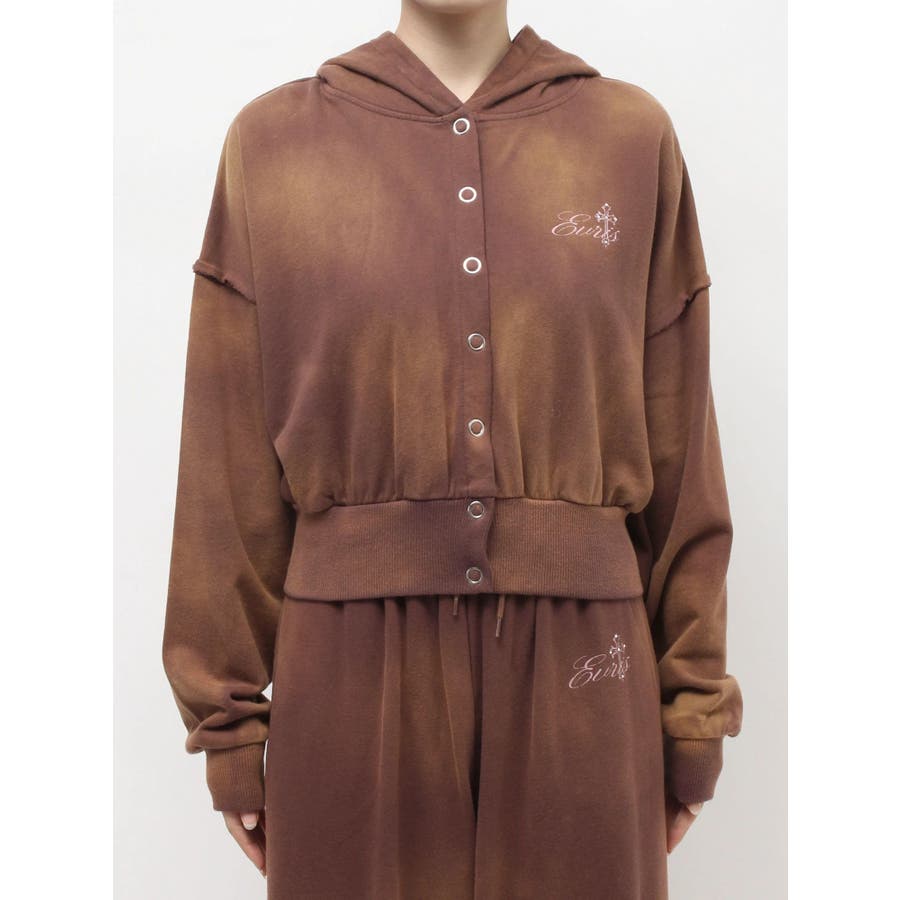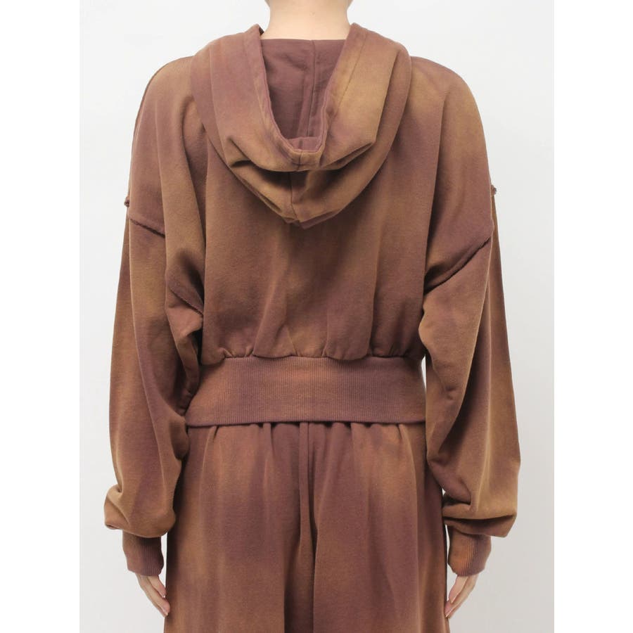 パウダー加工を施した、裏毛のフード付きスウェットトップスです。前身はスナップボタン仕様で、すべて閉じると裾リブがウエストにフィットし、メリハリのあるシルエットになります。存在感のある加工カラーなので、羽織のインナーとしても存在感のある1枚です。左胸のオリジナルブランドロゴもさりげないポイントです。