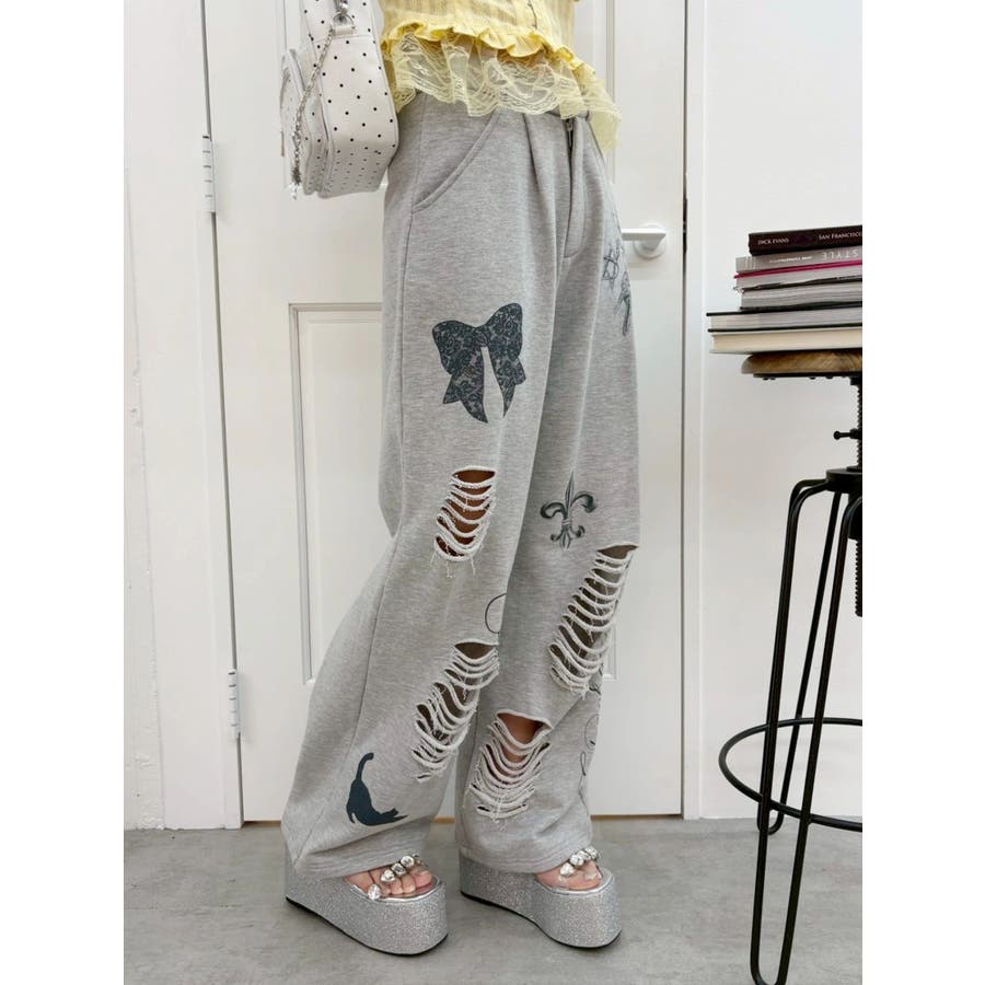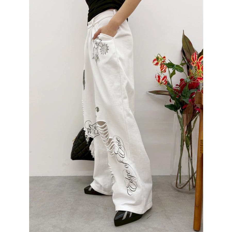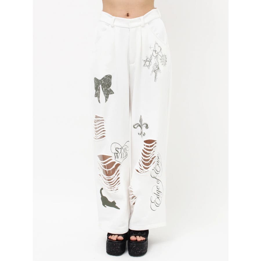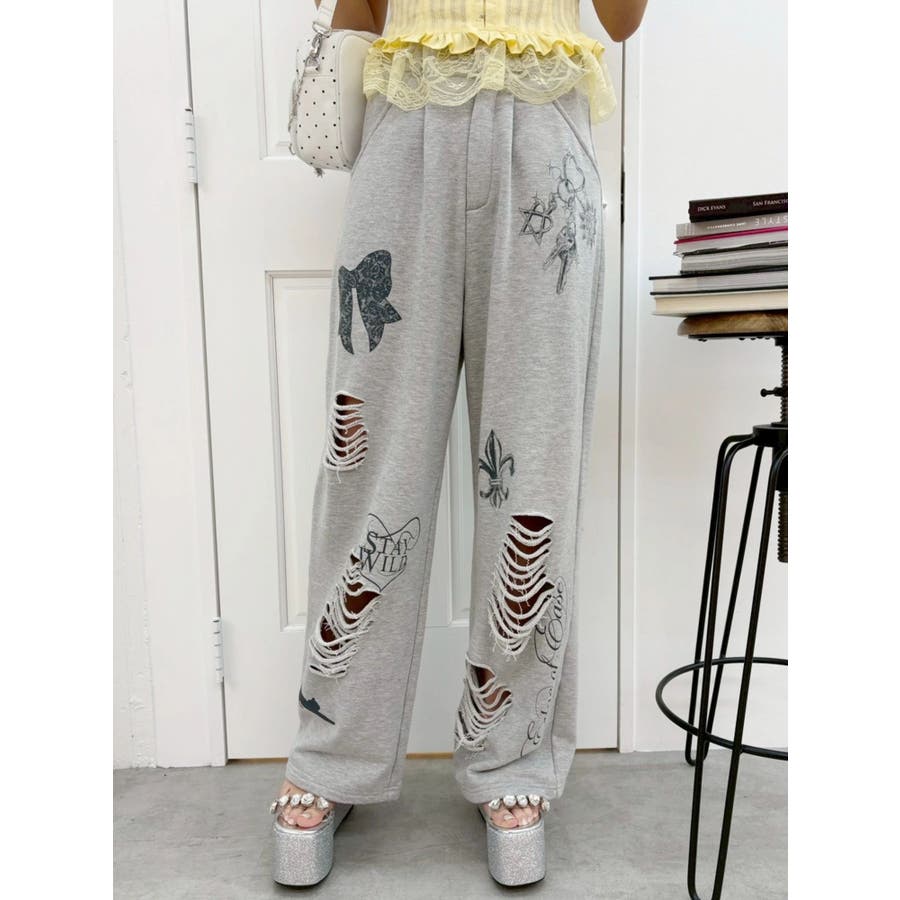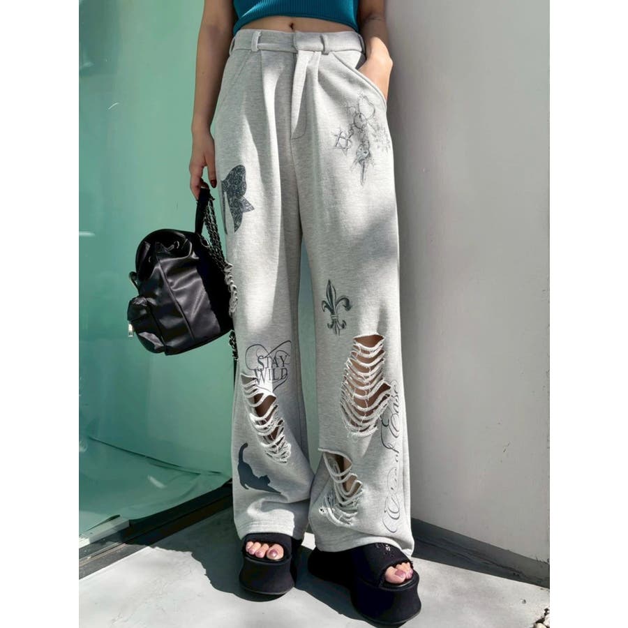 ■デザイン 冬に人気だったグラフィック入りスウェットパンツを裏毛素材に変更し夏仕様へバージョンアップ。一部グラフィックを変更し、新鮮な印象のデザインに仕上げました。ダメージ加工を施すことで通気性も良く、夏でも涼しく着用できる1本です。■スタイリング カジュアルになりすぎないようデザイン性のあるトップスあわせがおすすめ。-------------- 透け感:なし 裏地:なし 生地の厚み:普通 伸縮性:ややあり--------------