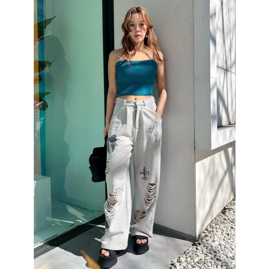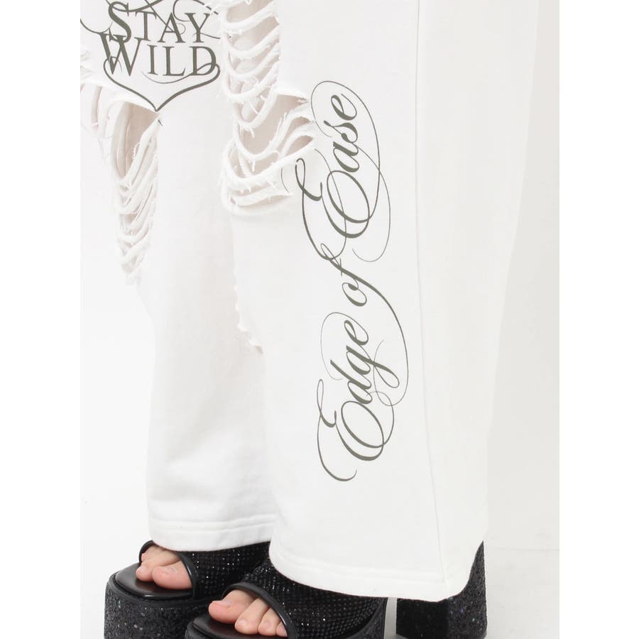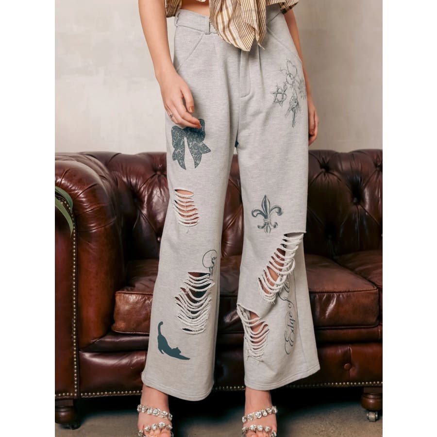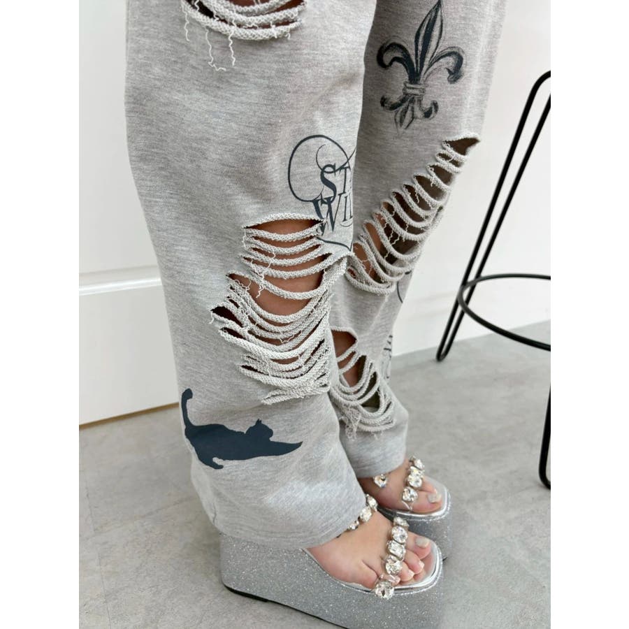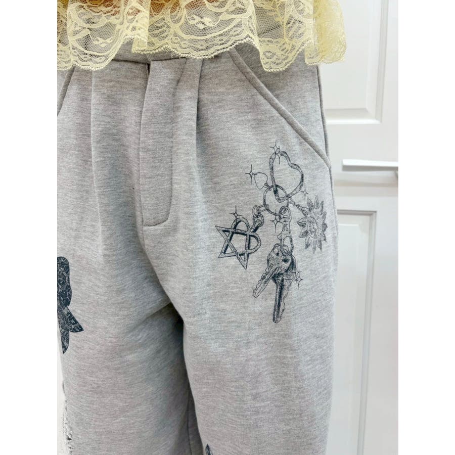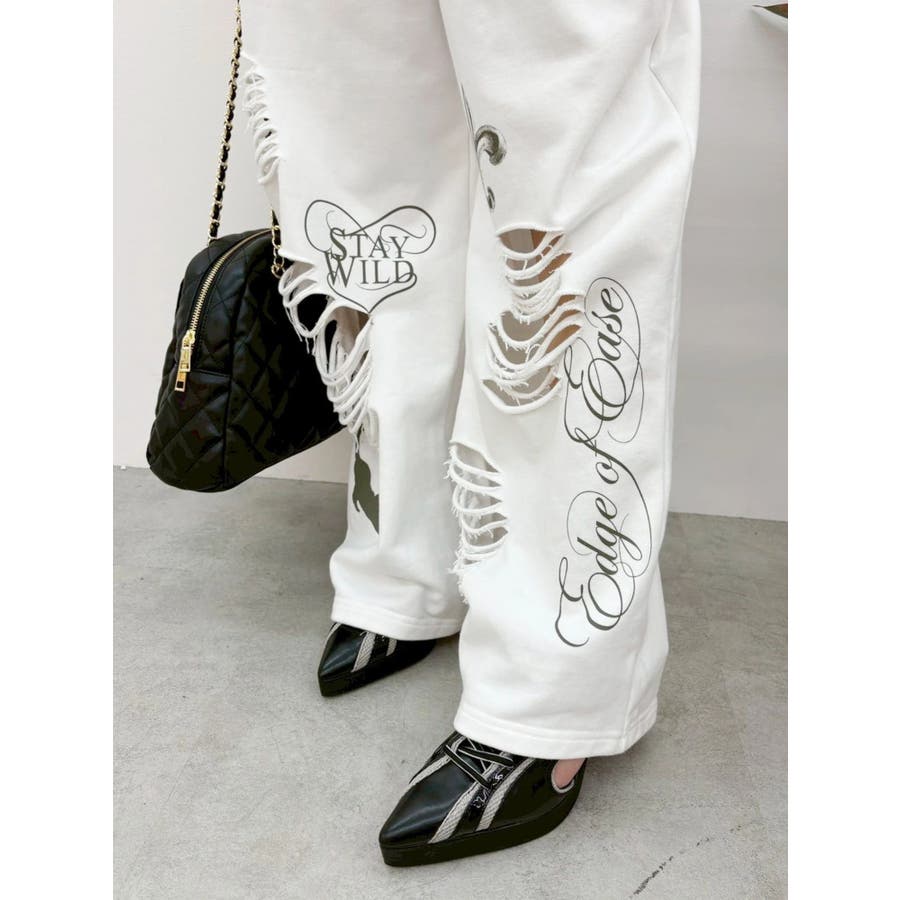 ■デザイン 冬に人気だったグラフィック入りスウェットパンツを裏毛素材に変更し夏仕様へバージョンアップ。一部グラフィックを変更し、新鮮な印象のデザインに仕上げました。ダメージ加工を施すことで通気性も良く、夏でも涼しく着用できる1本です。■スタイリング カジュアルになりすぎないようデザイン性のあるトップスあわせがおすすめ。-------------- 透け感:なし 裏地:なし 生地の厚み:普通 伸縮性:ややあり--------------