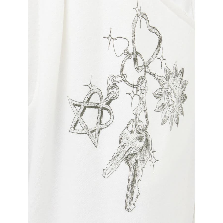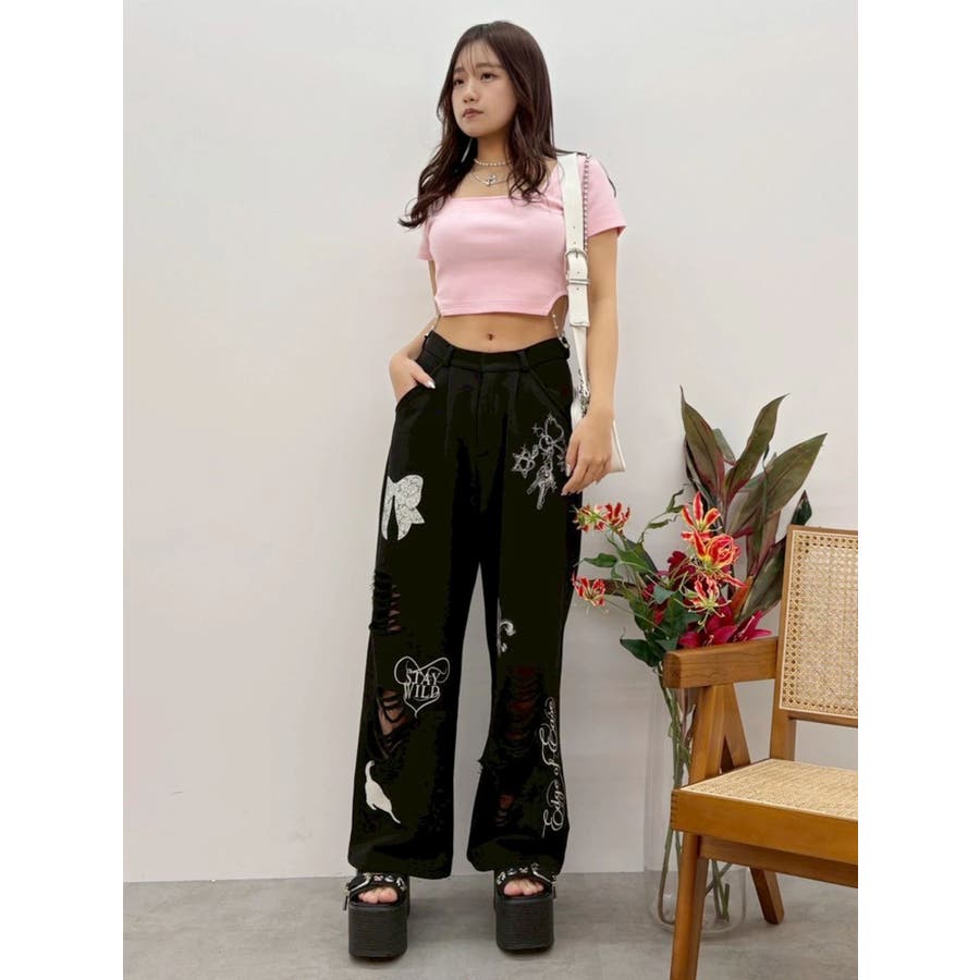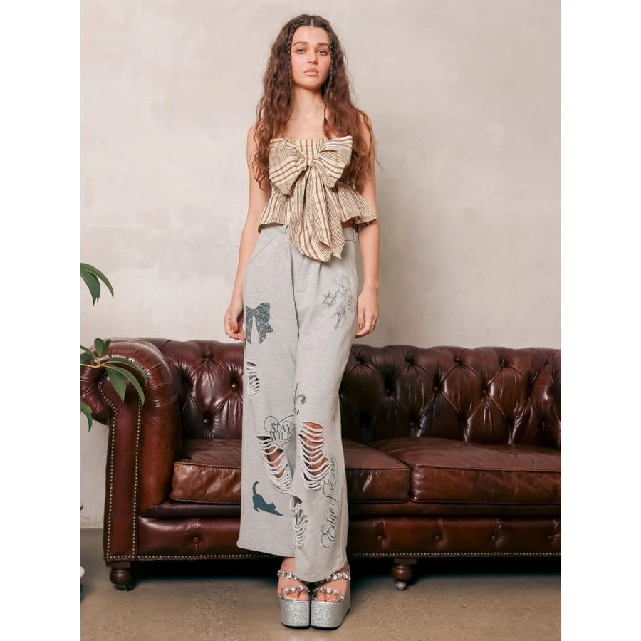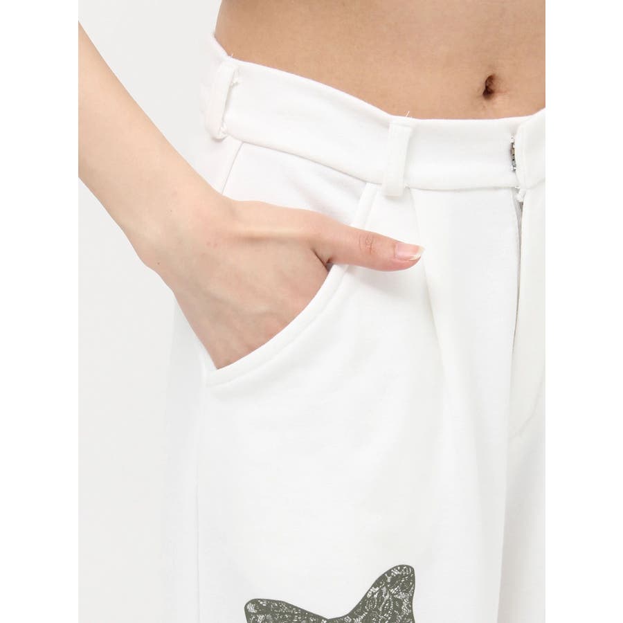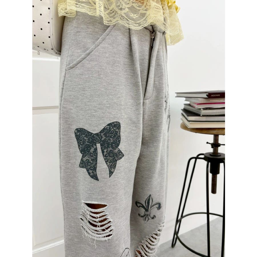 ■デザイン 冬に人気だったグラフィック入りスウェットパンツを裏毛素材に変更し夏仕様へバージョンアップ。一部グラフィックを変更し、新鮮な印象のデザインに仕上げました。ダメージ加工を施すことで通気性も良く、夏でも涼しく着用できる1本です。■スタイリング カジュアルになりすぎないようデザイン性のあるトップスあわせがおすすめ。-------------- 透け感:なし 裏地:なし 生地の厚み:普通 伸縮性:ややあり--------------
