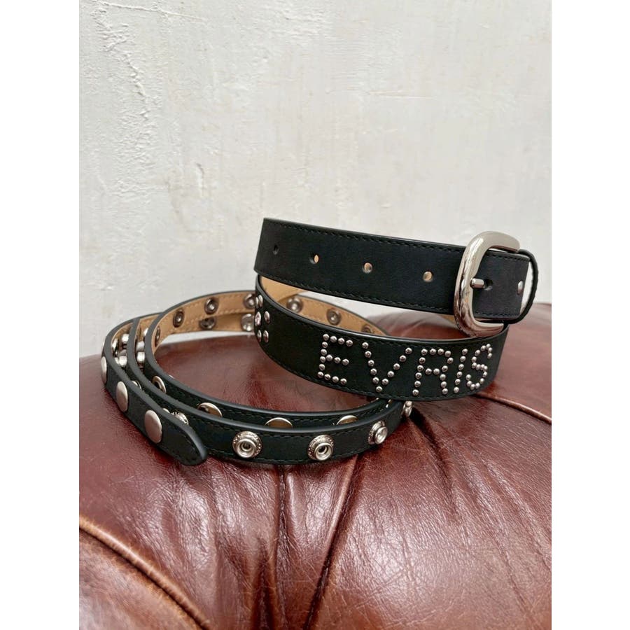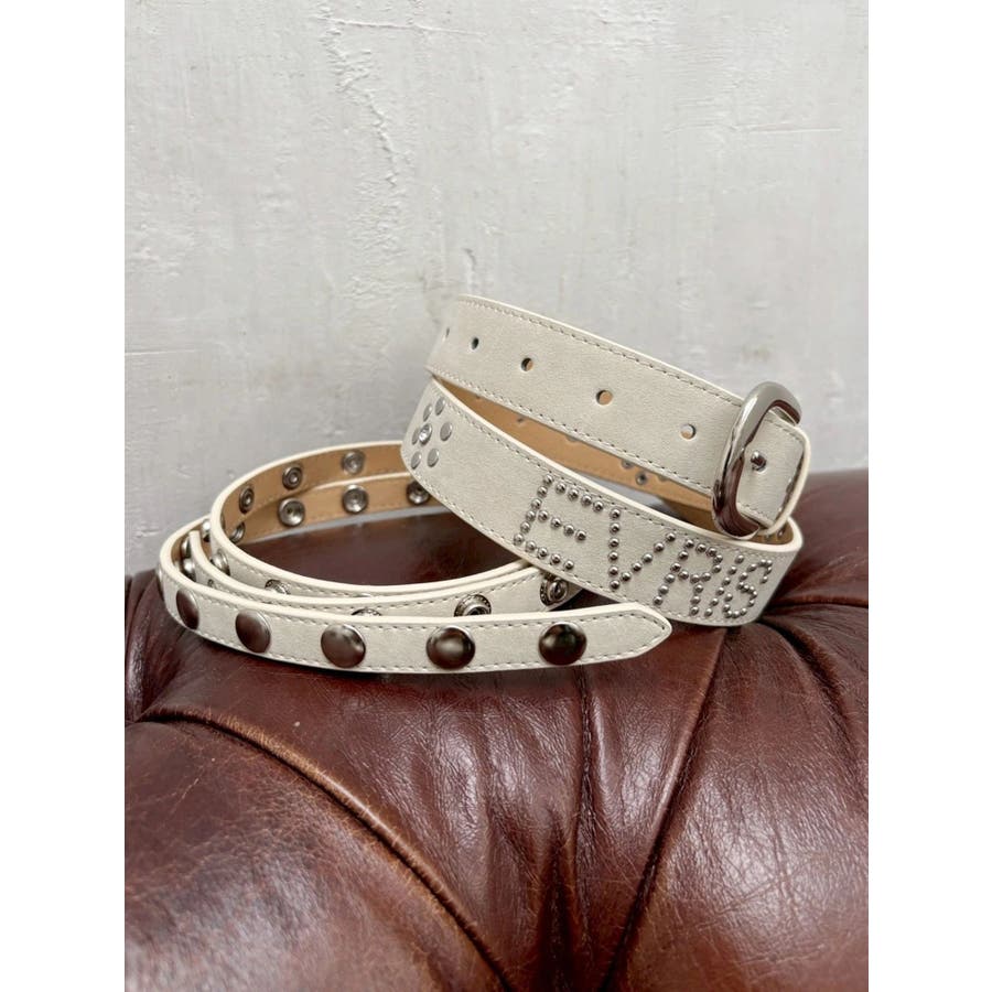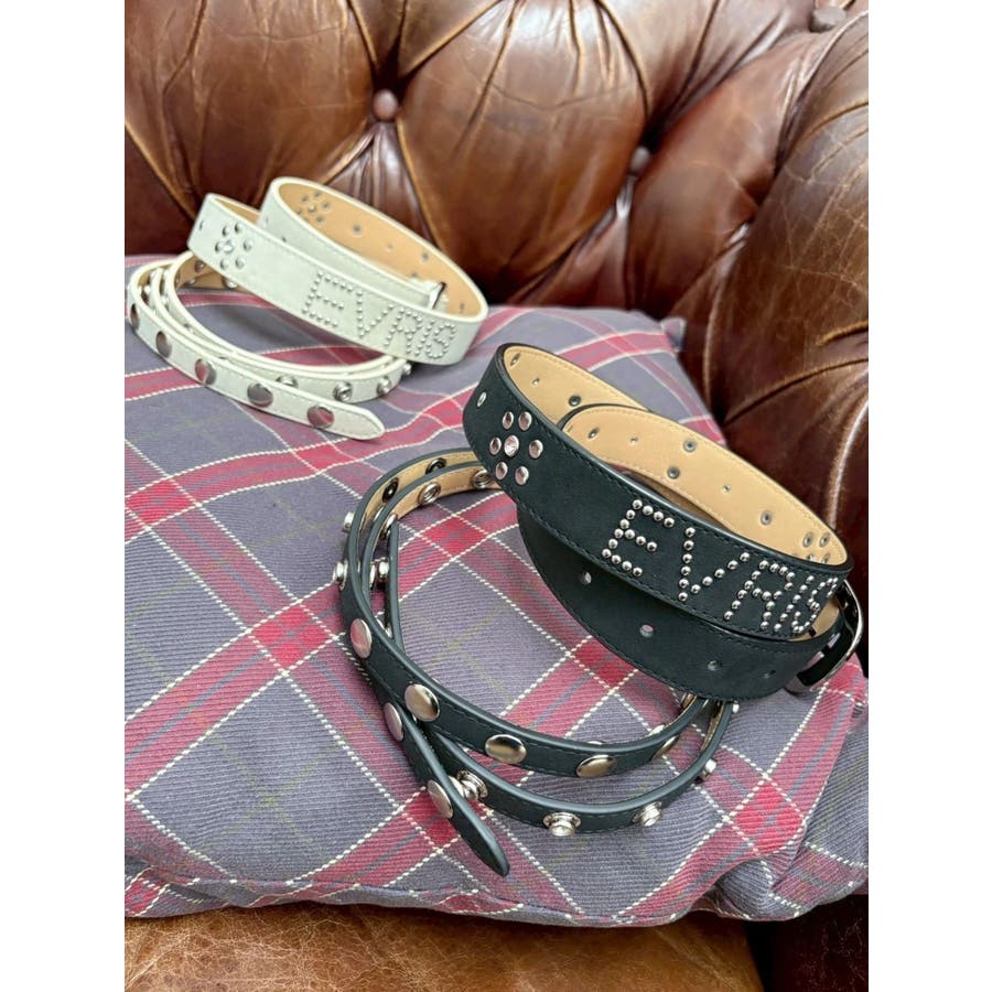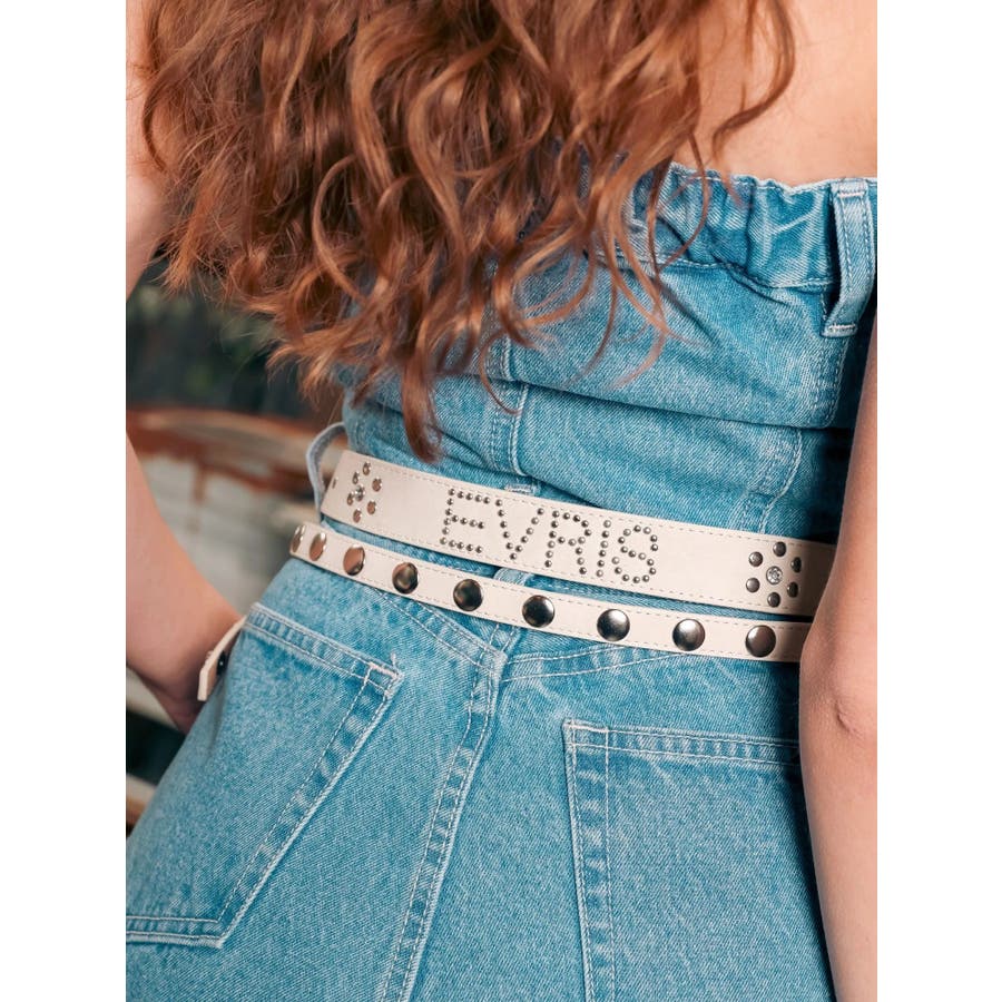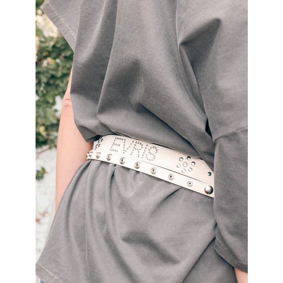 細身ベルトと通常幅ベルトの2本セットのオリジナルデザインのベルトです。スタッズはすべて手打ちによるハンドメイド仕様で1点1点表情のある仕上がりです。太幅ベルトはデザインからスタッズ配置までこだわったスタイリングのアクセントとして活躍するベルト。ウエスト使いはもちろん、ベアトップやデニムオールインワンなどバスト位置に着用する新しいスタイリングもおすすめです。
