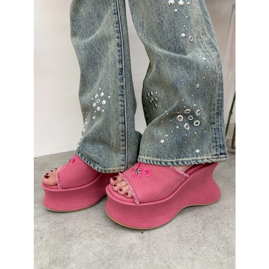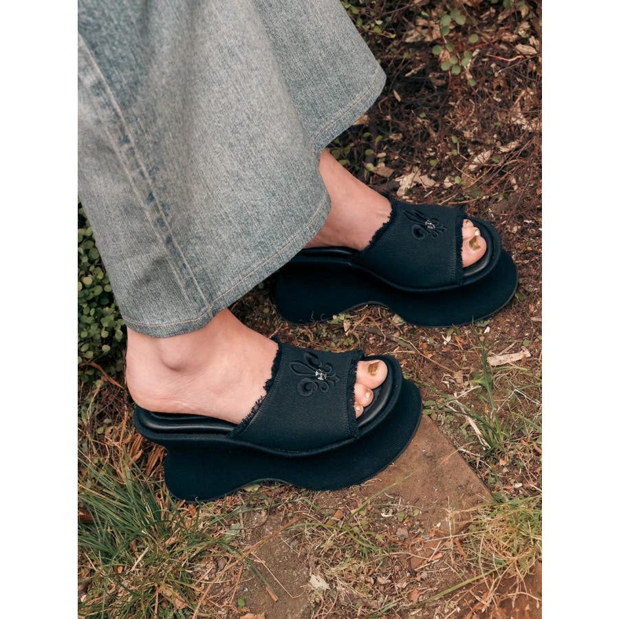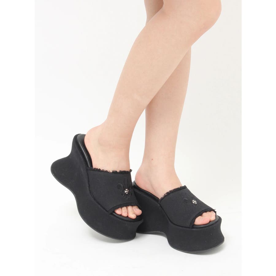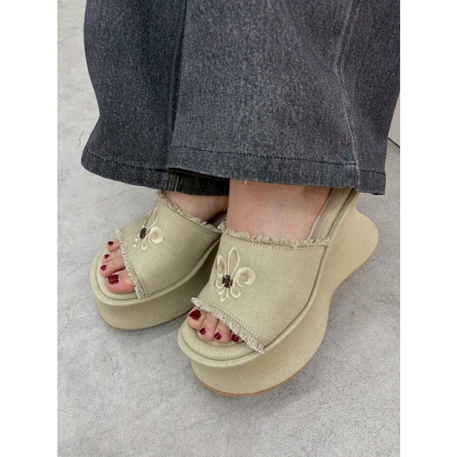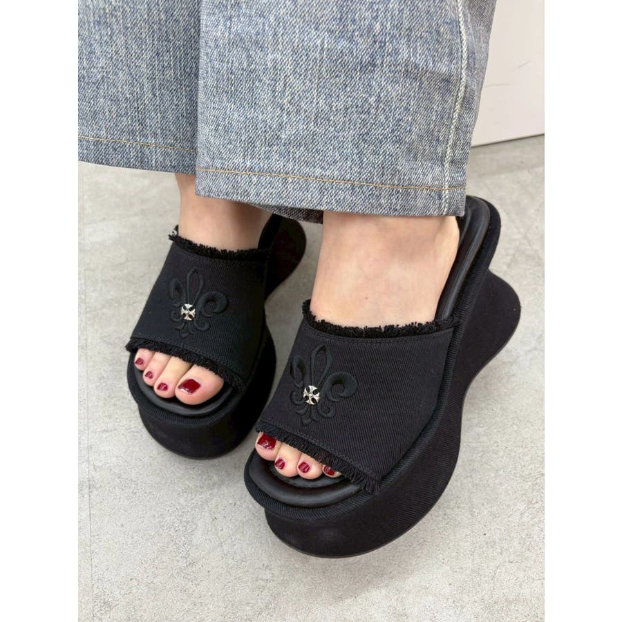 エッジの効いたスタッズとオリジナルの百合モチーフが視線を奪う、主役級厚底サンダル!■デザインボリュームのある変形ソールで盛れる脚長シルエットを演出。コーデの主役になる存在感でシンプルな装いも一気に華やかに。カジュアルなコットン素材にハードなスタッズや百合刺繍を効かせた存在感抜群のデザインです。中敷きにはクッションを入れておりふかふかとした履き心地で足も疲れにくいです。シューズ自体もかなり軽量になっています。■スタイリングシンプルなコーデに合わせるだけで旬のバランスに。変形シルエットもポイントに。フリンジデザインでカジュアルなスタイリングとの相性が抜群。レースやプリーツスカートなど甘めなボトムと合わせた甘辛バランスが◎フェミニンなワンピーススタイルにエッジを効かせるアクセントとしても◎■ヒール高さS/ヒール10.9cm ストーム5.6cmM/ヒール11.1cm ストーム5.7cmL/ヒール11.3cm ストーム5.8cm
