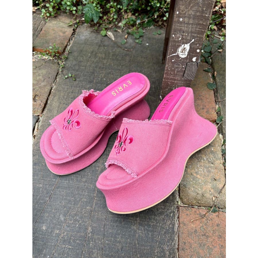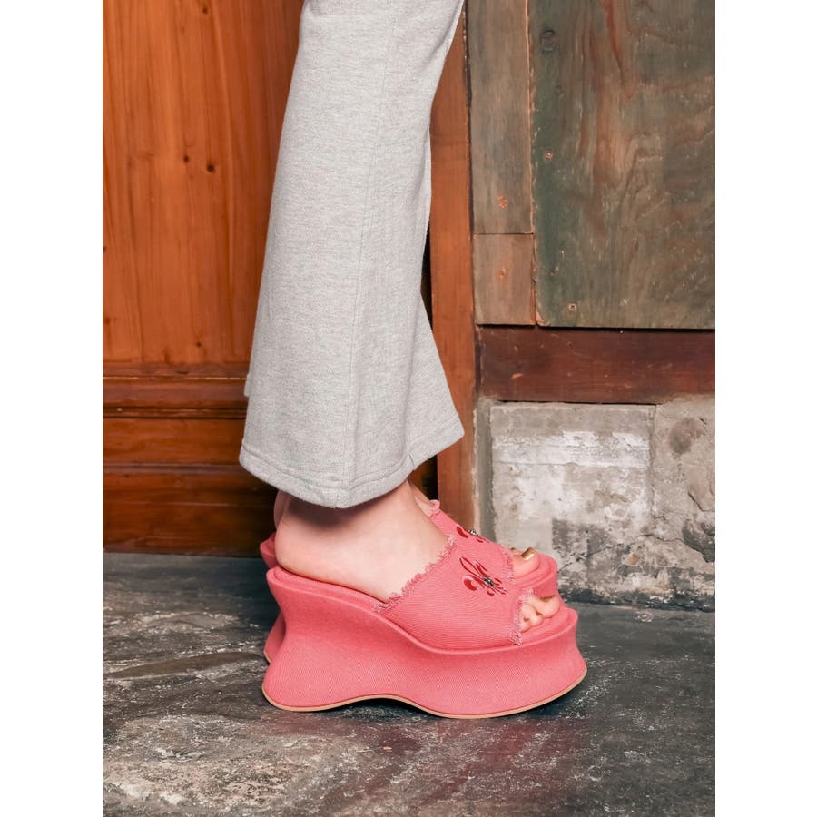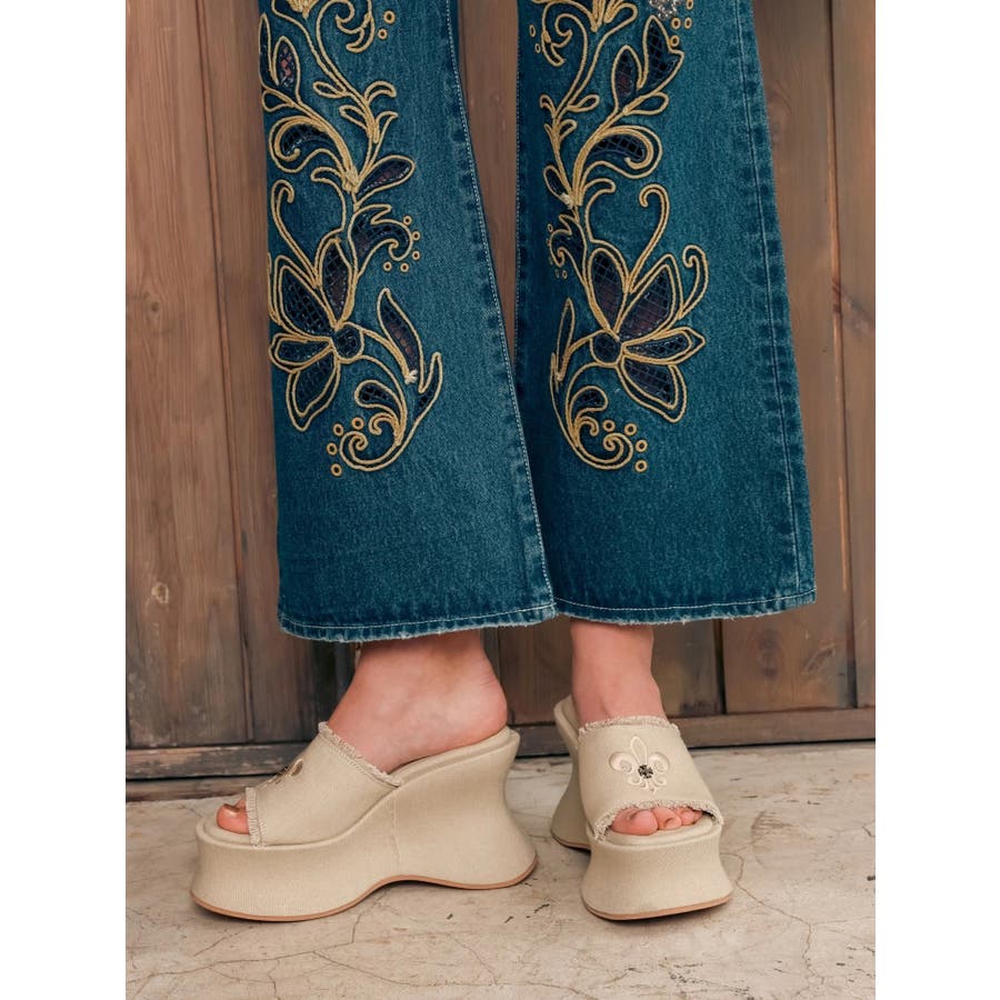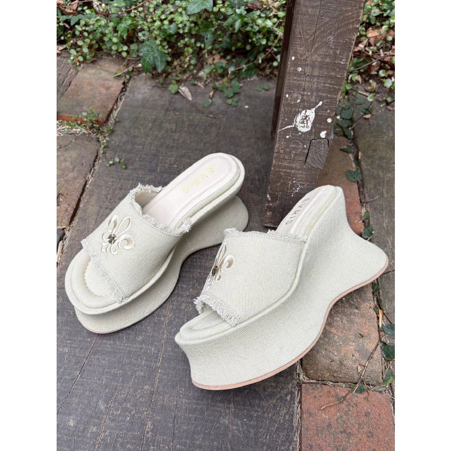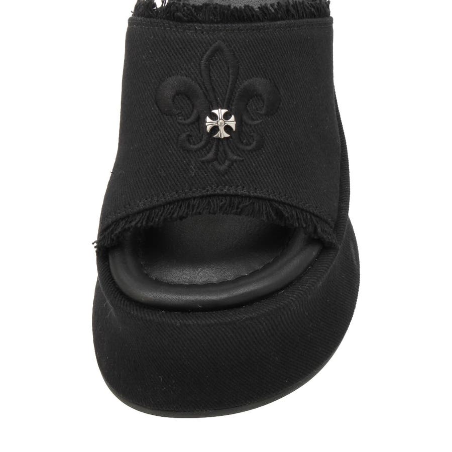 エッジの効いたスタッズとオリジナルの百合モチーフが視線を奪う、主役級厚底サンダル!■デザインボリュームのある変形ソールで盛れる脚長シルエットを演出。コーデの主役になる存在感でシンプルな装いも一気に華やかに。カジュアルなコットン素材にハードなスタッズや百合刺繍を効かせた存在感抜群のデザインです。中敷きにはクッションを入れておりふかふかとした履き心地で足も疲れにくいです。シューズ自体もかなり軽量になっています。■スタイリングシンプルなコーデに合わせるだけで旬のバランスに。変形シルエットもポイントに。フリンジデザインでカジュアルなスタイリングとの相性が抜群。レースやプリーツスカートなど甘めなボトムと合わせた甘辛バランスが◎フェミニンなワンピーススタイルにエッジを効かせるアクセントとしても◎■ヒール高さS/ヒール10.9cm ストーム5.6cmM/ヒール11.1cm ストーム5.7cmL/ヒール11.3cm ストーム5.8cm