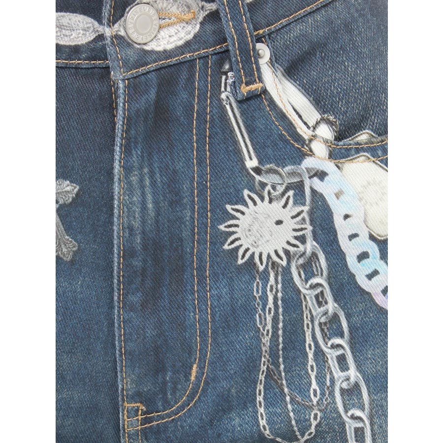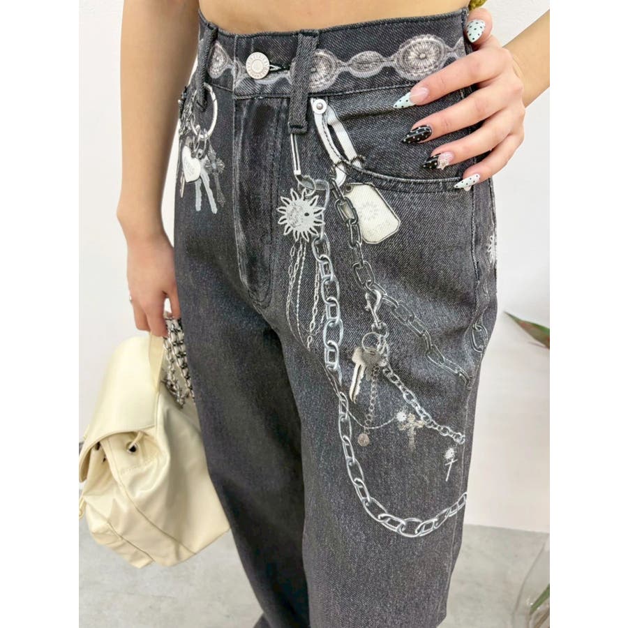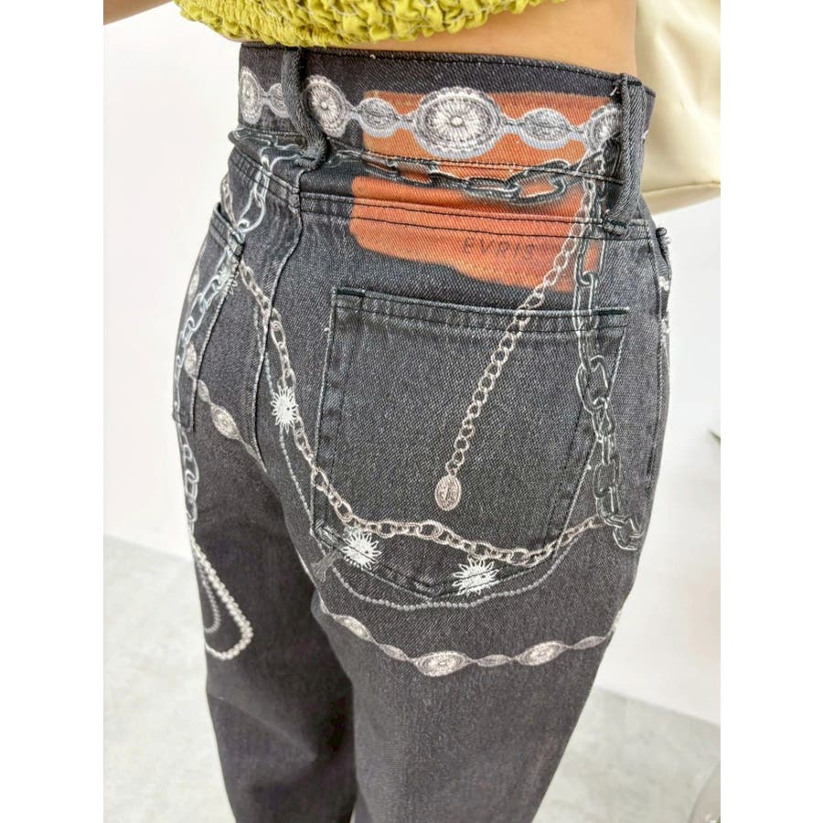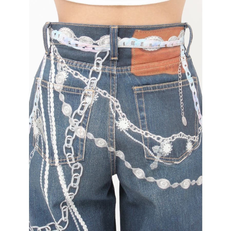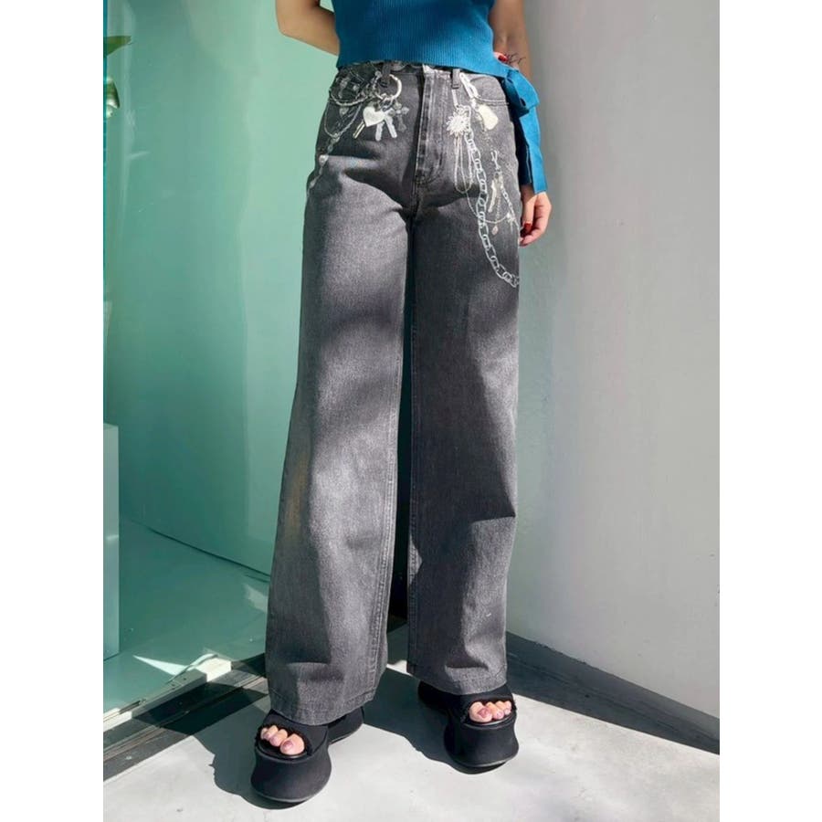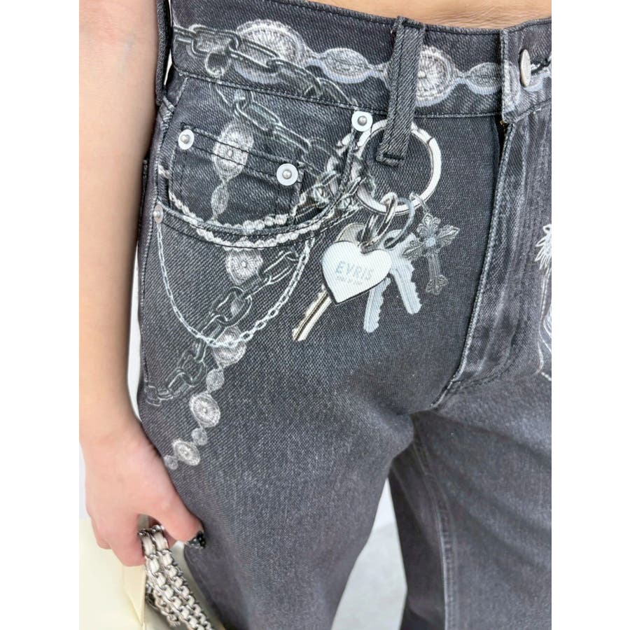 ■デザイン デニム風のプリントを施したインパクトのあるワイドパンツ。デニムやチャームなど全てEVRISオリジナルのグラフィックを入れているため他にはない1枚に仕上がっています。プリントの色はデニムのカラーごとに変えているのもポイント。デニム素材ではないため、軽めの素材で夏にも履きやすい生地感です。■スタイリング シンプルなトップスを合わせるだけでも主役級に仕上がるボトム。柄物やカラーアイテムとの相性も抜群でオシャレな格上げコーディネートが完成します。-------------- 透け感:なし 裏地:なし 生地の厚み:普通 伸縮性:なし --------------