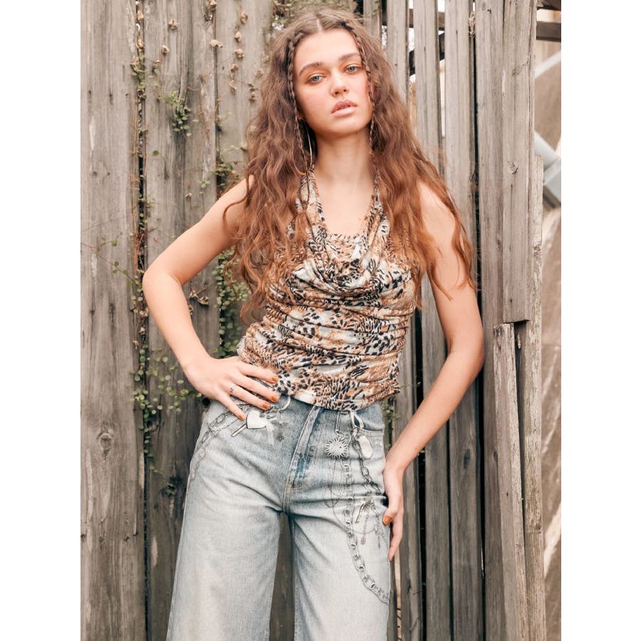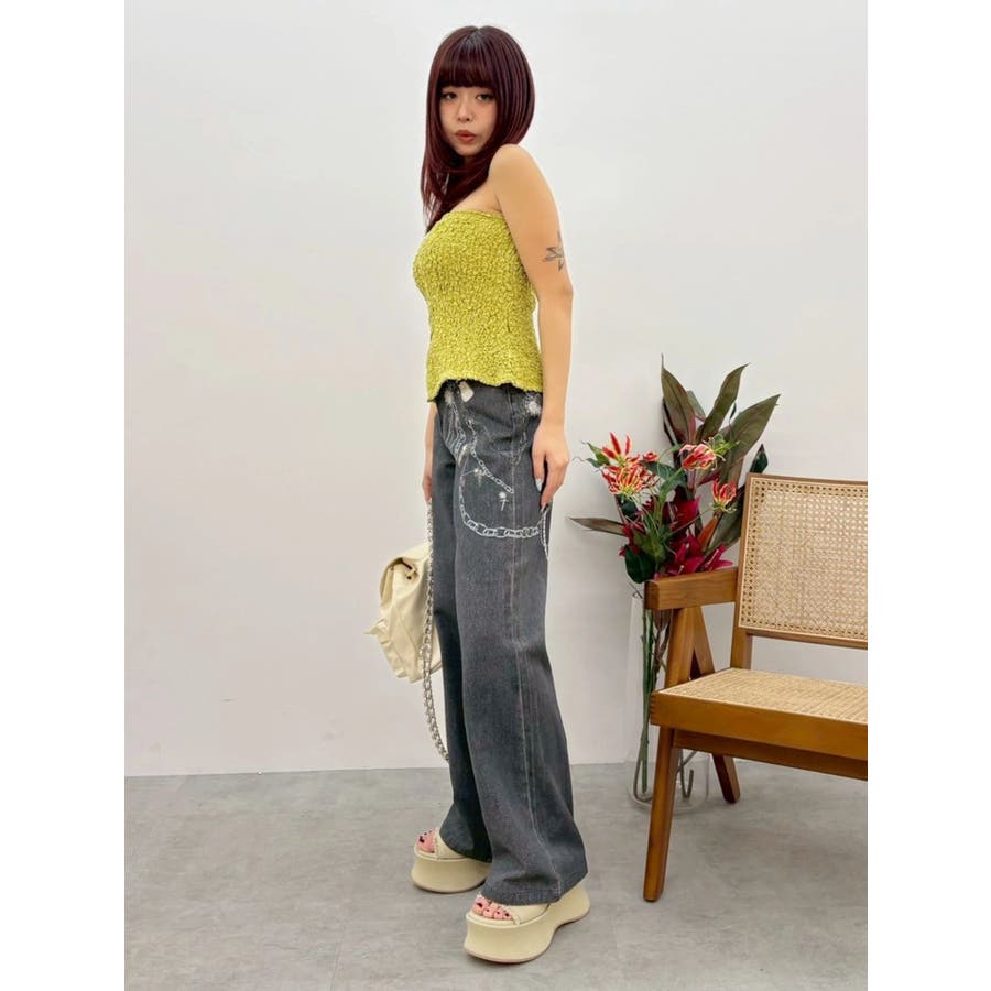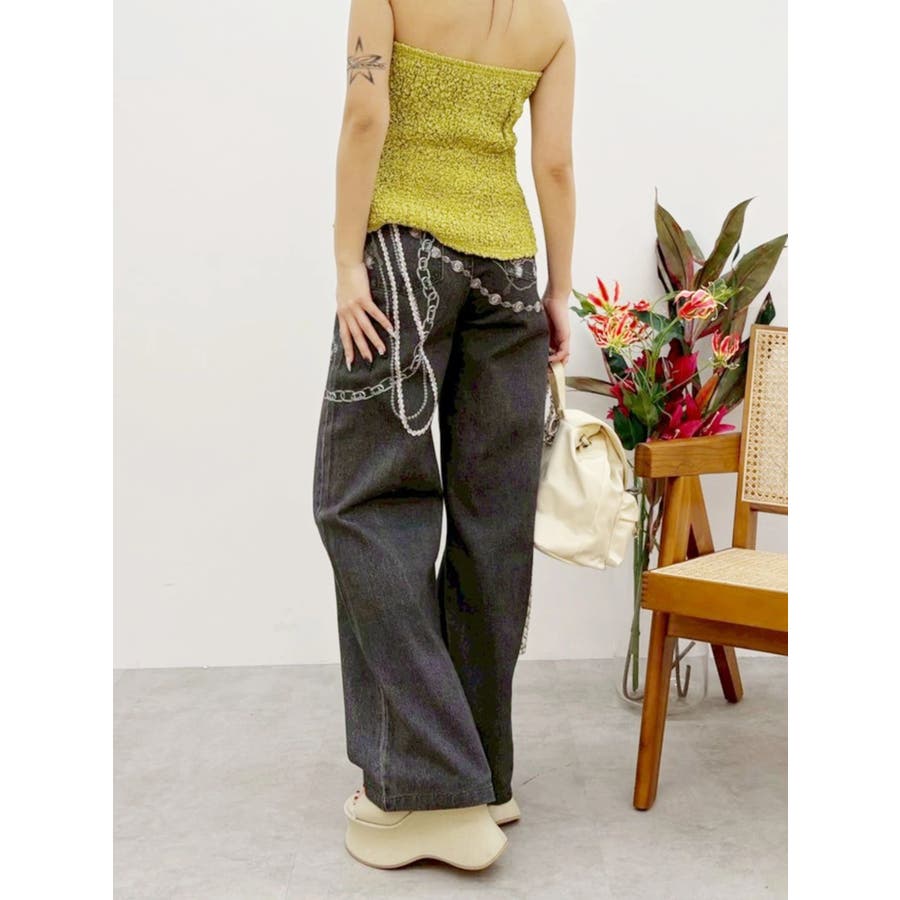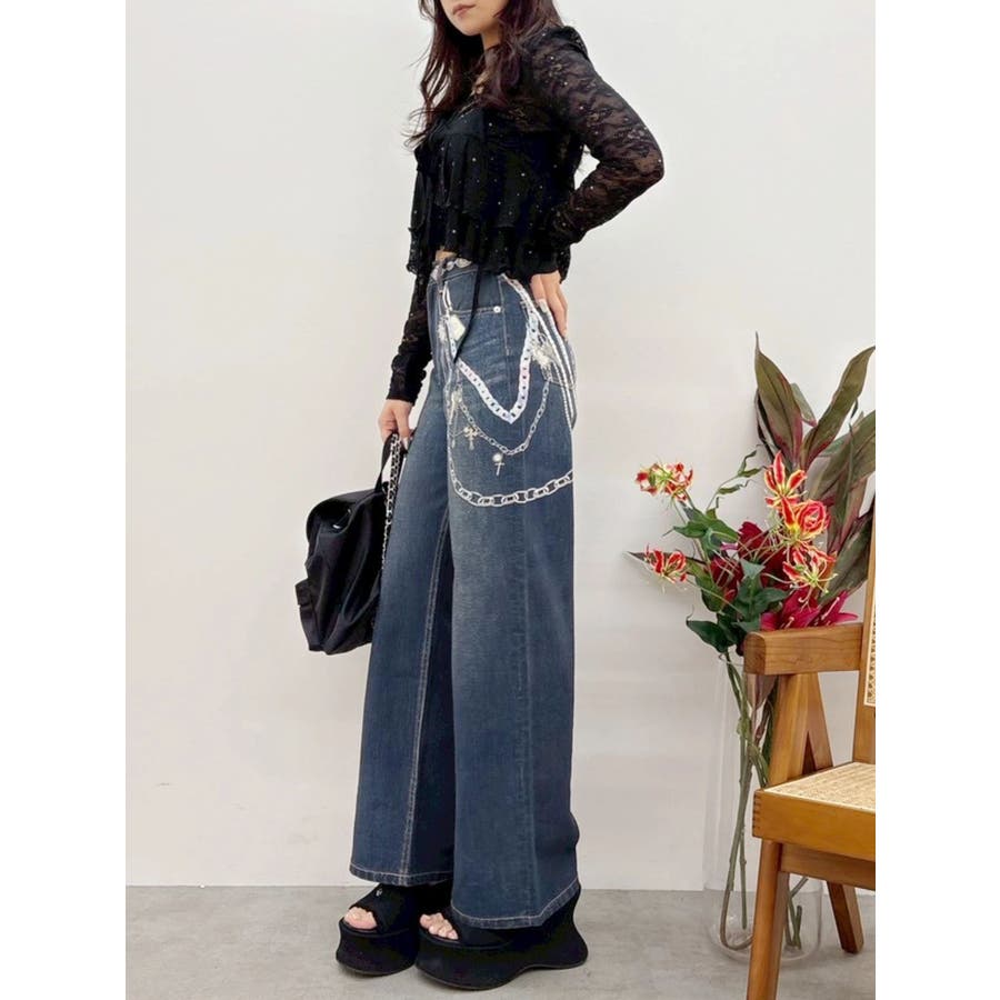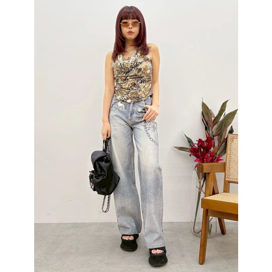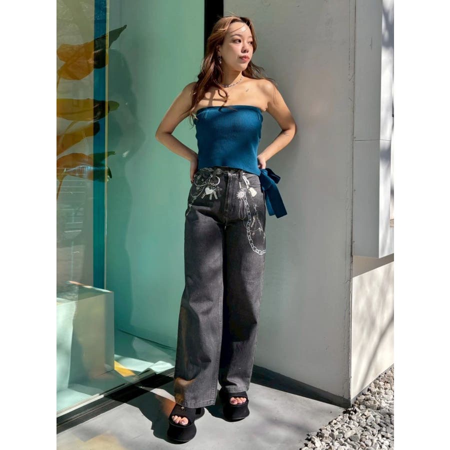 ■デザイン デニム風のプリントを施したインパクトのあるワイドパンツ。デニムやチャームなど全てEVRISオリジナルのグラフィックを入れているため他にはない1枚に仕上がっています。プリントの色はデニムのカラーごとに変えているのもポイント。デニム素材ではないため、軽めの素材で夏にも履きやすい生地感です。■スタイリング シンプルなトップスを合わせるだけでも主役級に仕上がるボトム。柄物やカラーアイテムとの相性も抜群でオシャレな格上げコーディネートが完成します。-------------- 透け感:なし 裏地:なし 生地の厚み:普通 伸縮性:なし --------------