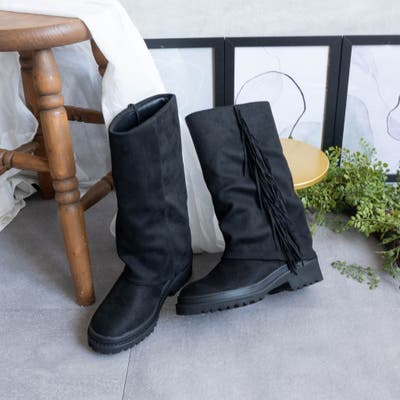 動くたびに揺れるフリンジが目を引く、存在感たっぷりのミドルブーツ。