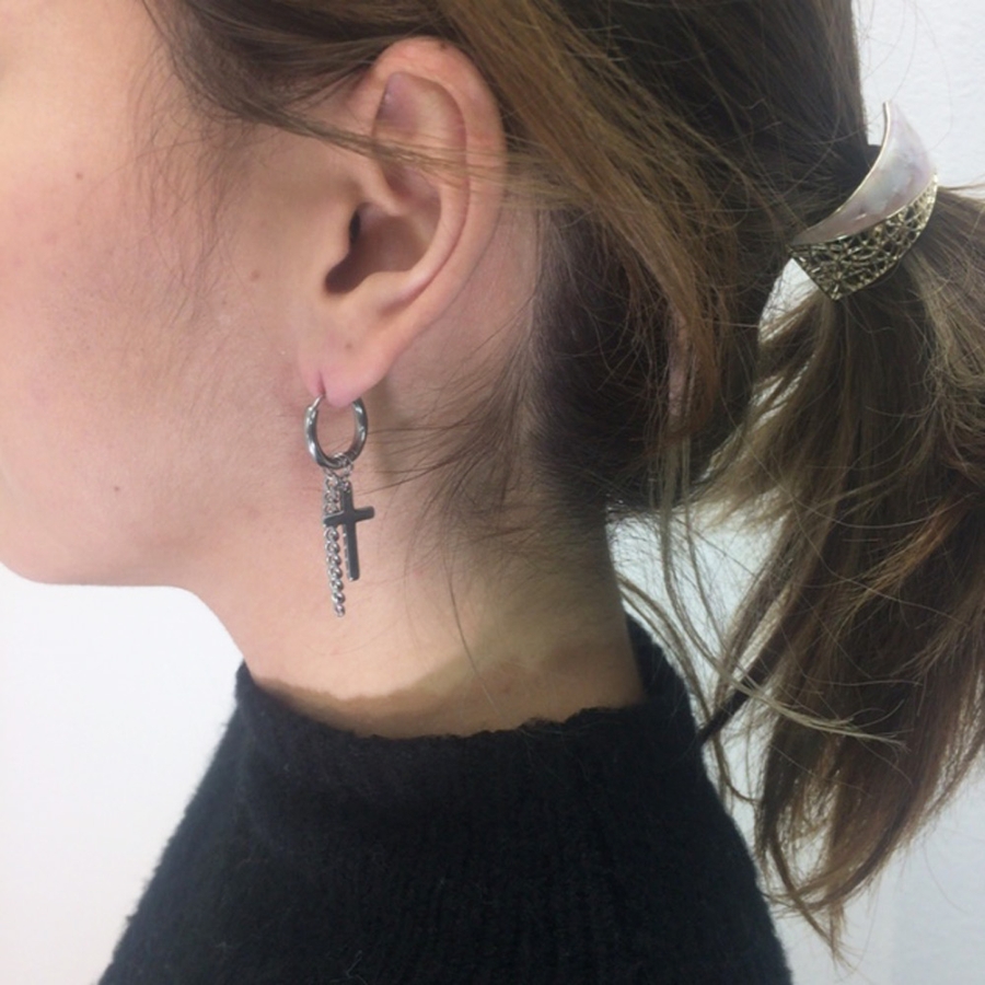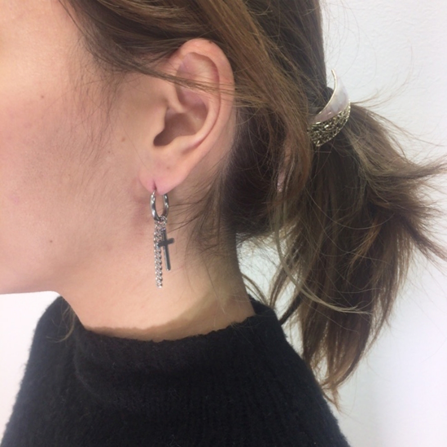 片耳クロスチェーンステンレスピアス フープ シルバー