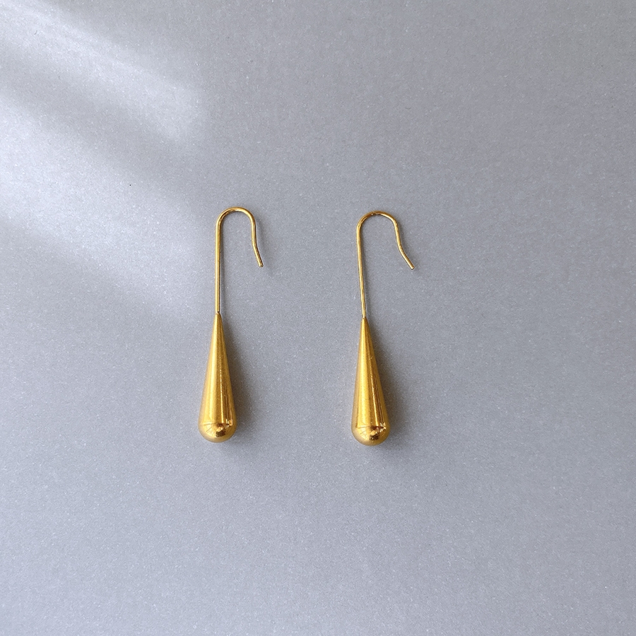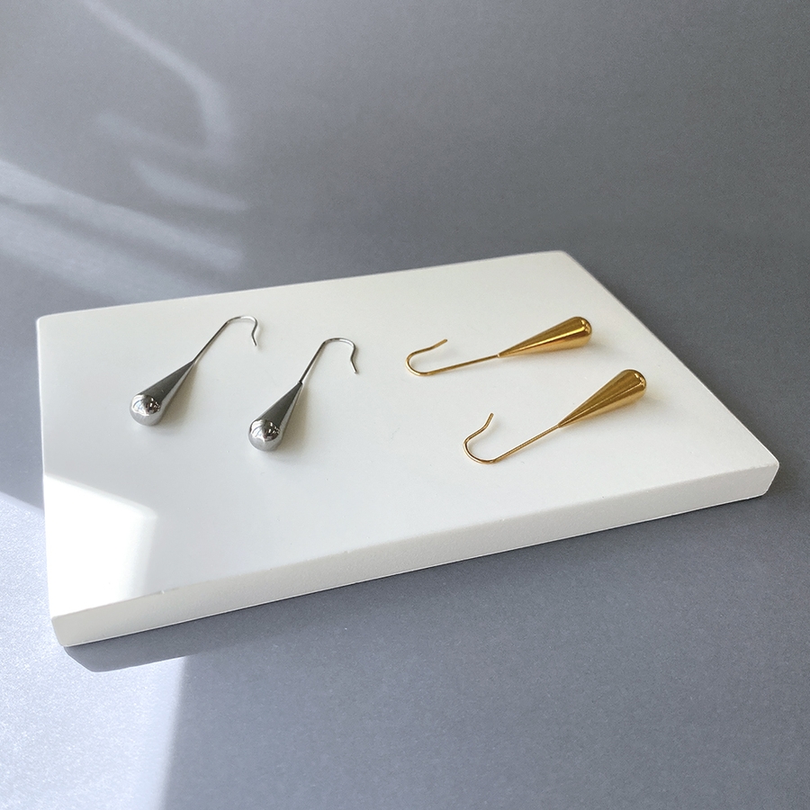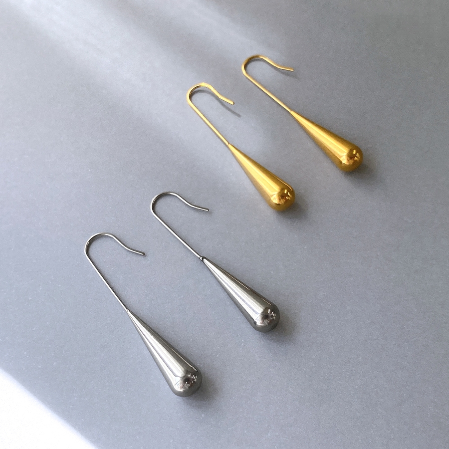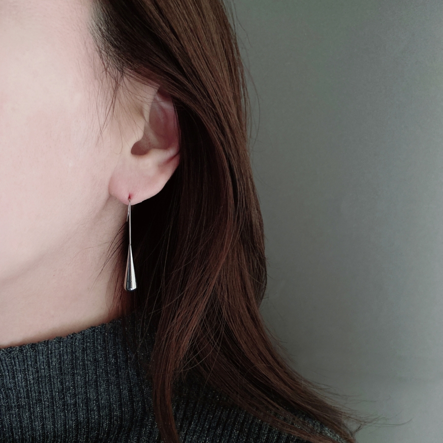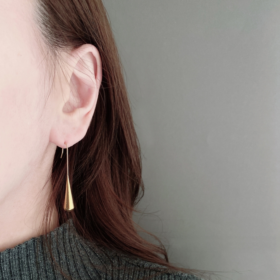 しずくが滴り落ちる瞬間を切り取ったかのようなドロップ型のフックピアスは、縦長シルエットでお顔周りをスッキリと見せてくれます♪