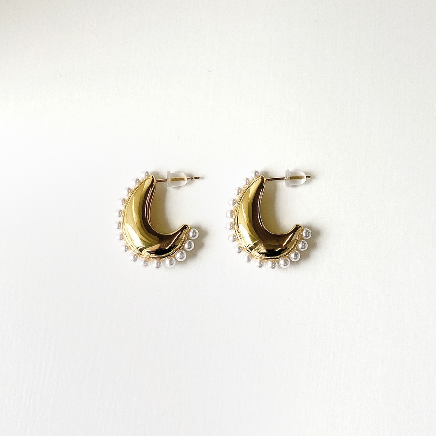 独特なディテールで存在感を発揮するムーンパールフープピアス。
