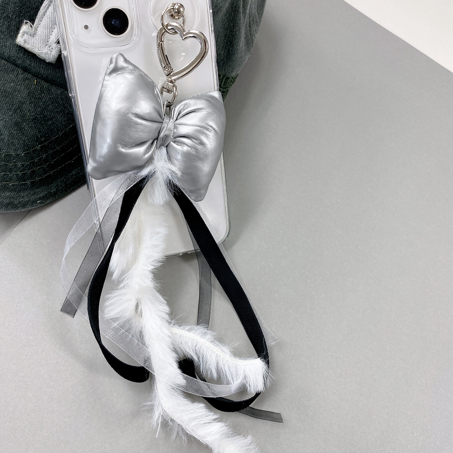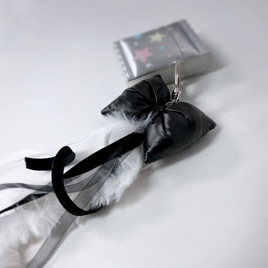 手触りの良いリボンクッションと長めのファー&レースが重なり合った、ガーリーライクなファッションアイテム。