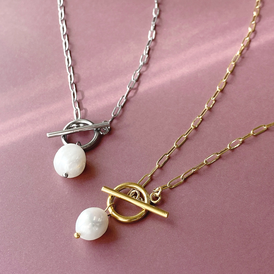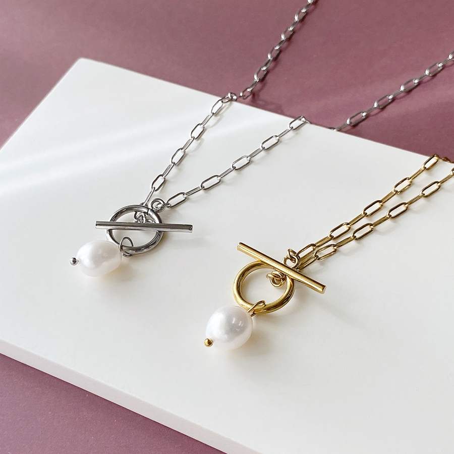 存在感を放つマンテルデザインの淡水パールネックレス。