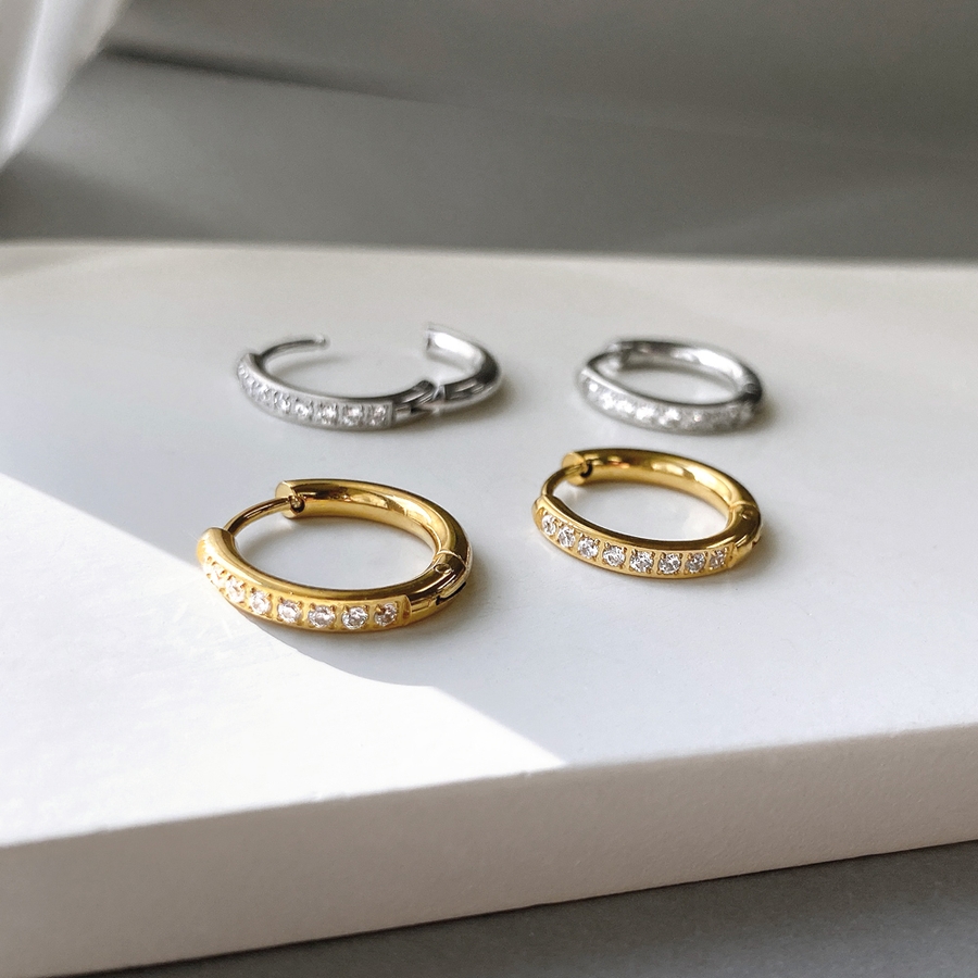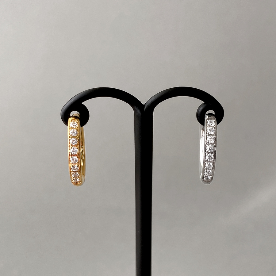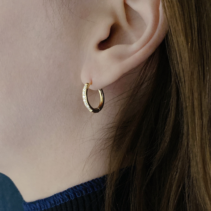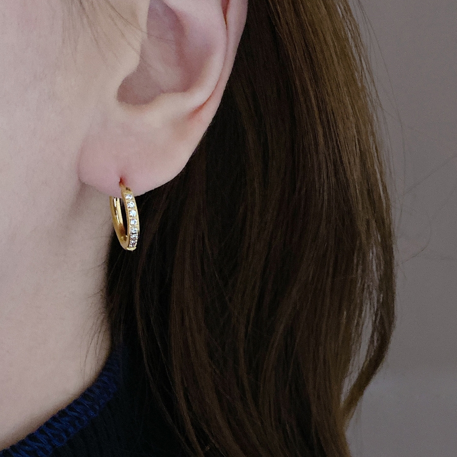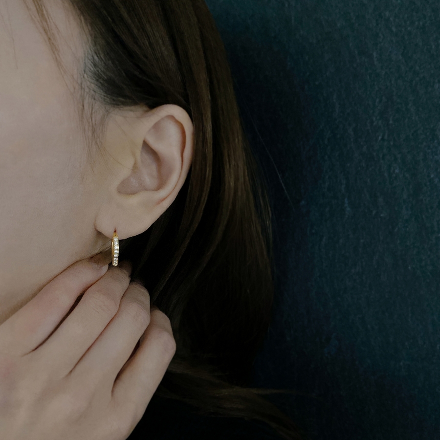 煌びやかな輝きを放つ、タイムレスなサークルフォルムのストーン付きフープピアス