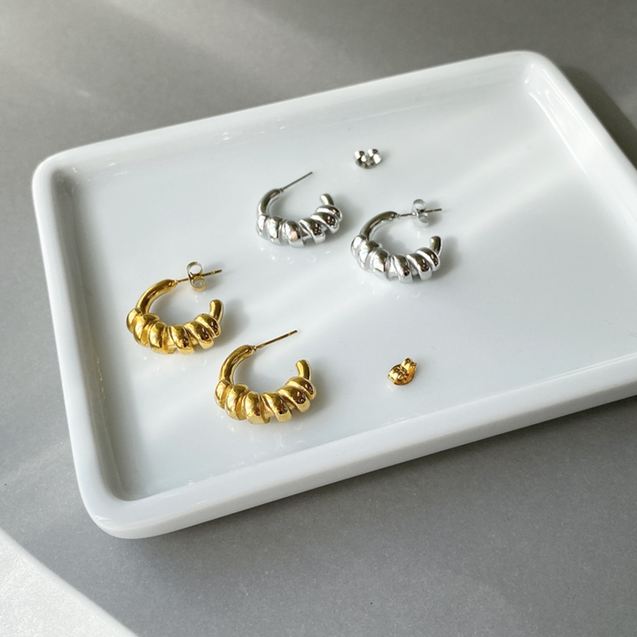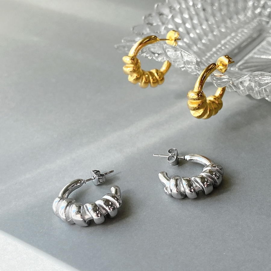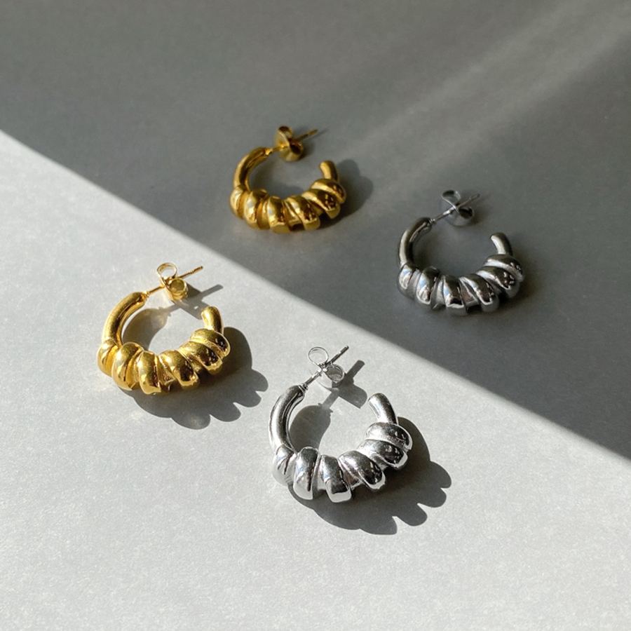 フープラインに螺旋上に巻き付けたステンレス製C型フープピアス。