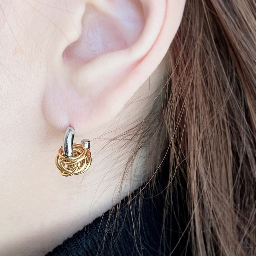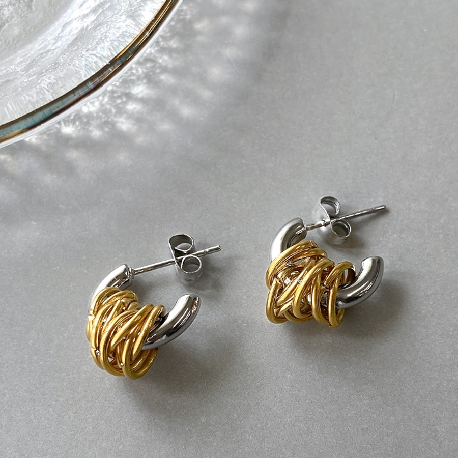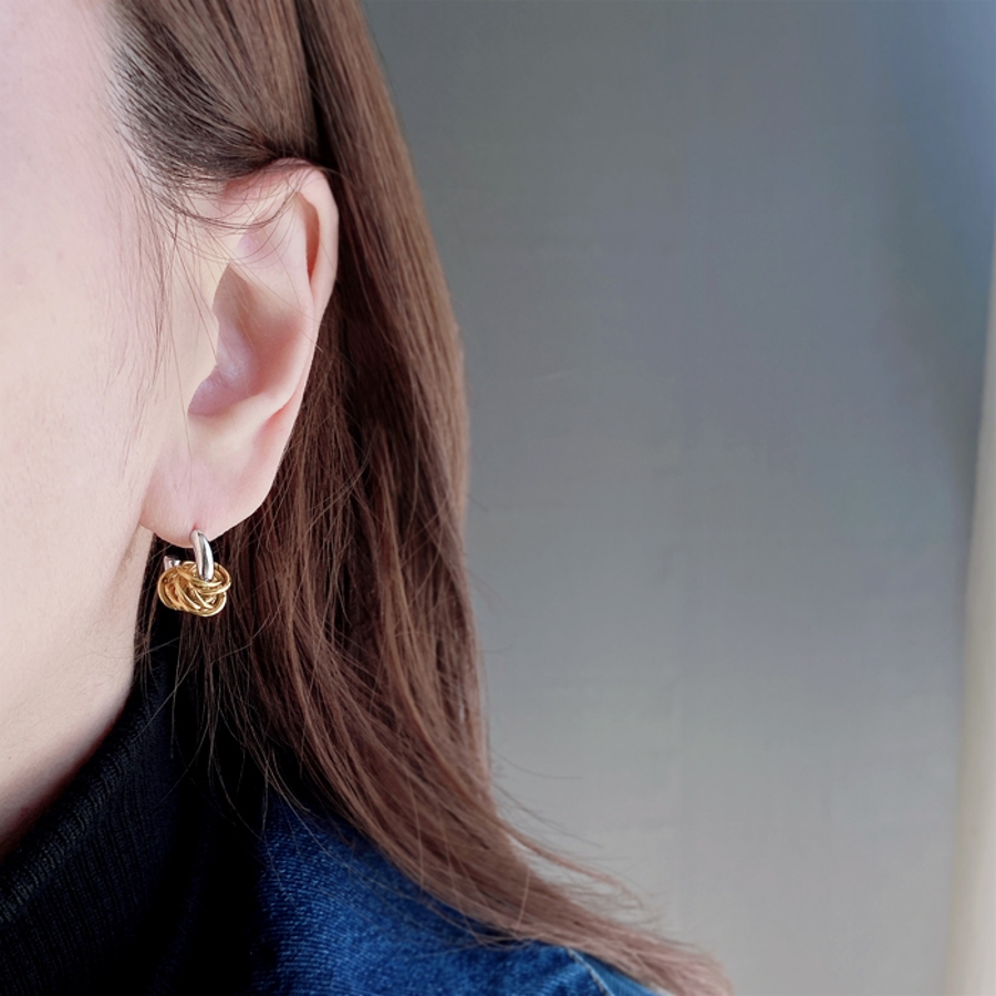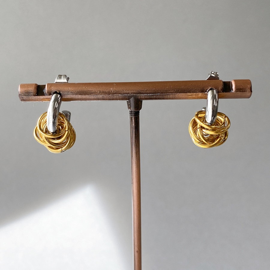 小ぶりなC型フープにゴールドリングをコイル状に巻いた、遊び心のある立体デザインフープピアス。