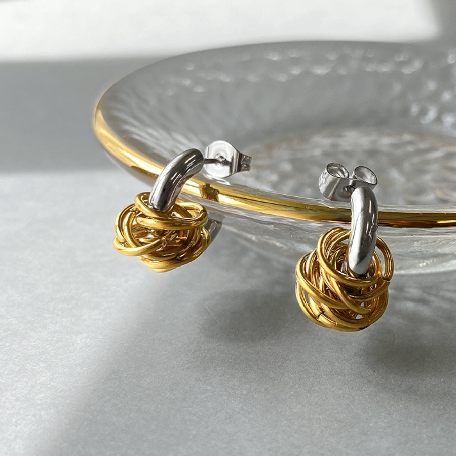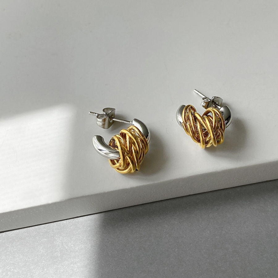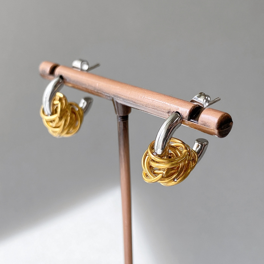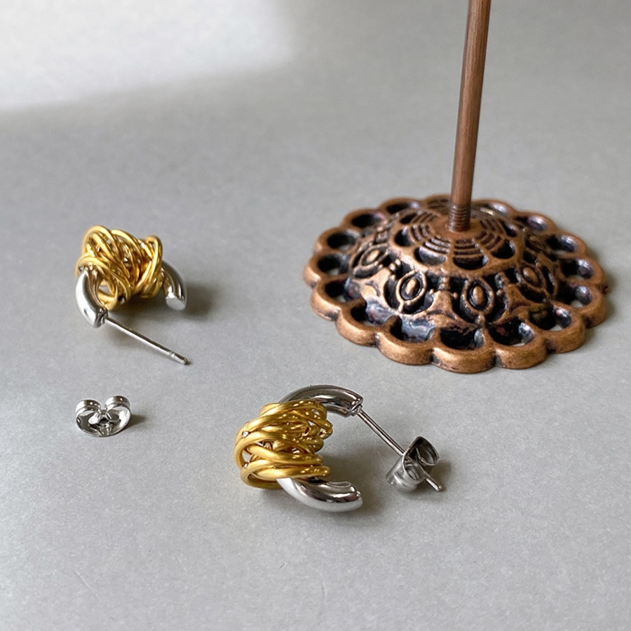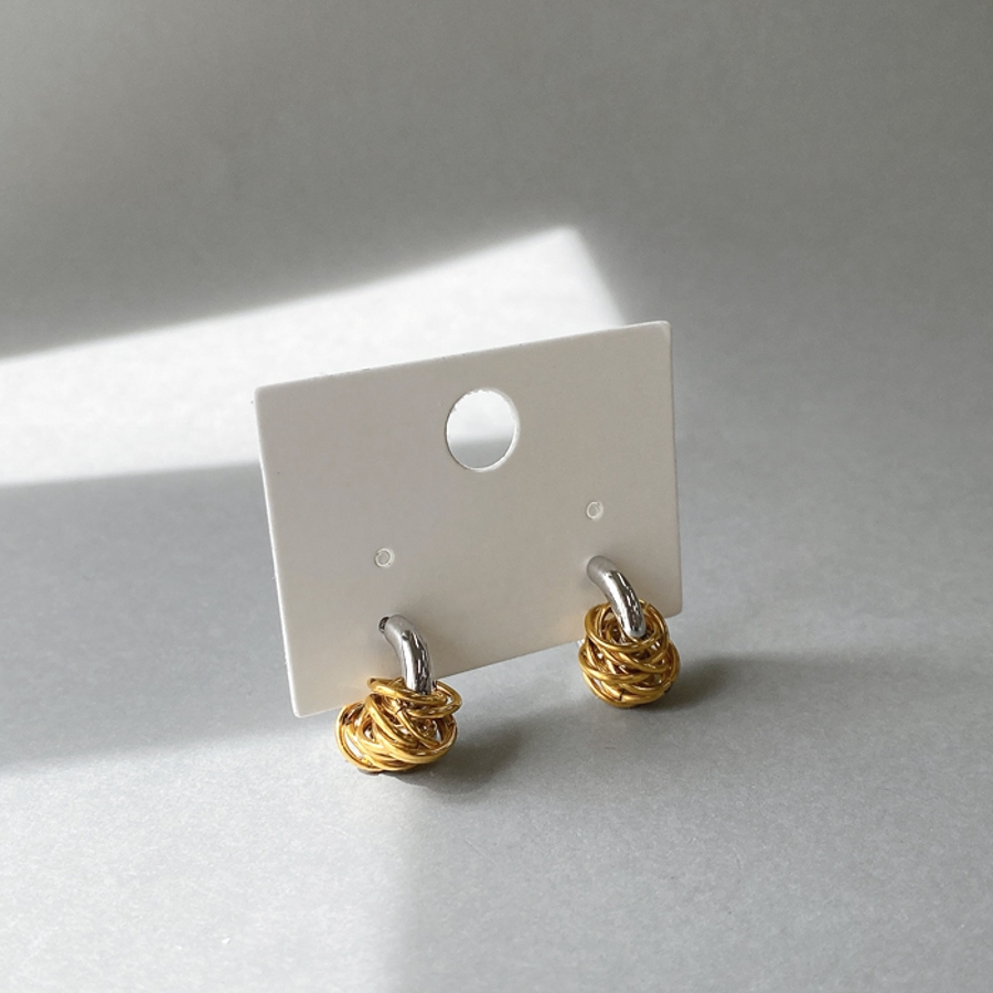 小ぶりなC型フープにゴールドリングをコイル状に巻いた、遊び心のある立体デザインフープピアス。