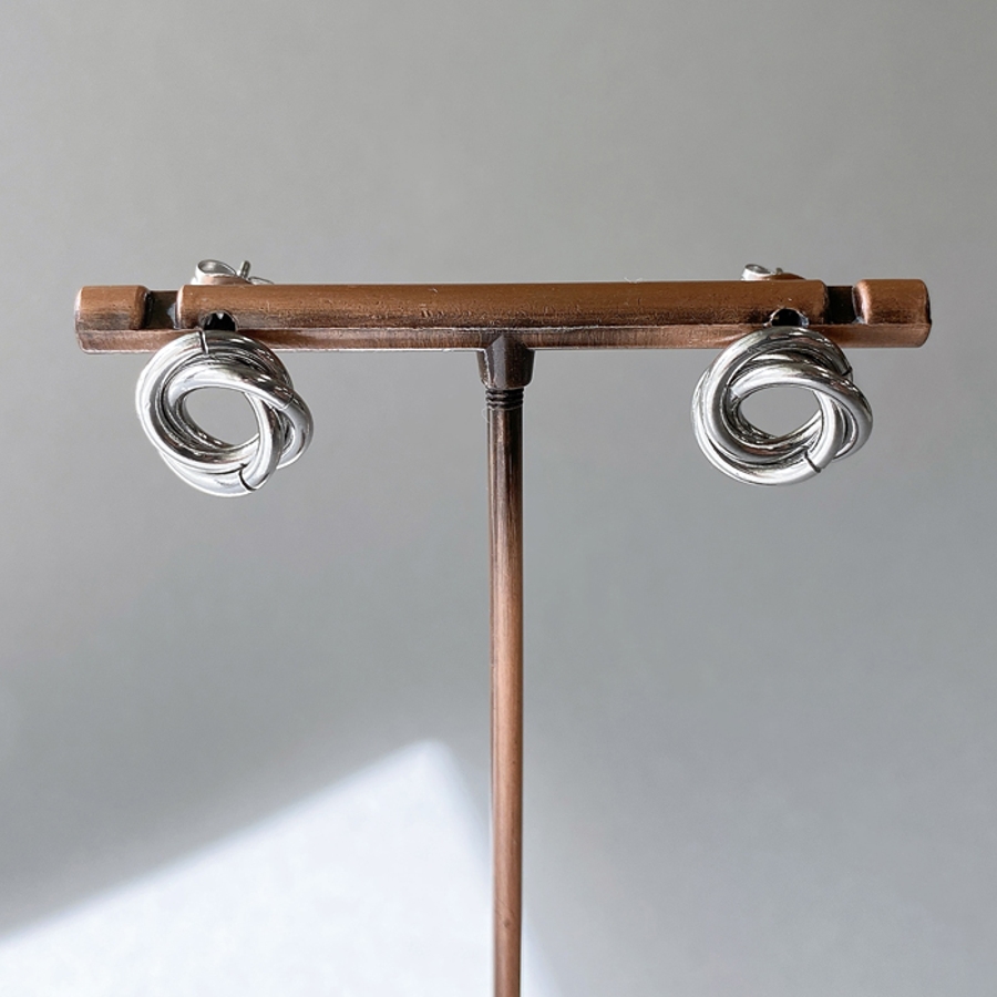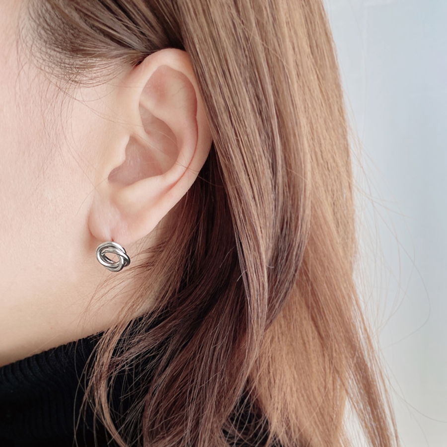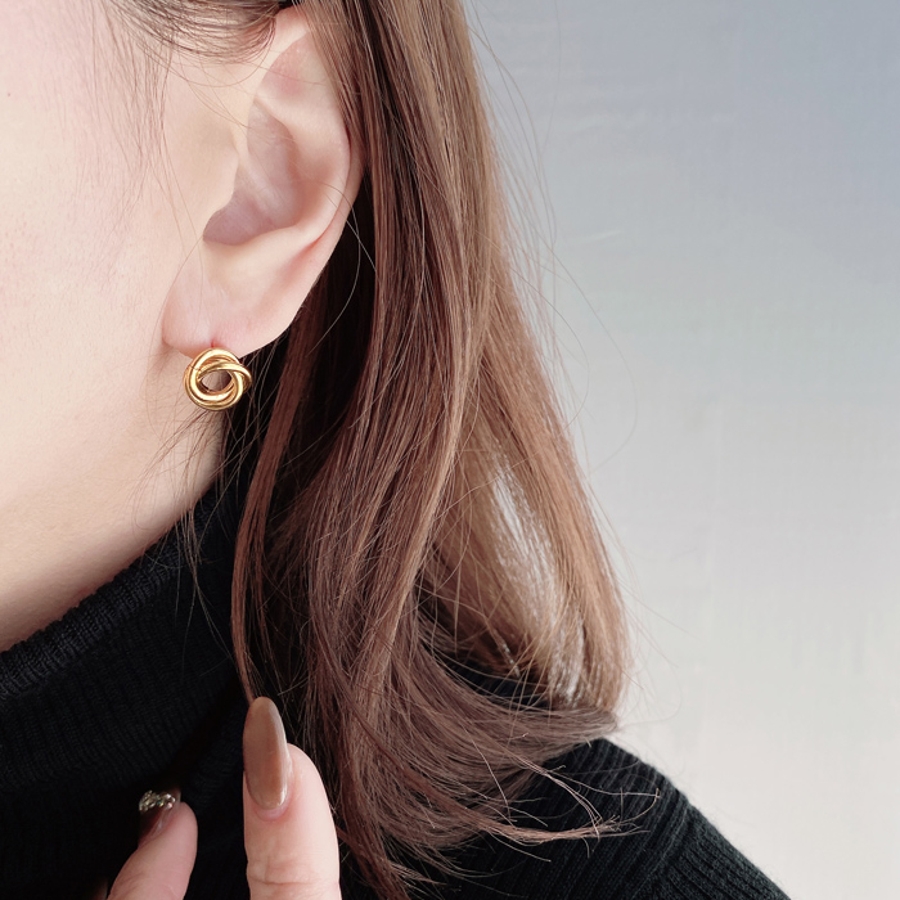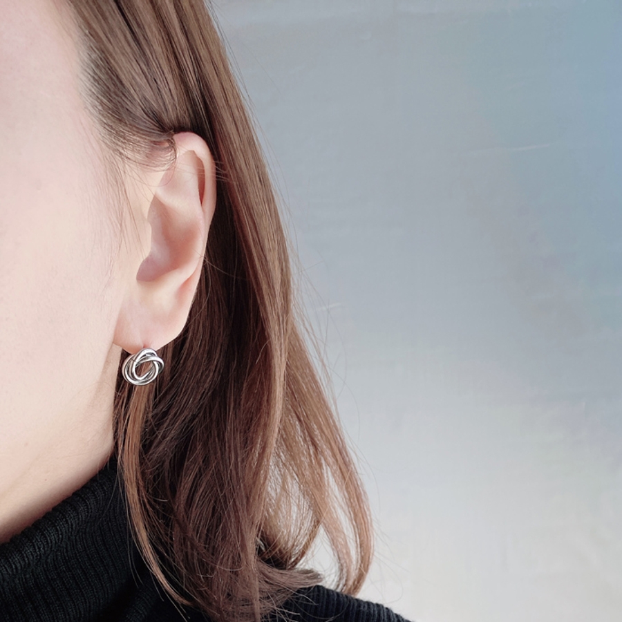 3つのリングを絡めて巻いたデザインは、メタリックな輝きでお顔周りを華やかに彩ります。