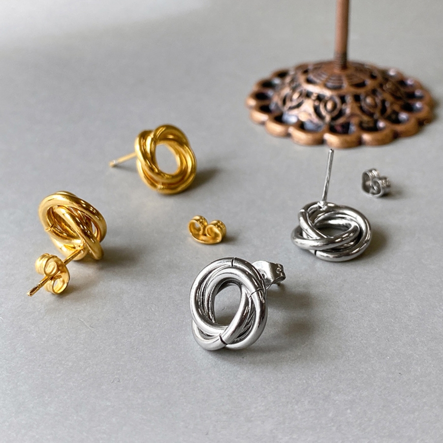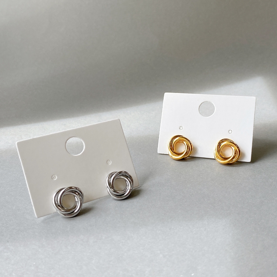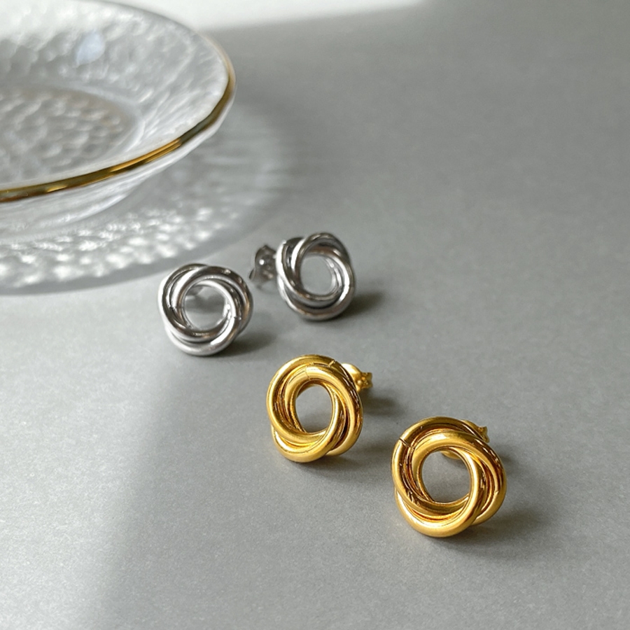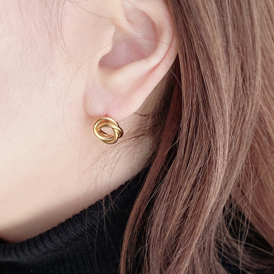 3つのリングを絡めて巻いたデザインは、メタリックな輝きでお顔周りを華やかに彩ります。