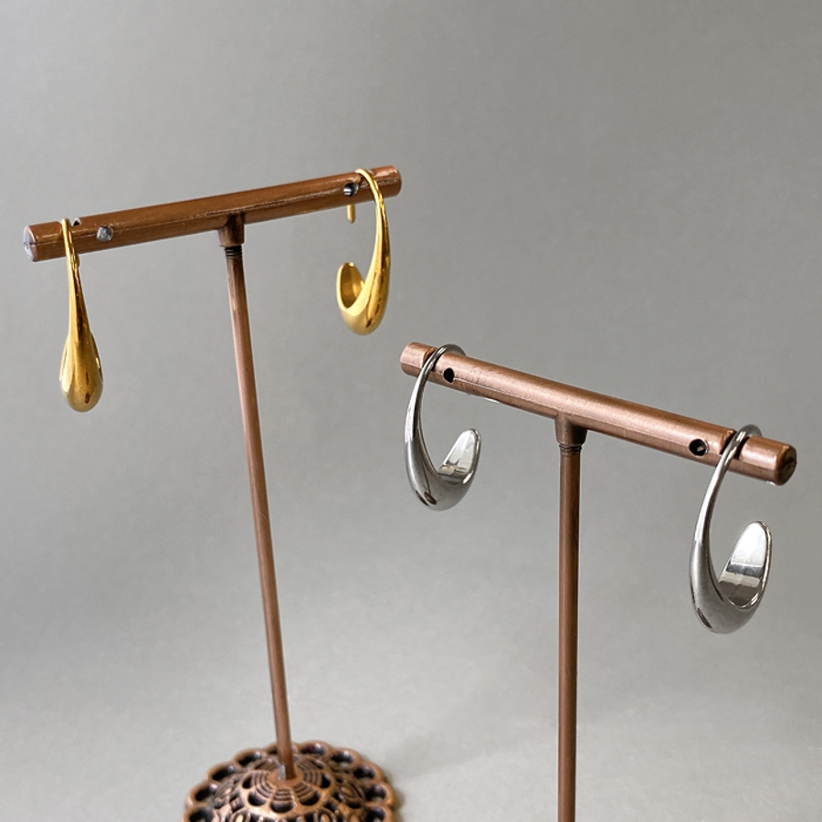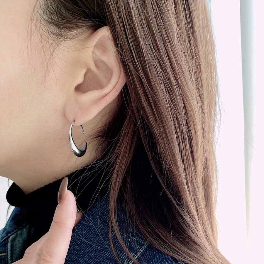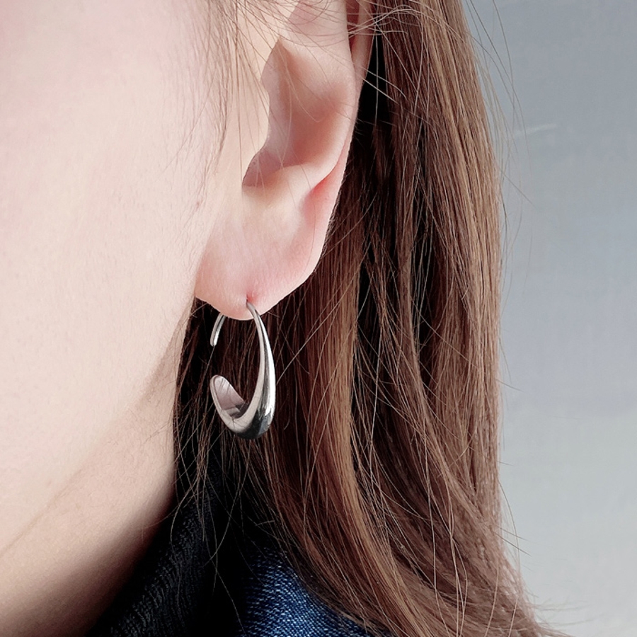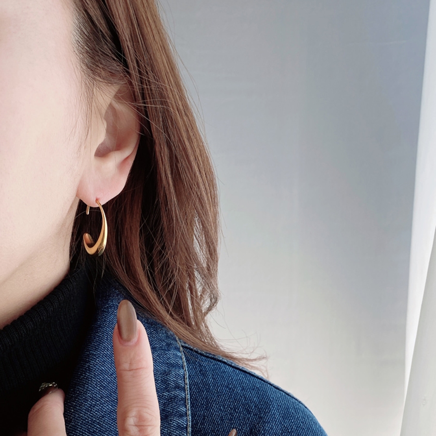 モード感あるメタルの光沢が美しい、ステンレス素材のドロップフープピアス。
