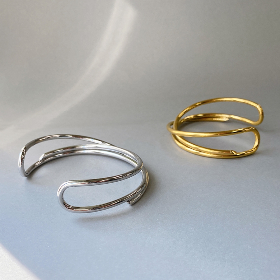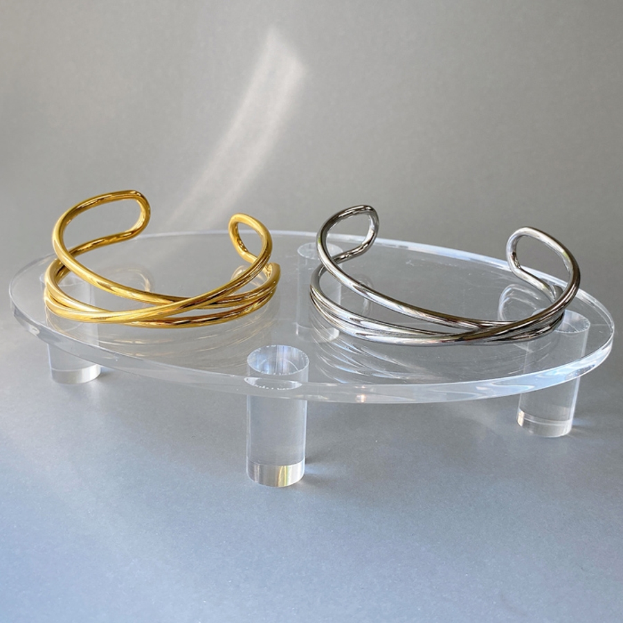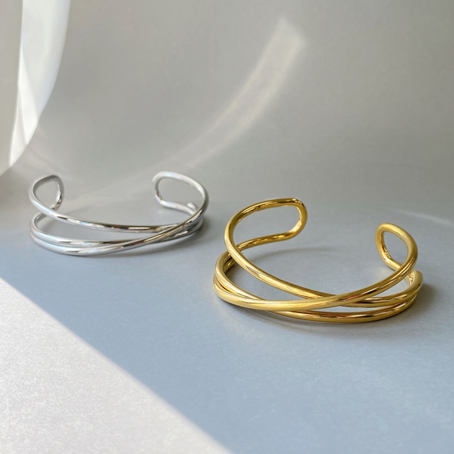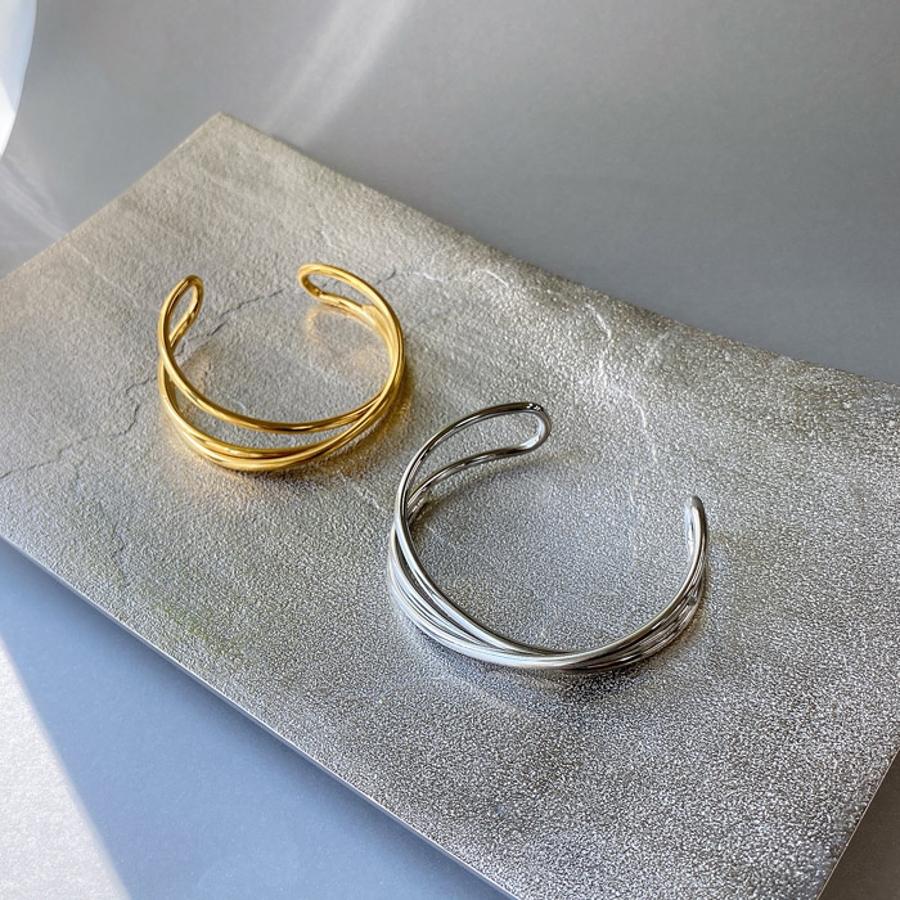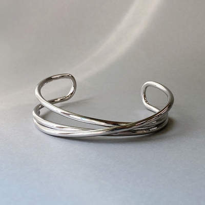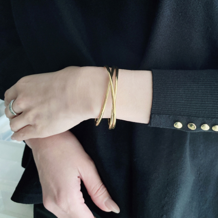 ボリュームあるレイヤードラインのステンレス製クロスループメタルバングル。