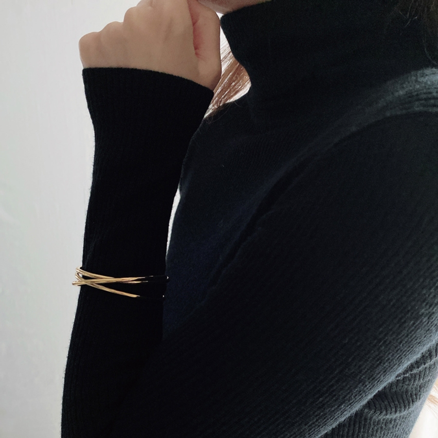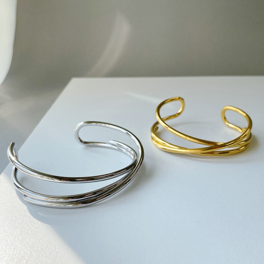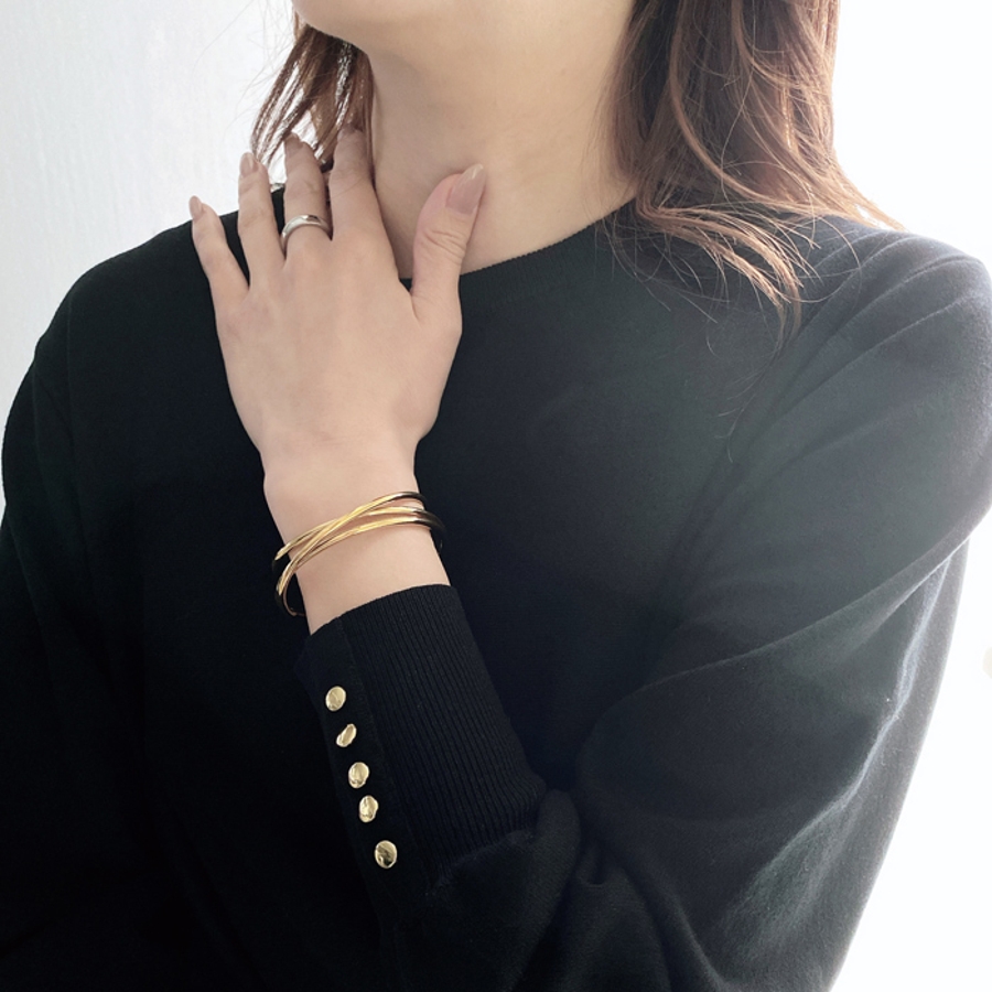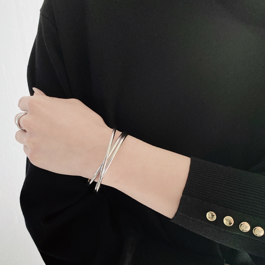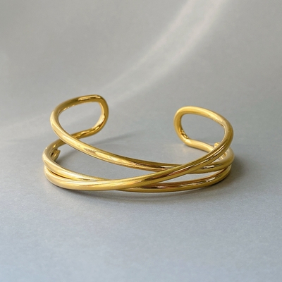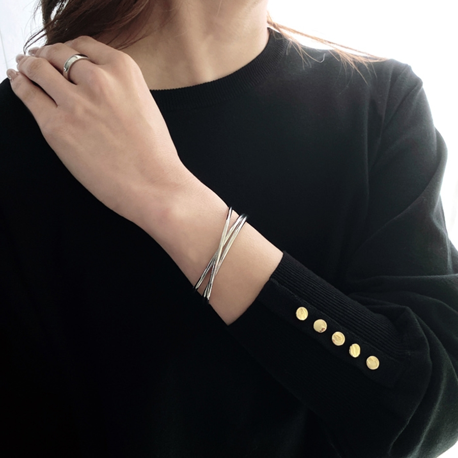 ボリュームあるレイヤードラインのステンレス製クロスループメタルバングル。