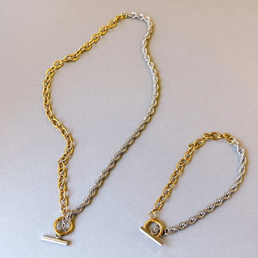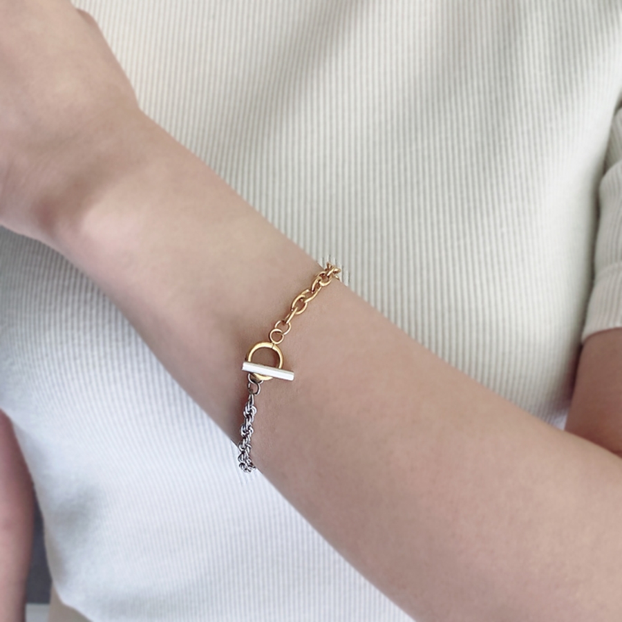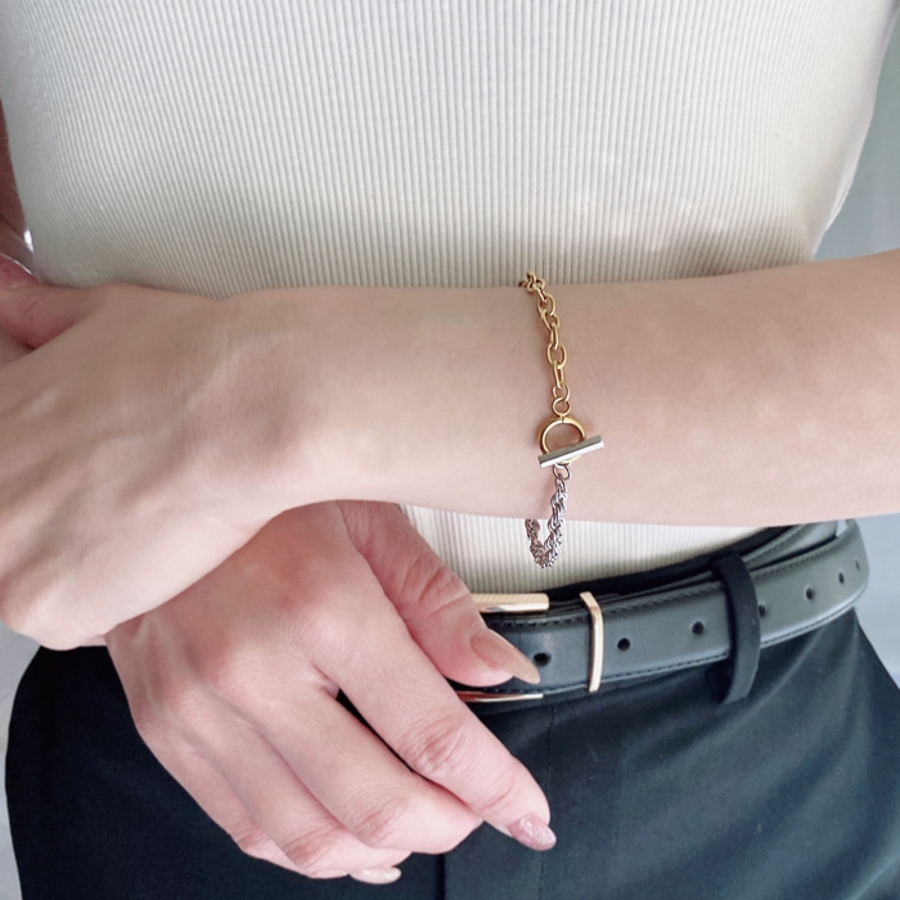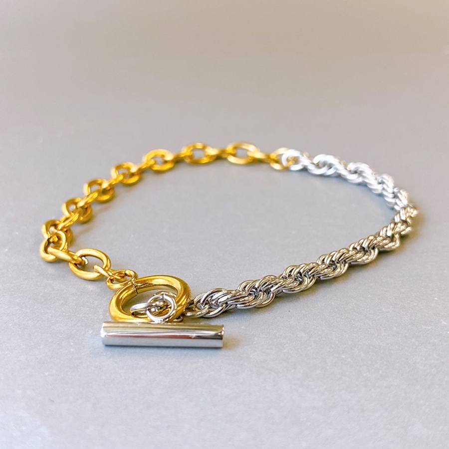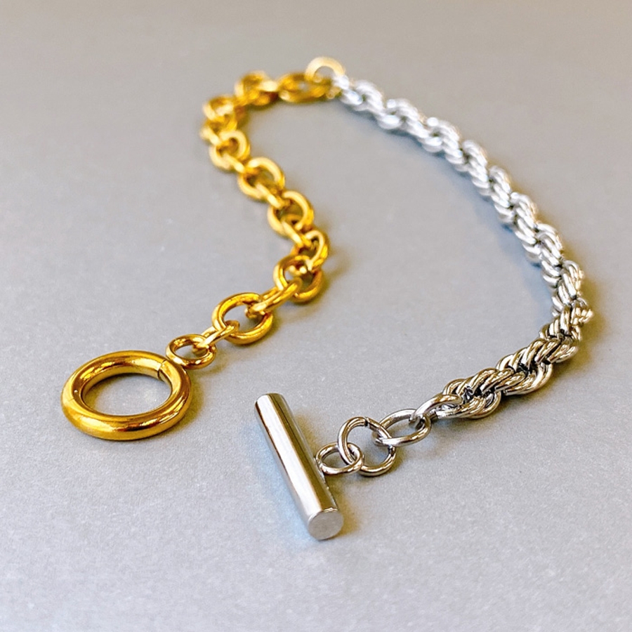シルバーとゴールドのメタル基調としたバイカラーチェーンブレスレット。