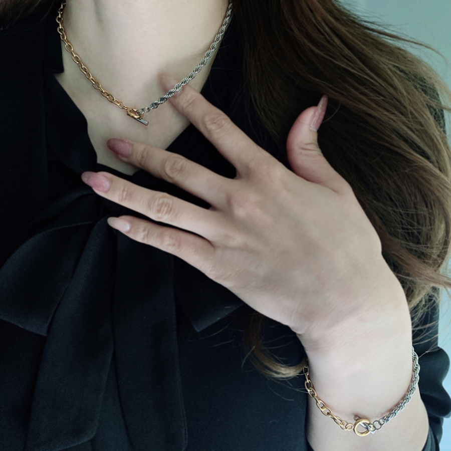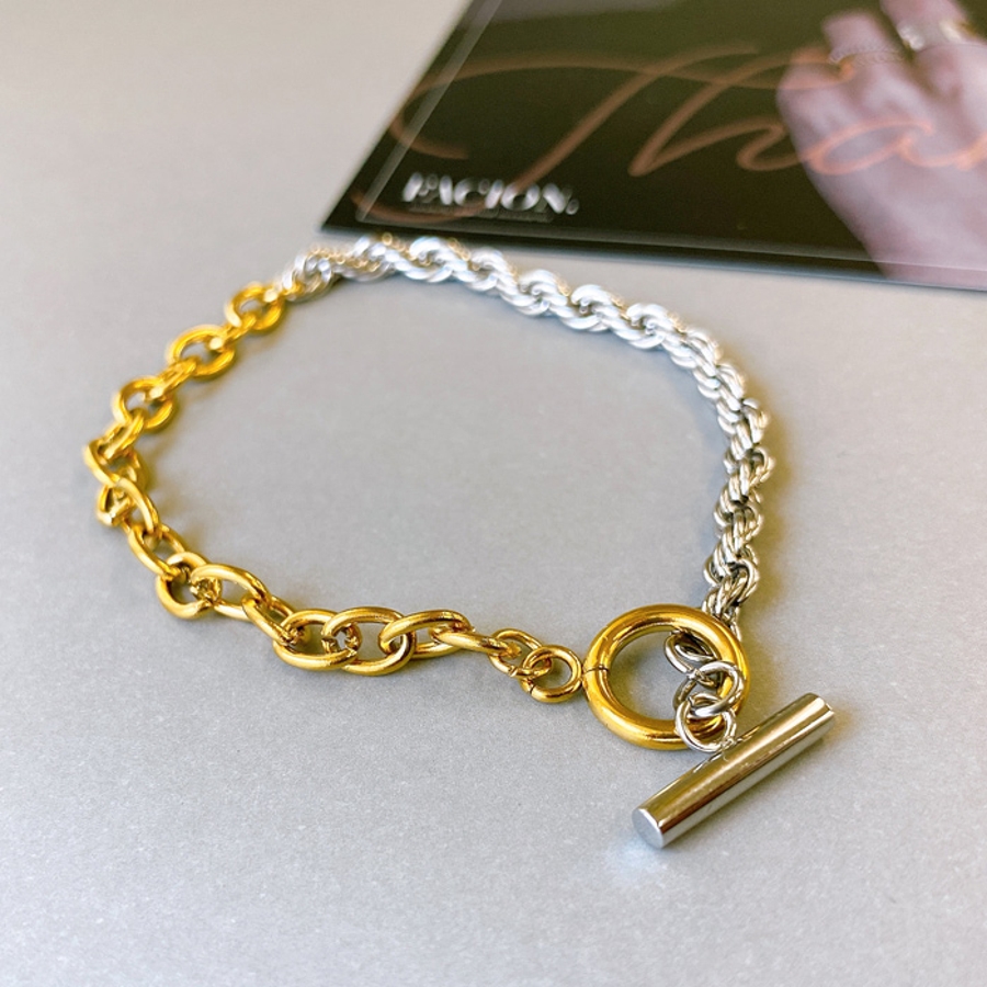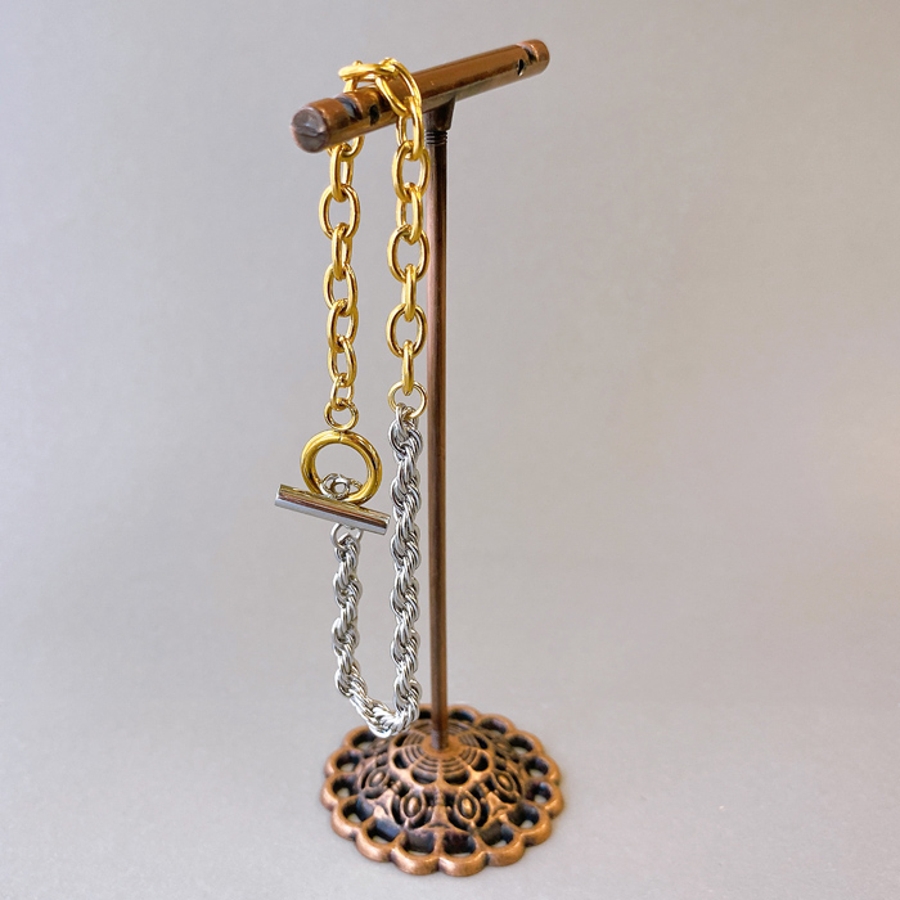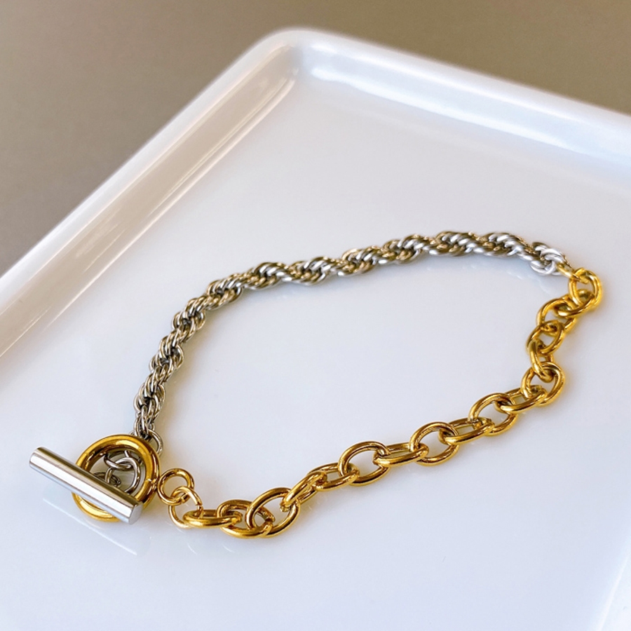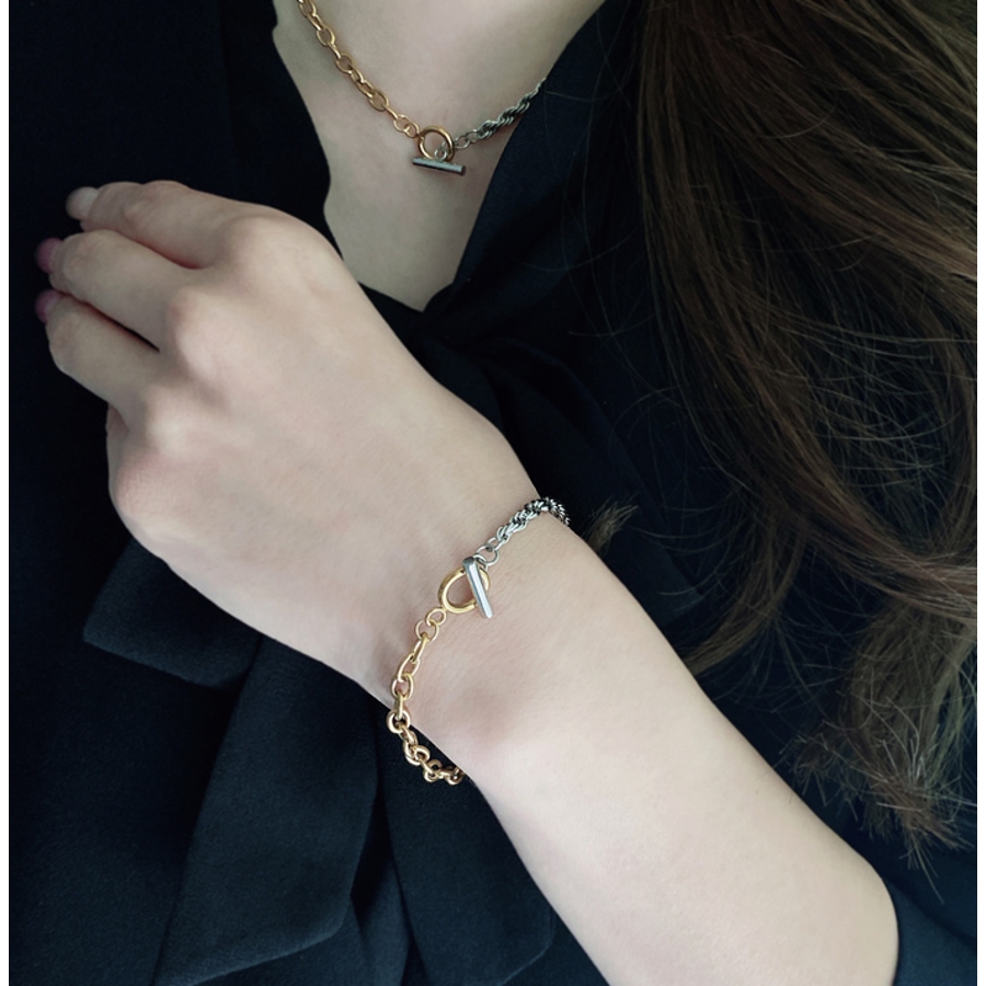 シルバーとゴールドのメタル基調としたバイカラーチェーンブレスレット。