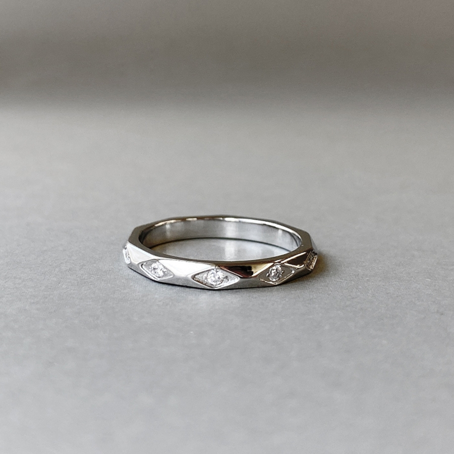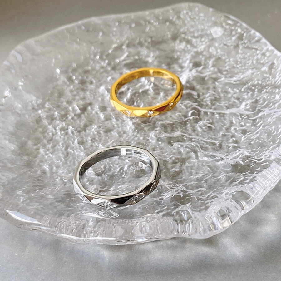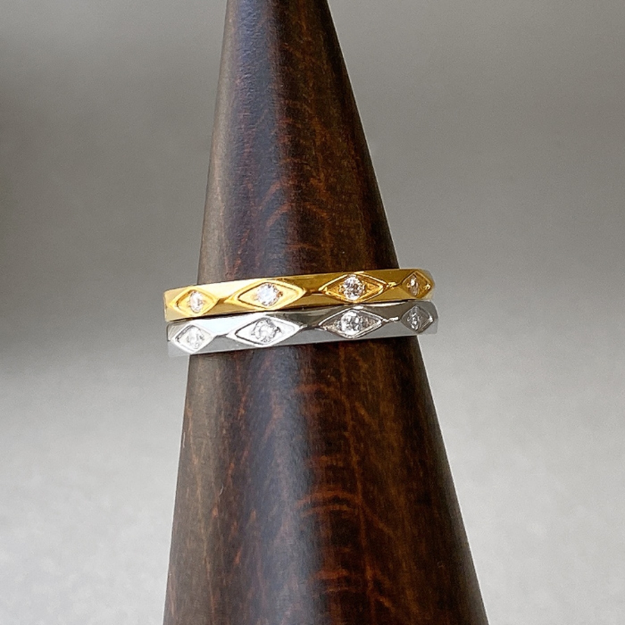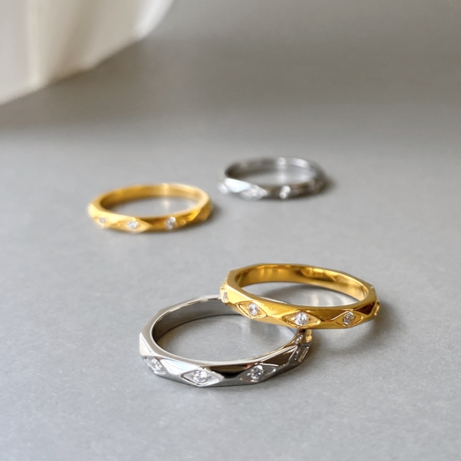 洗練されたシャープな輝きを放つ、CZ付ダイヤカットステンレスリング。