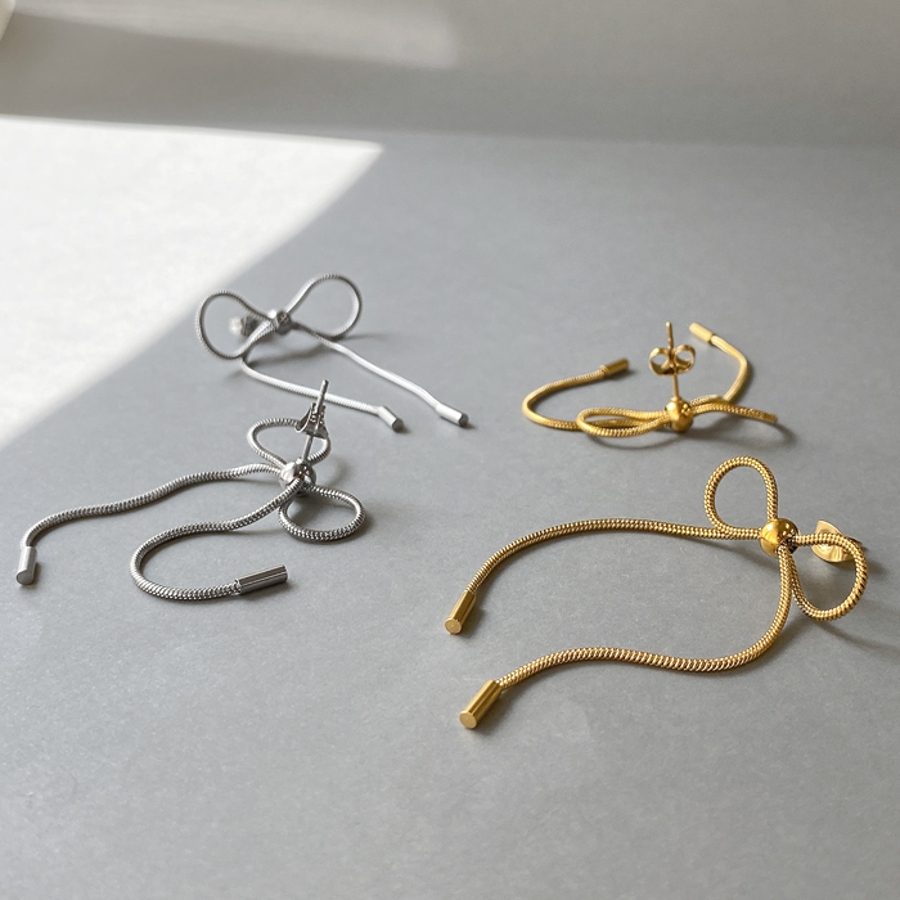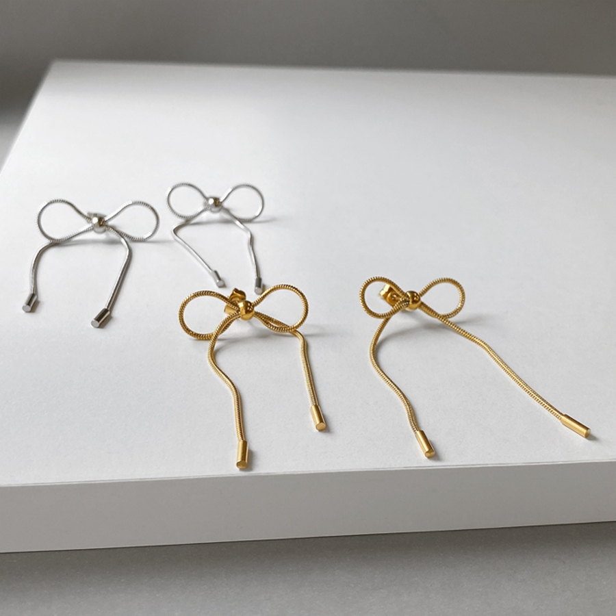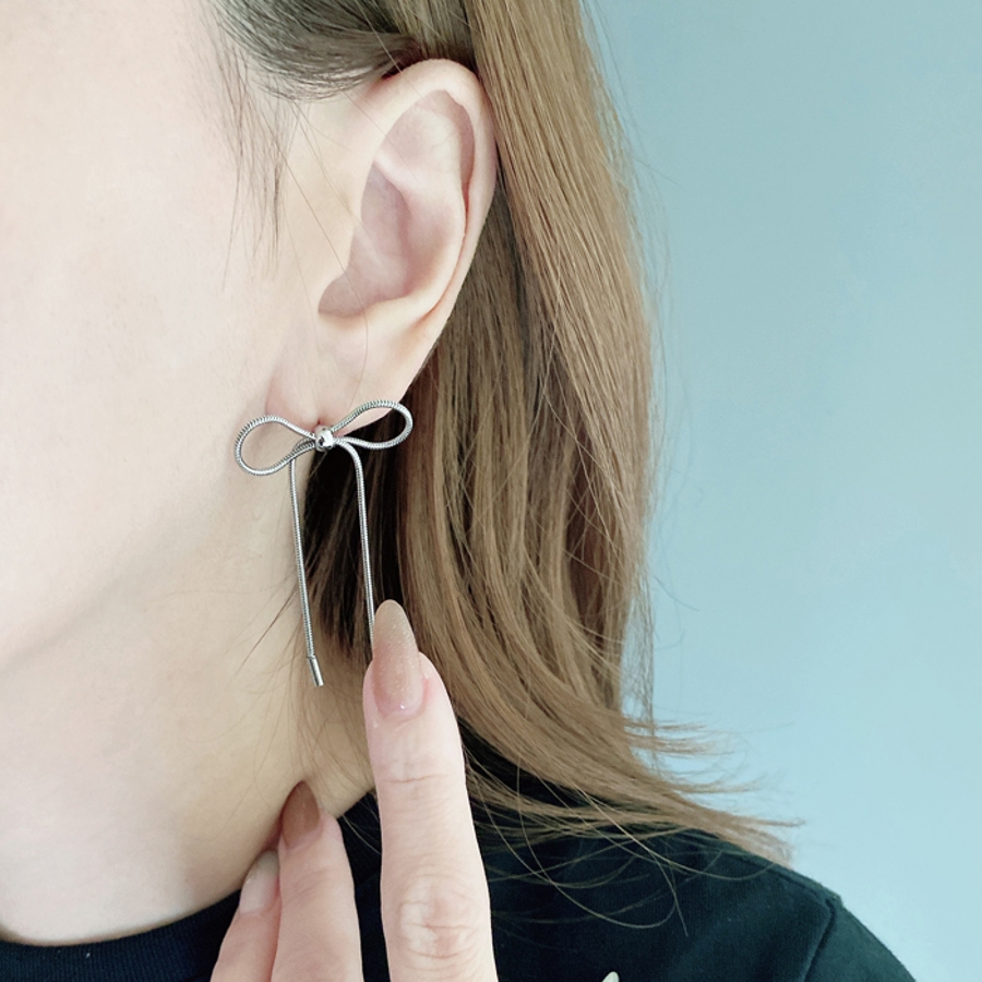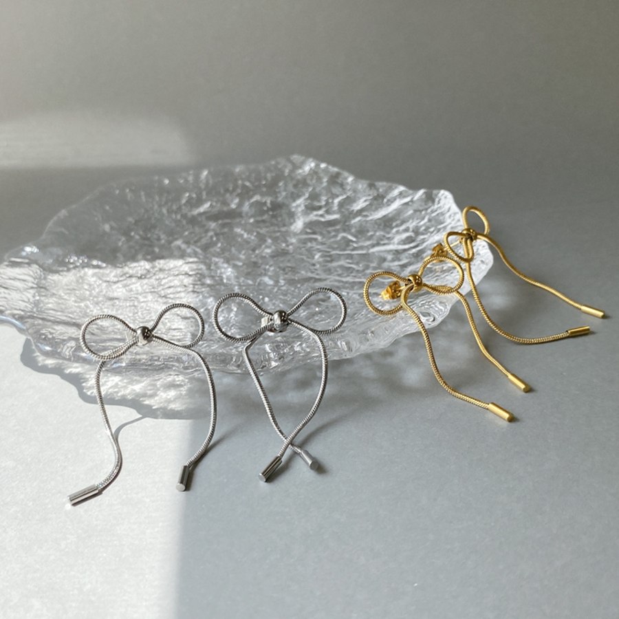 【シルバー】リボンチェーンステンレスピアス 蝶々 りぼん