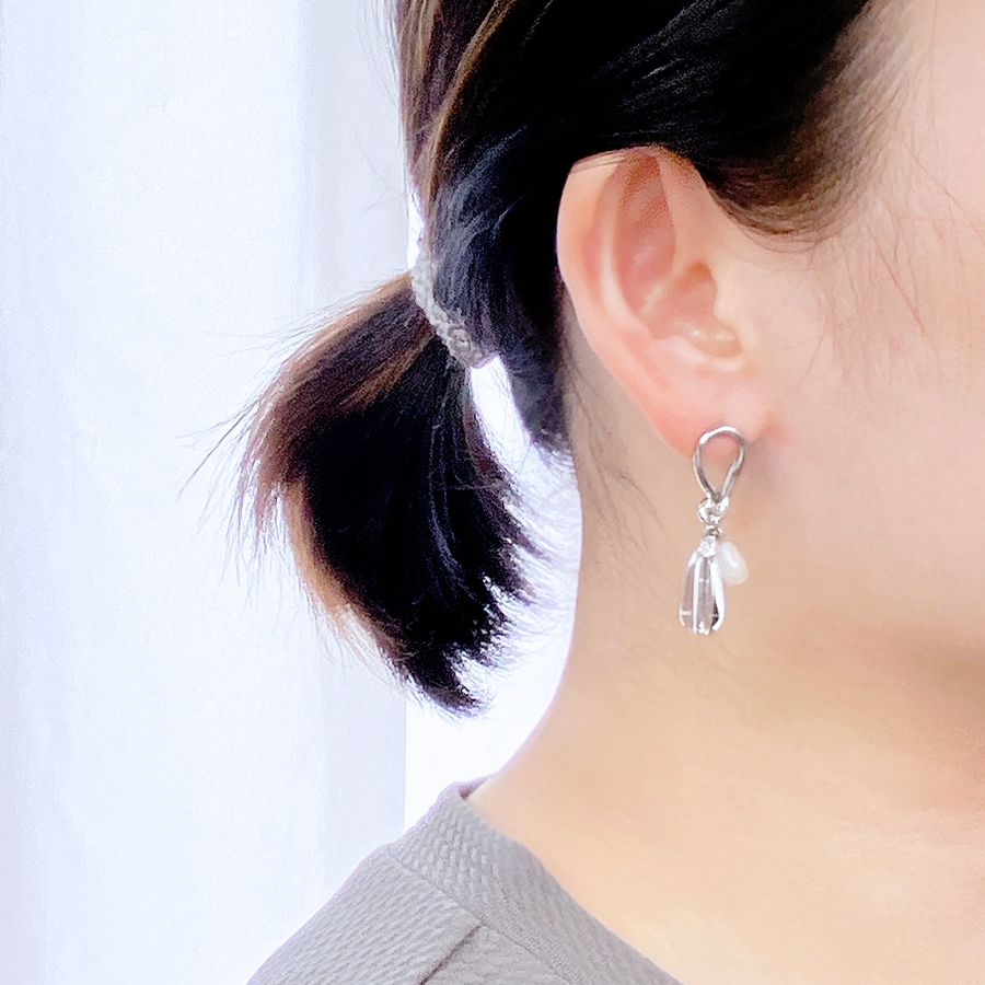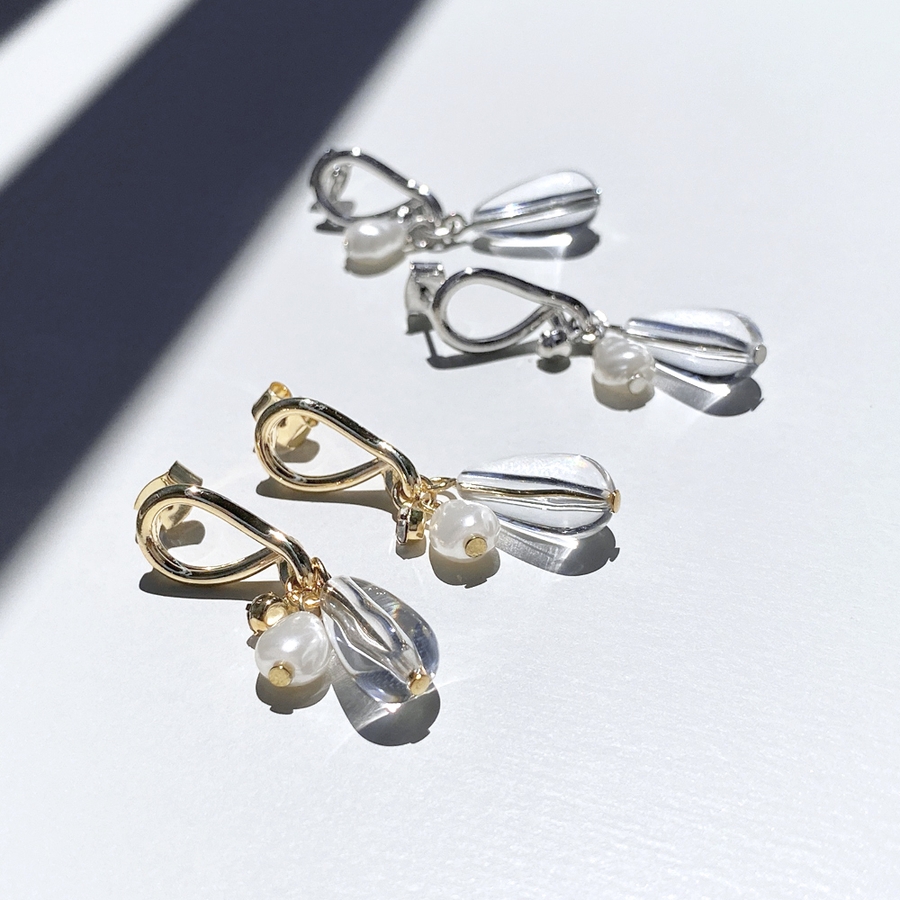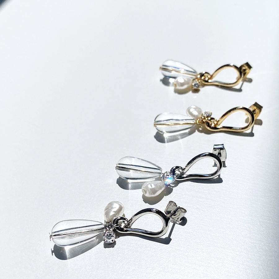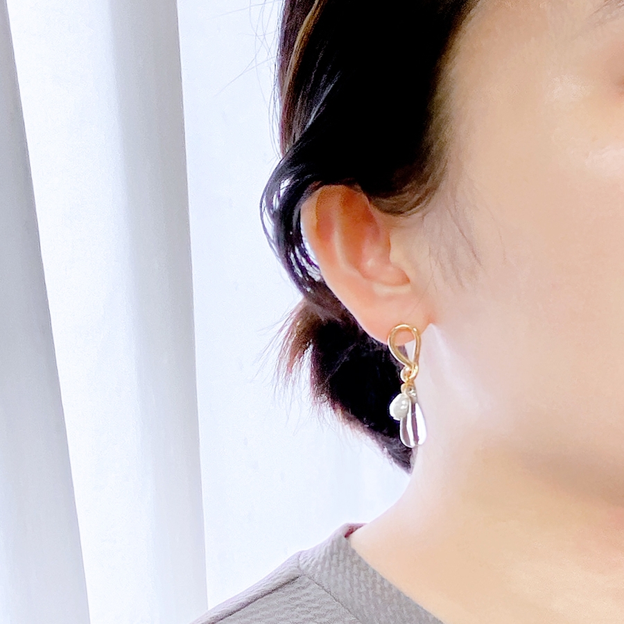 耳元でさりげなく存在感を放つ、クリアドロップ&パールメタルピアス。