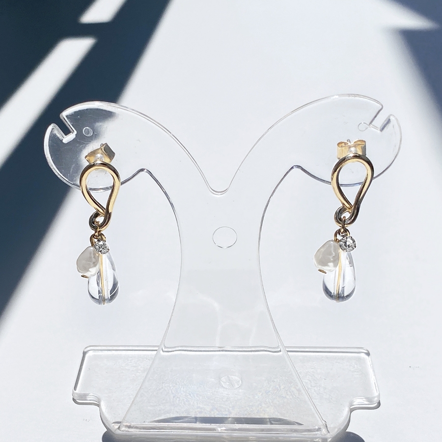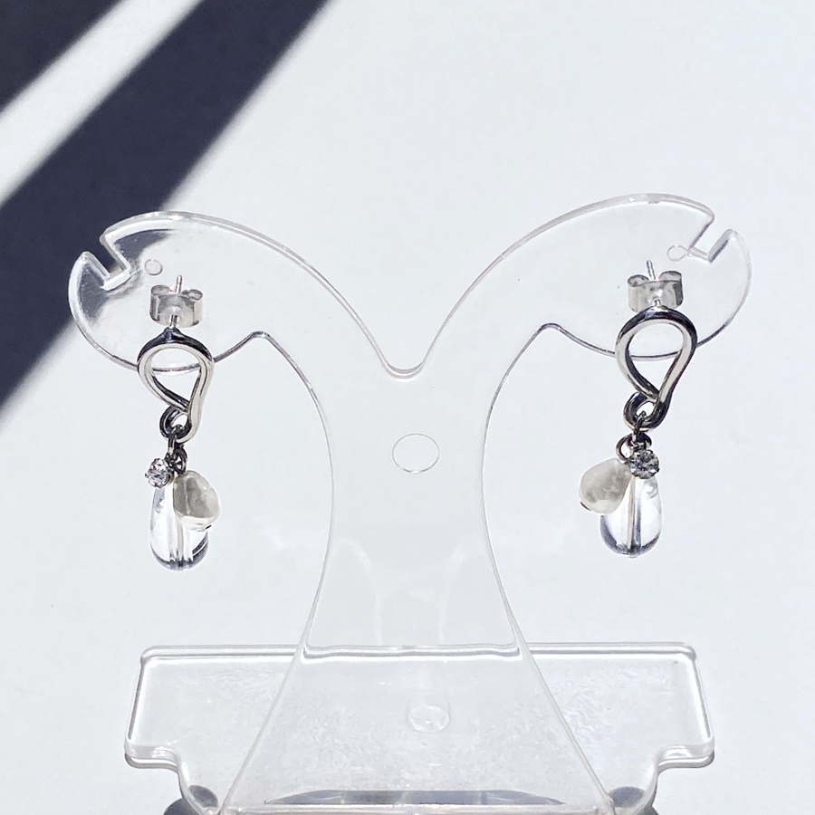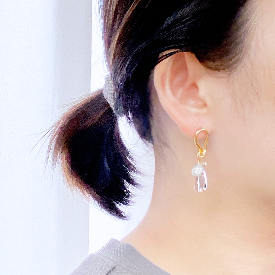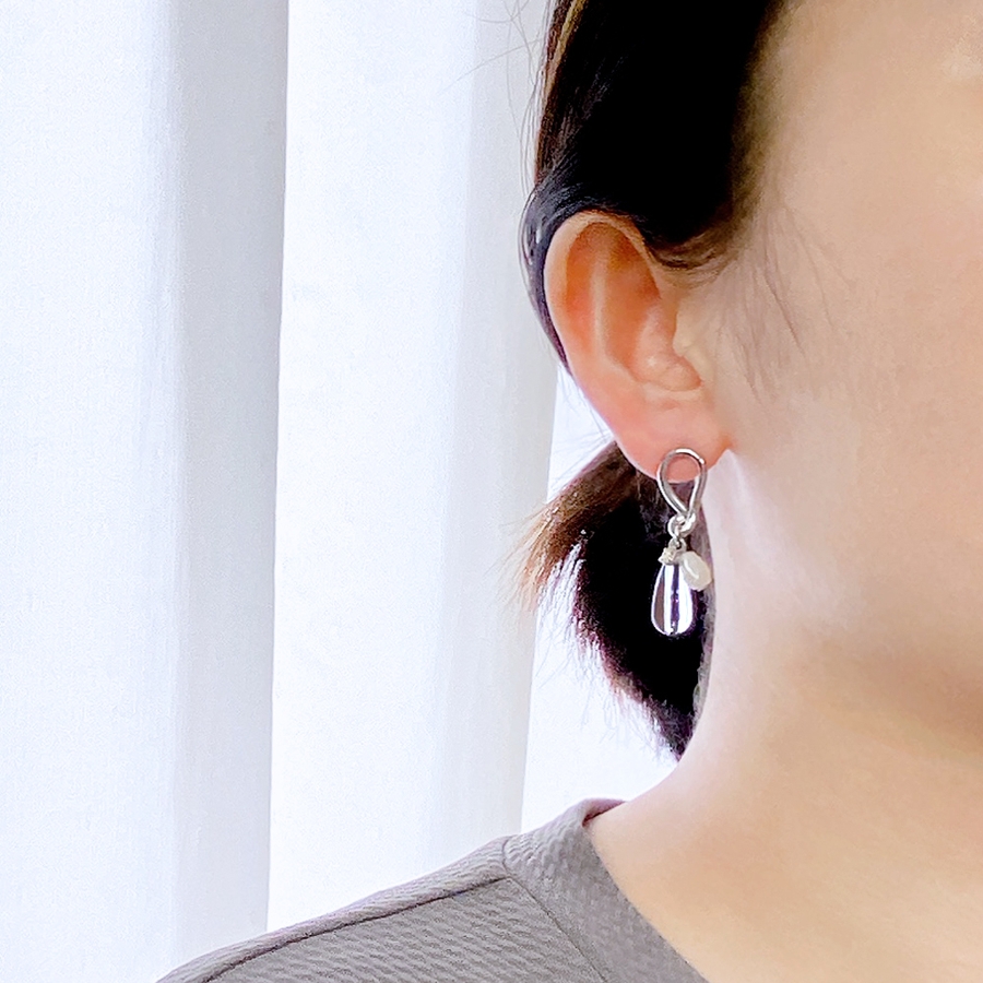 耳元でさりげなく存在感を放つ、クリアドロップ&パールメタルピアス。
