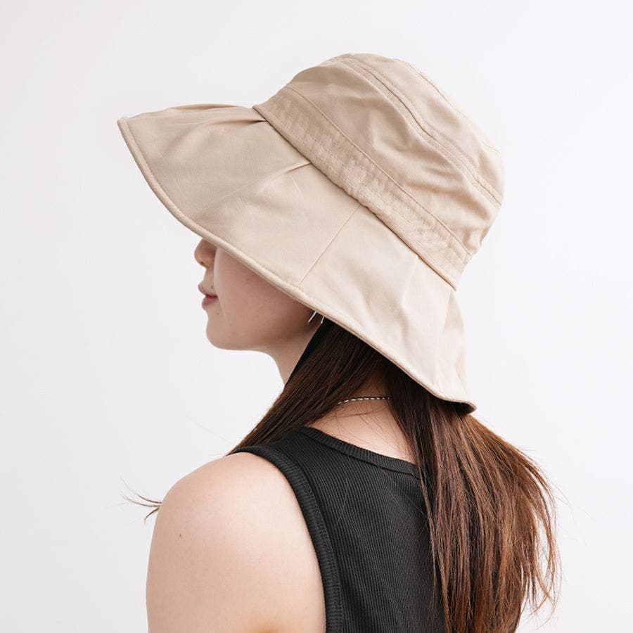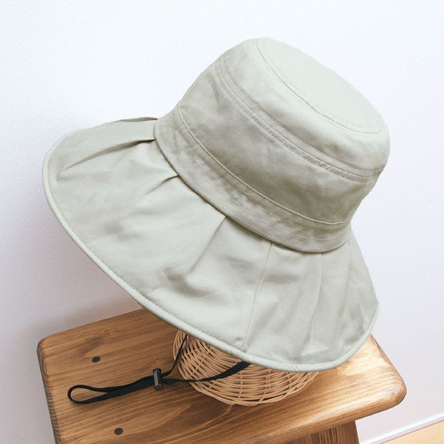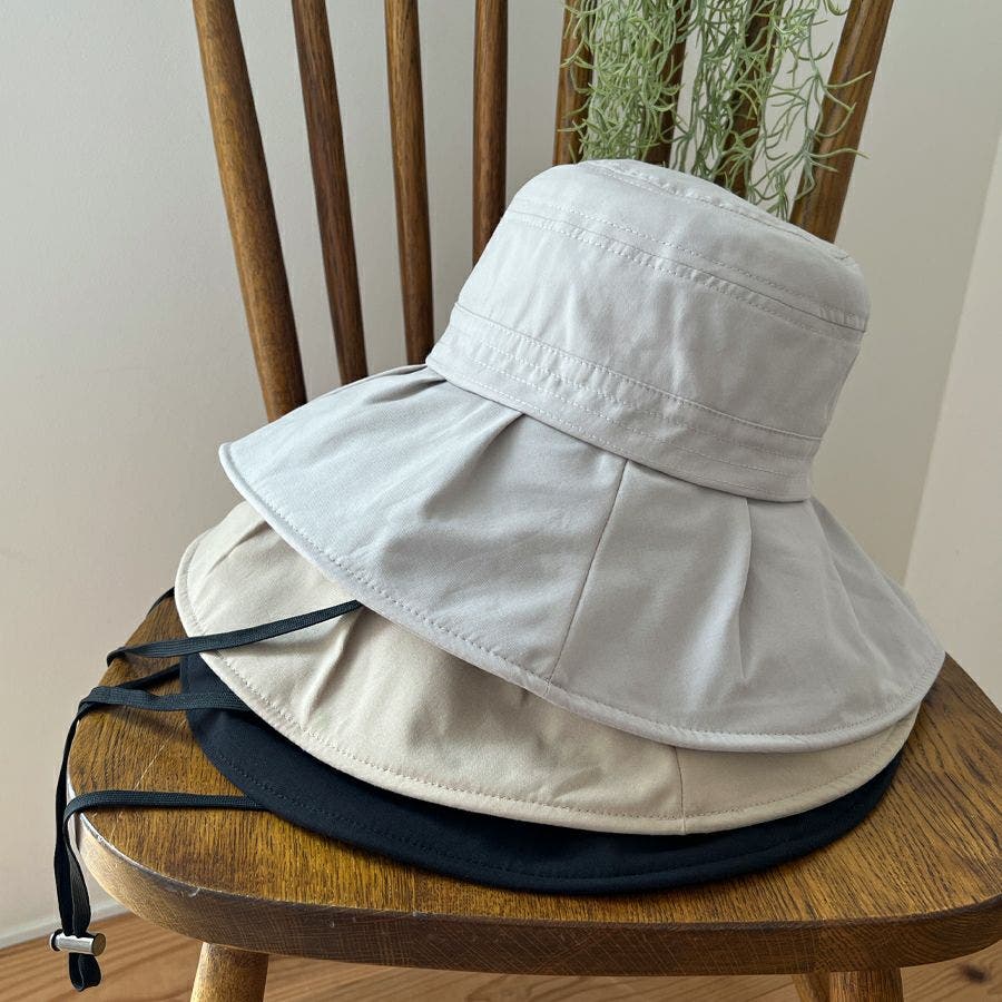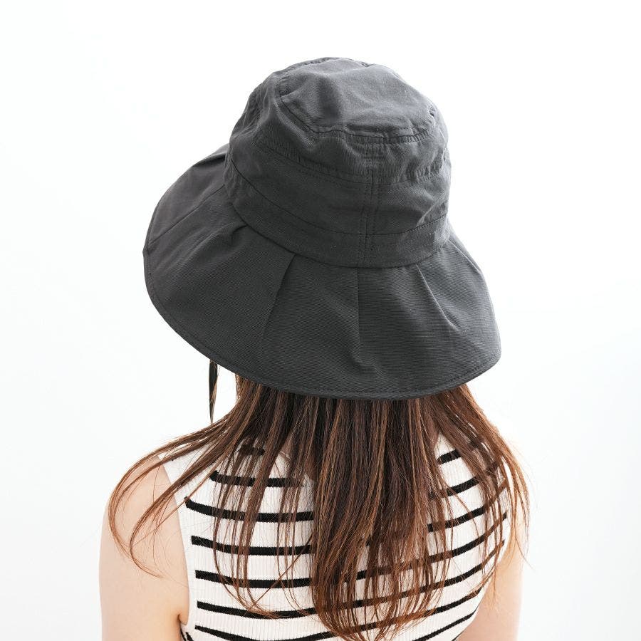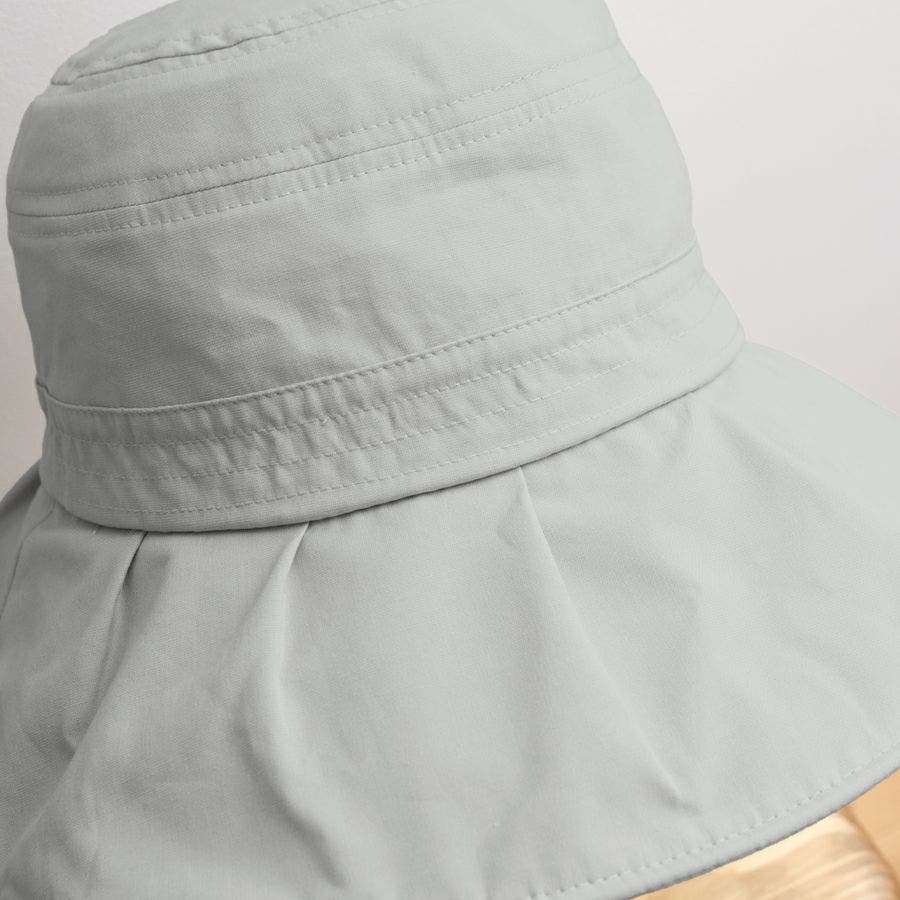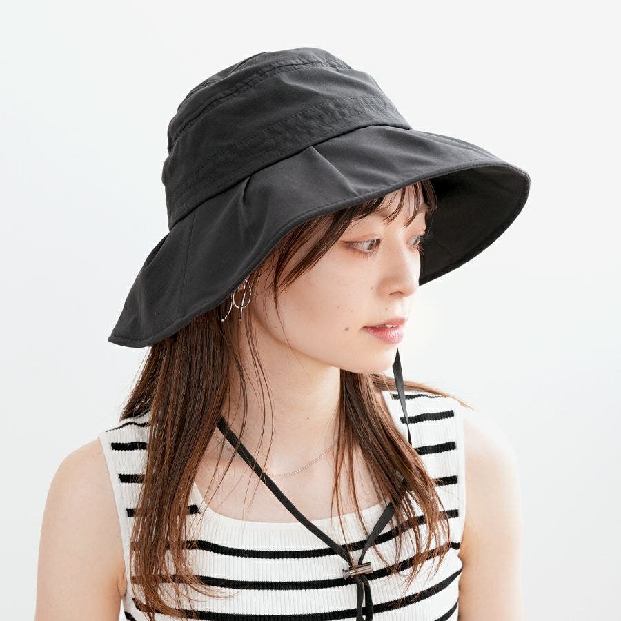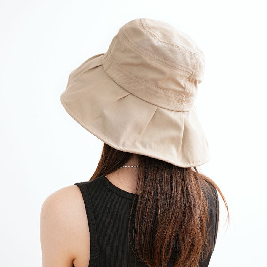 やわらかなギャザー入りのつばが、顔まわりをやさしく包み込み日差しをブロック。
