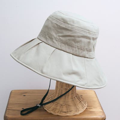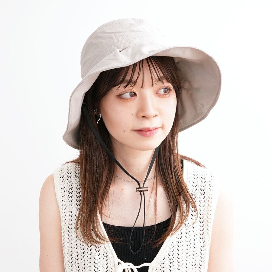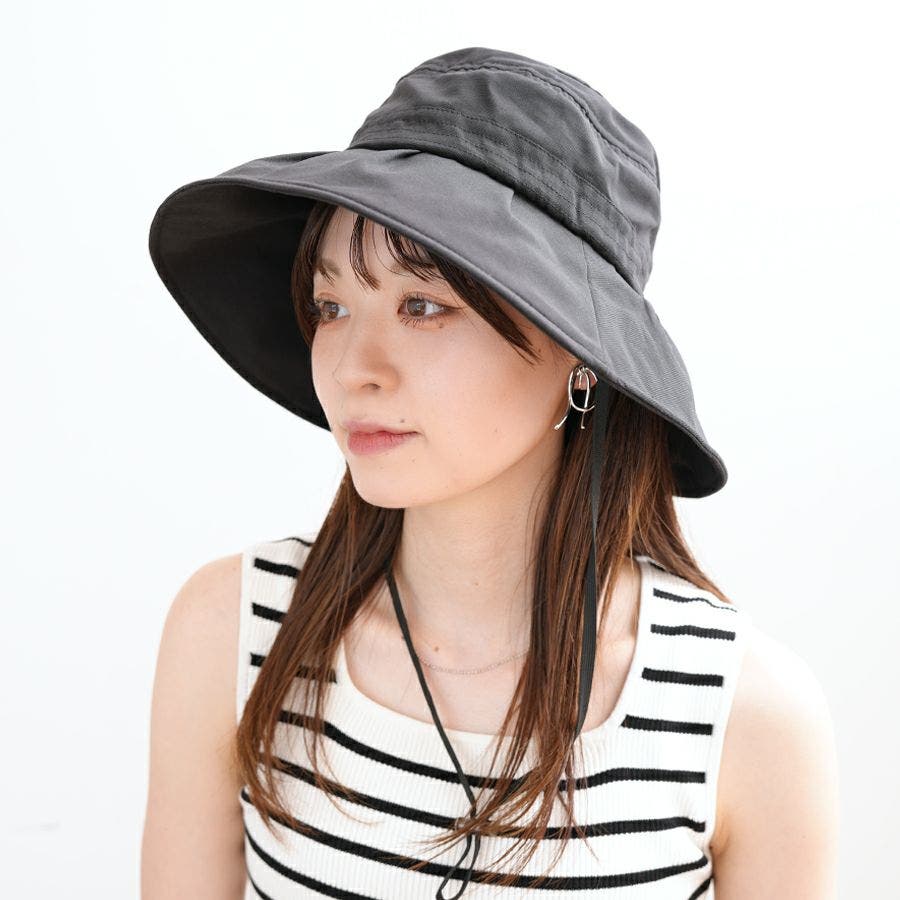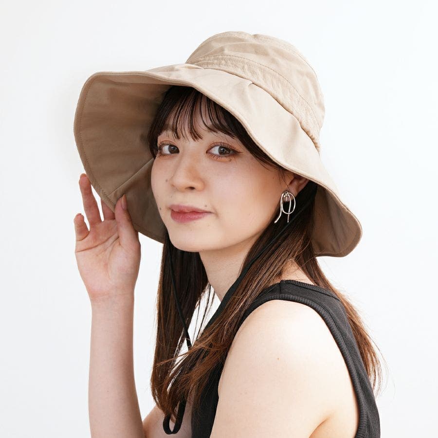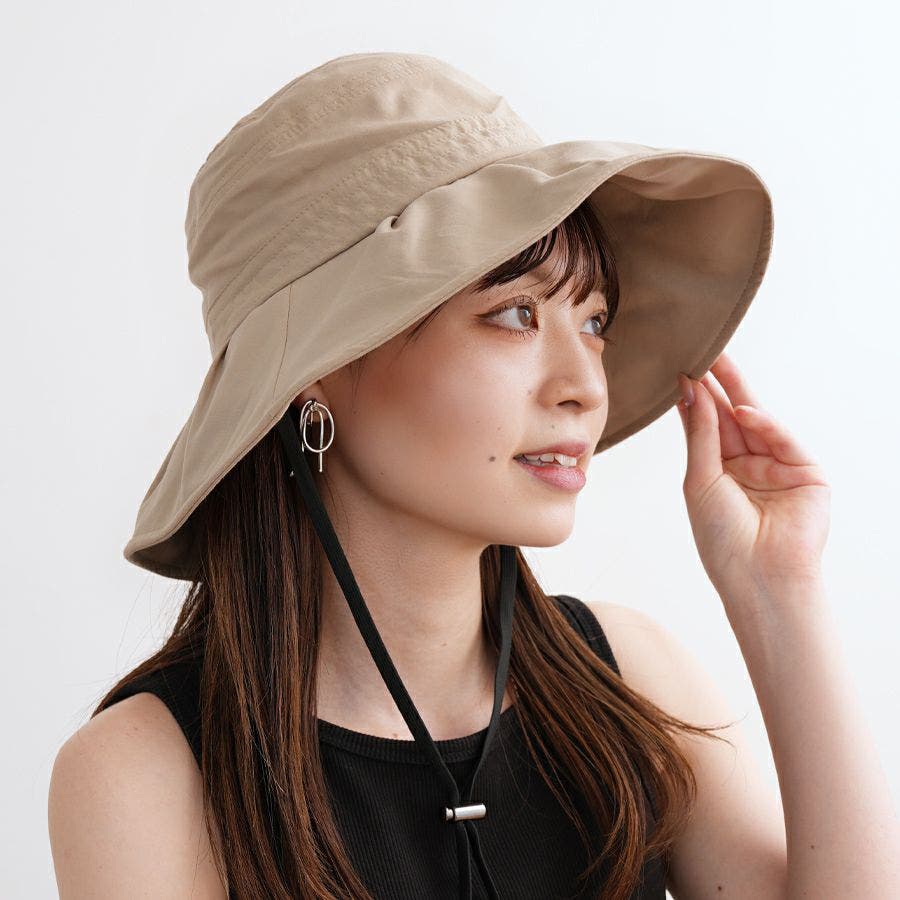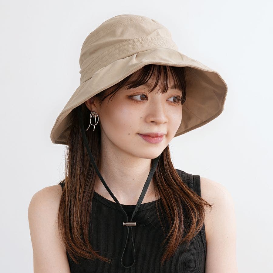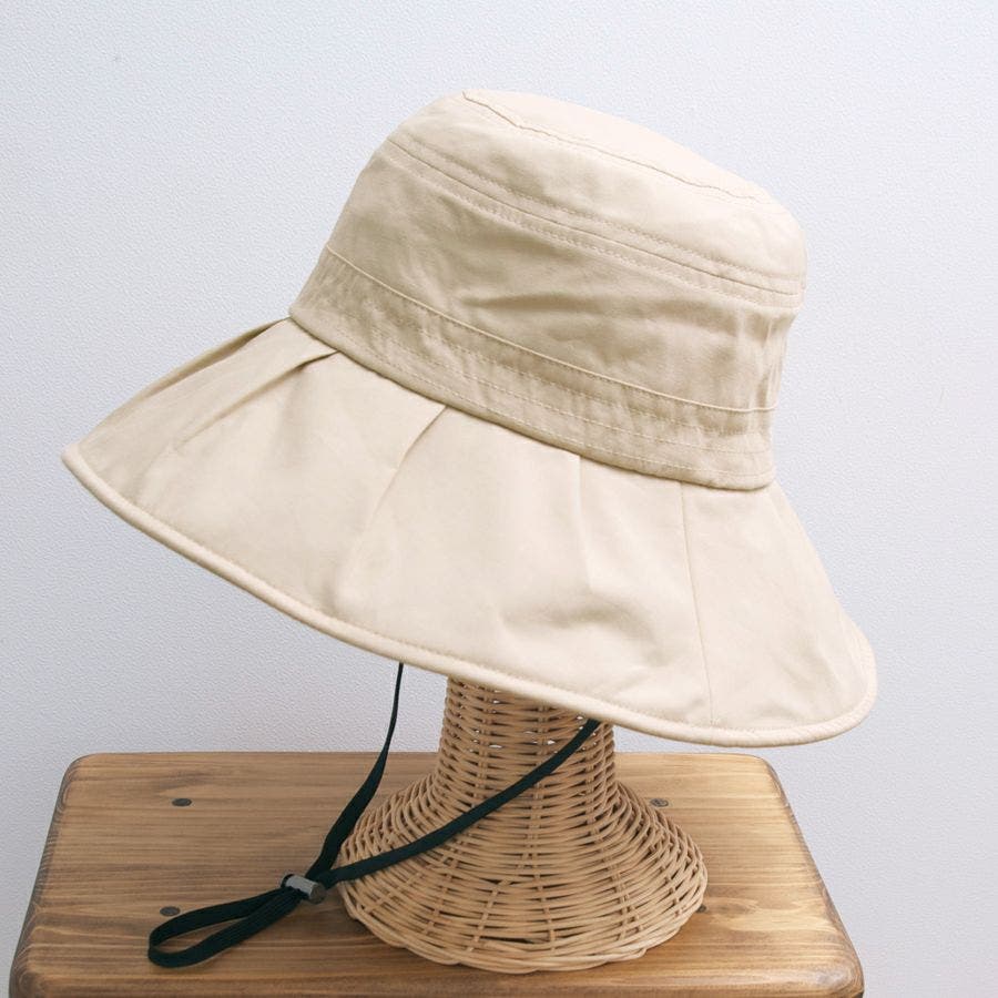 やわらかなギャザー入りのつばが、顔まわりをやさしく包み込み日差しをブロック。