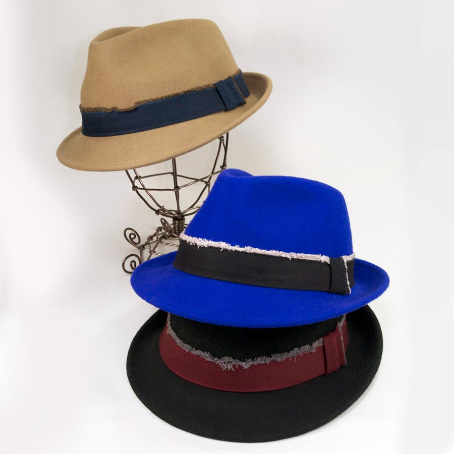 ベルトにダメージ加工と2色の生地を使ったさりげないデザインがオシャレ。トップがそんなに高くないので男女ともにかぶりやすい形のフェルト中折です。サイズ調節出来ます。material:felt100% Size: 58cm Made in China
