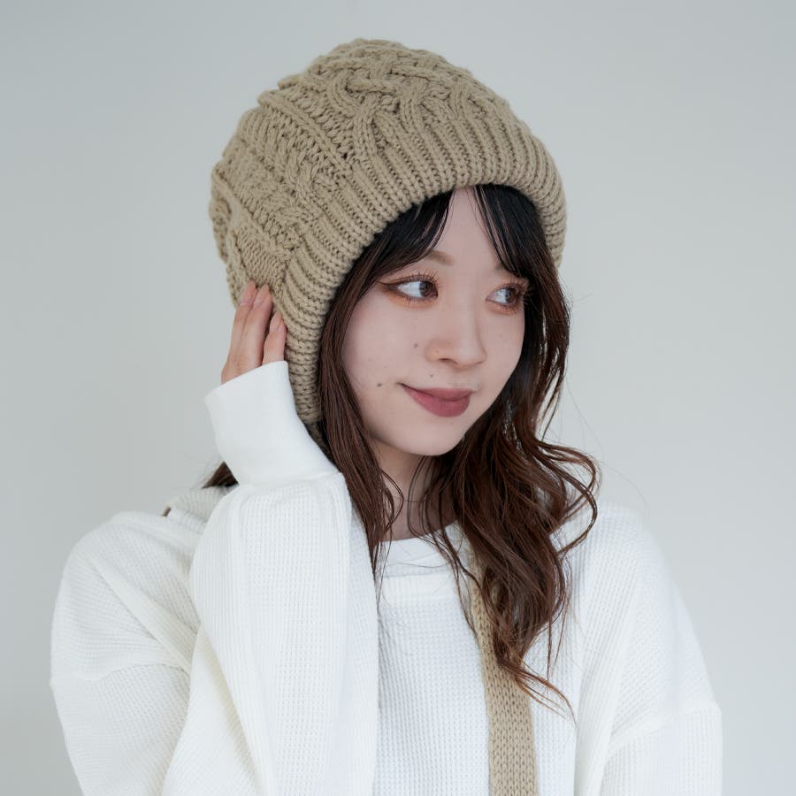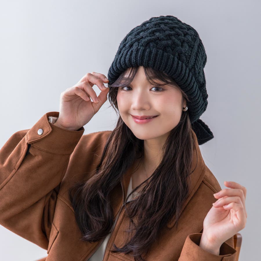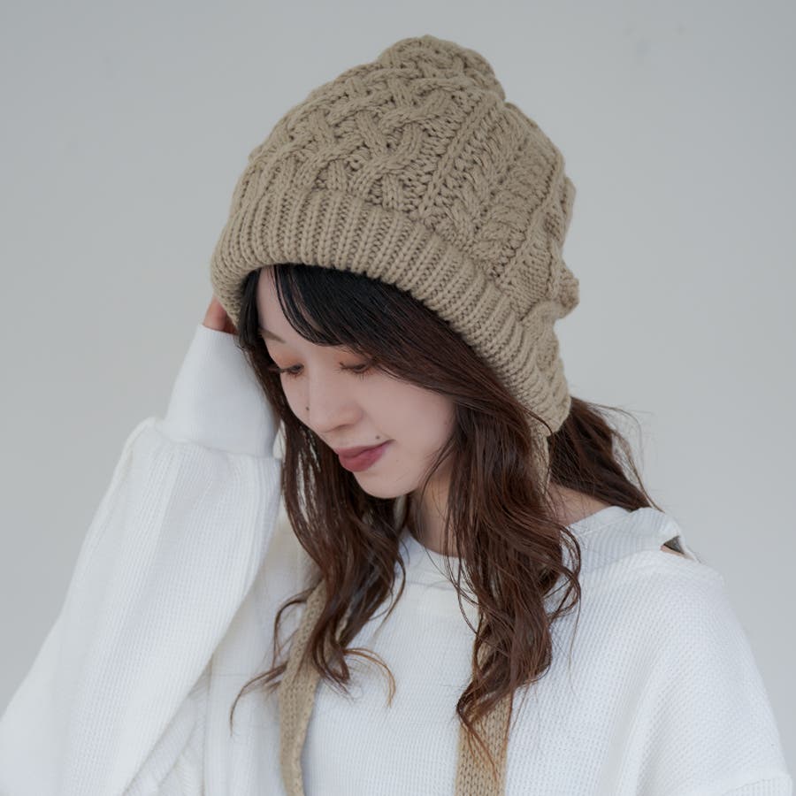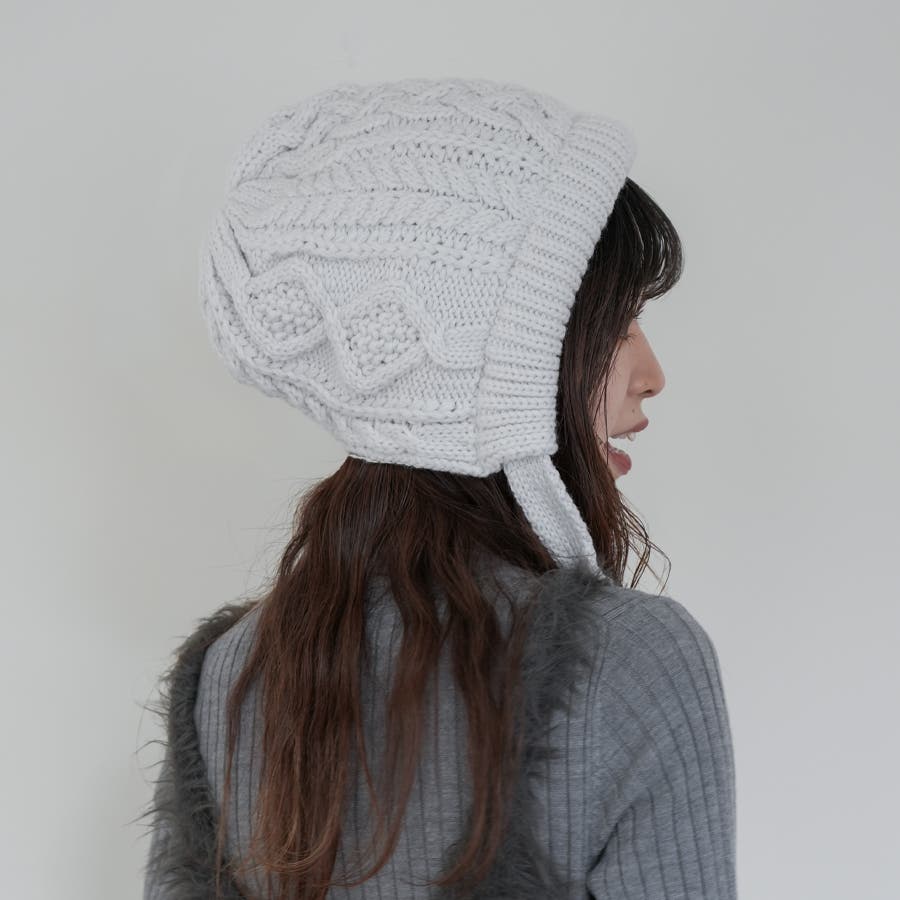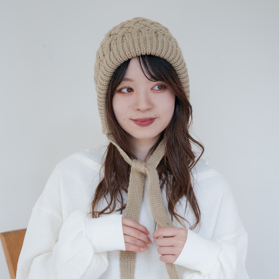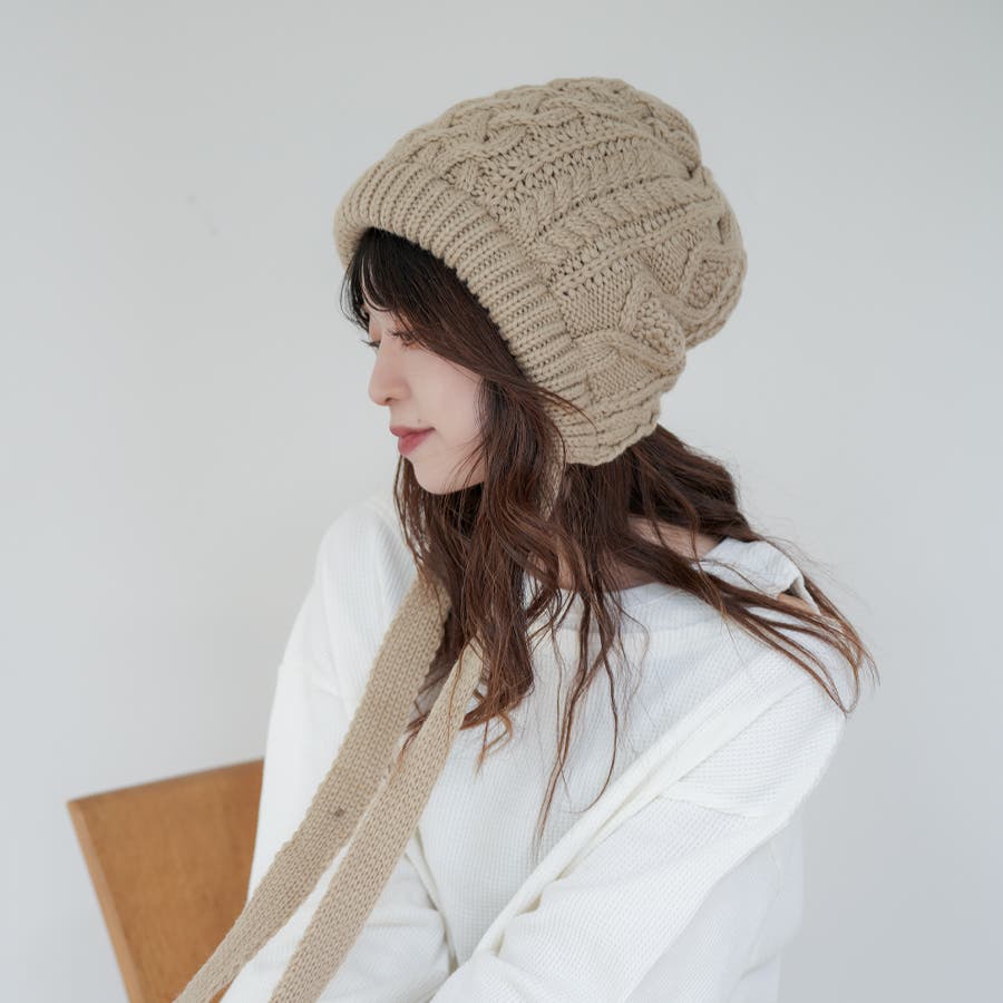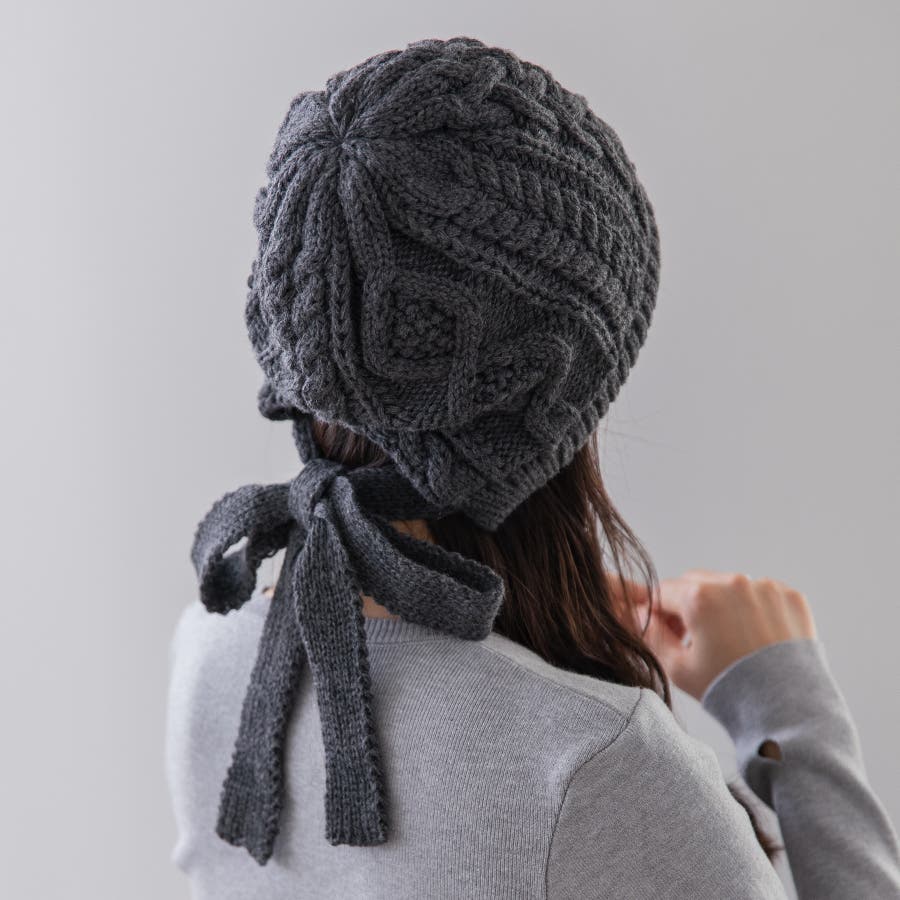 ケーブル編みの立体感が目を引く、トレンド感たっぷりのボンネットニット帽。