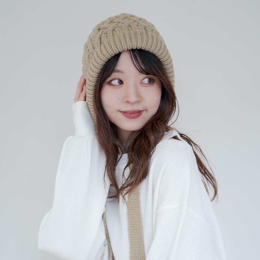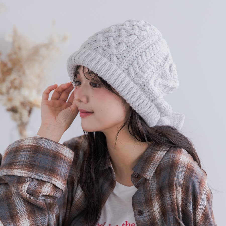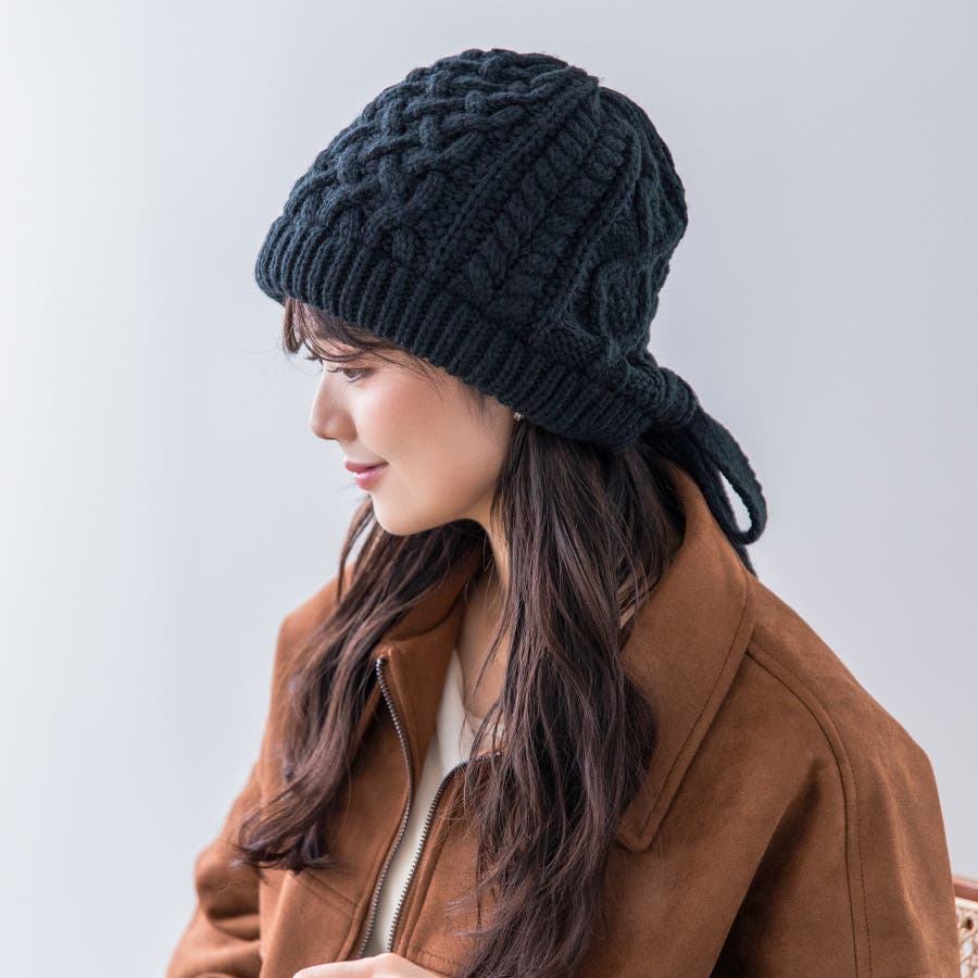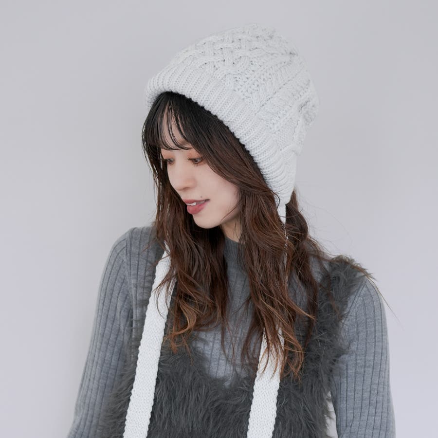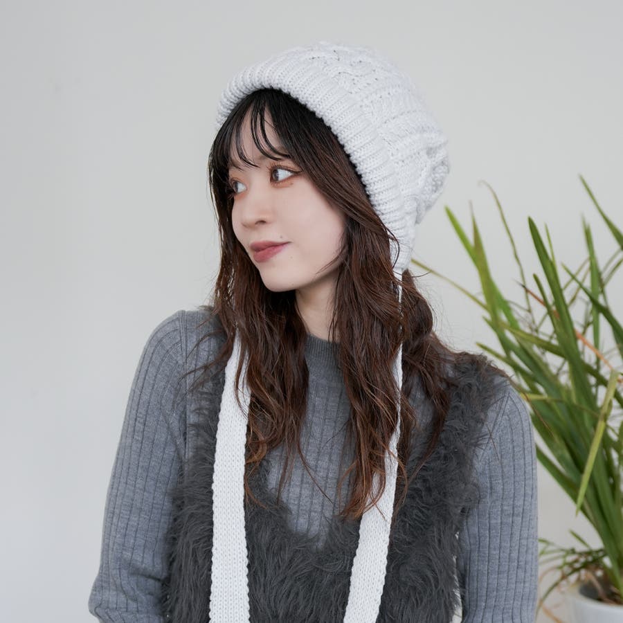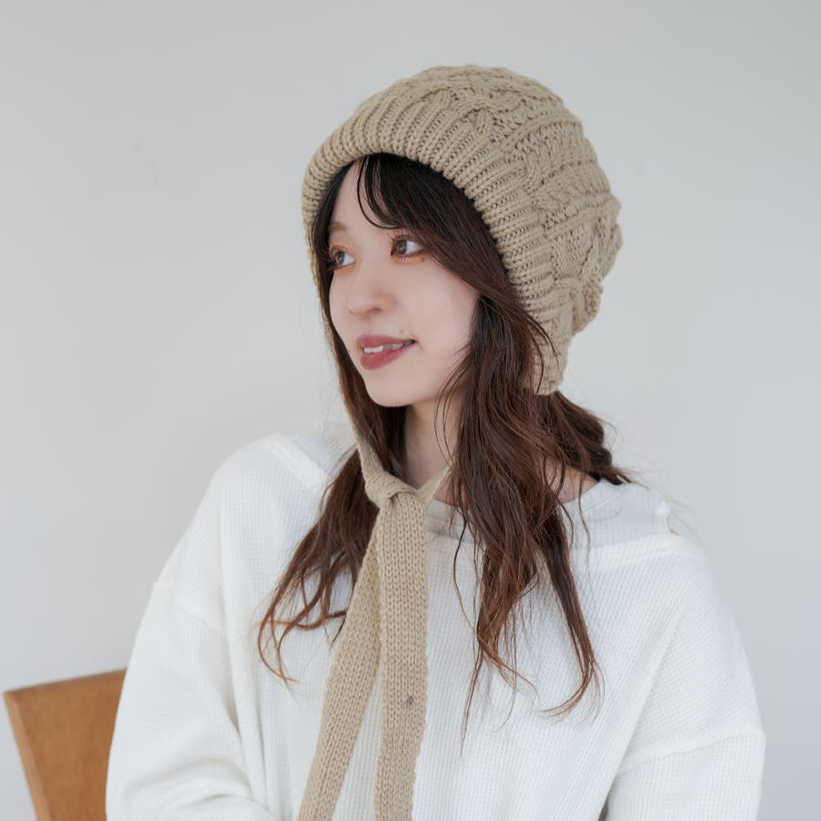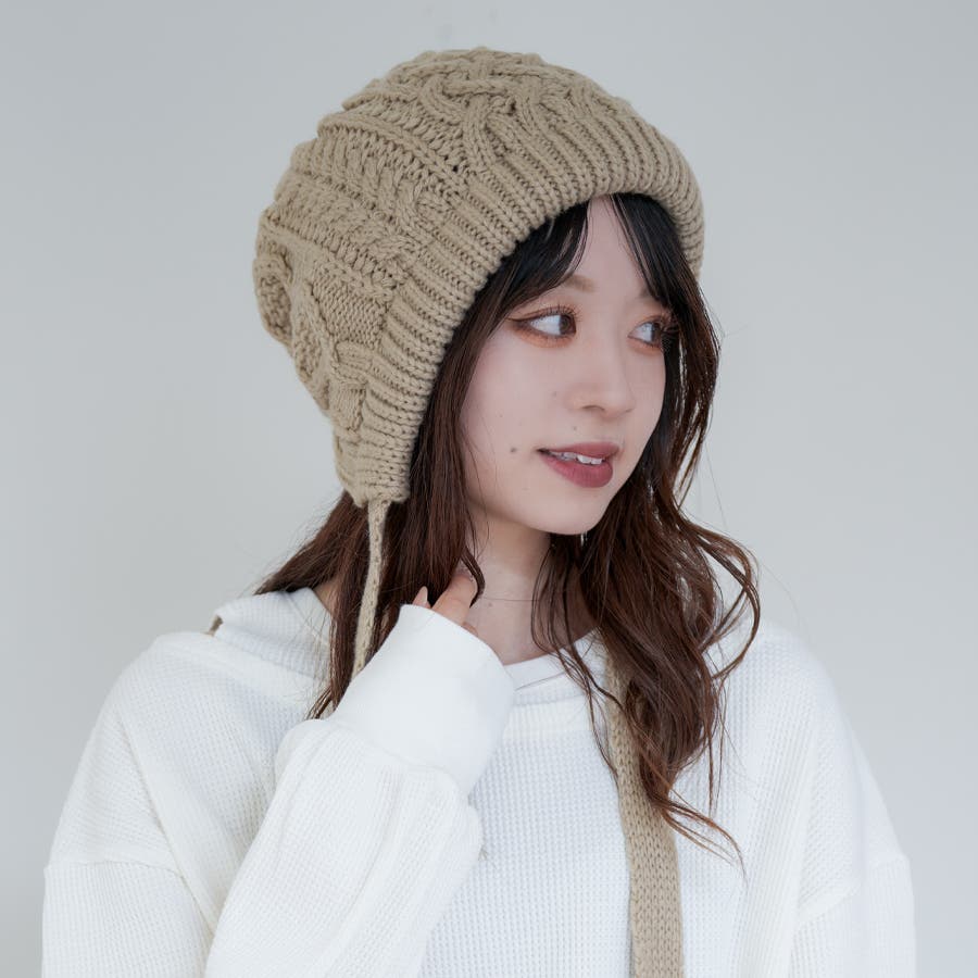 ケーブル編みの立体感が目を引く、トレンド感たっぷりのボンネットニット帽。