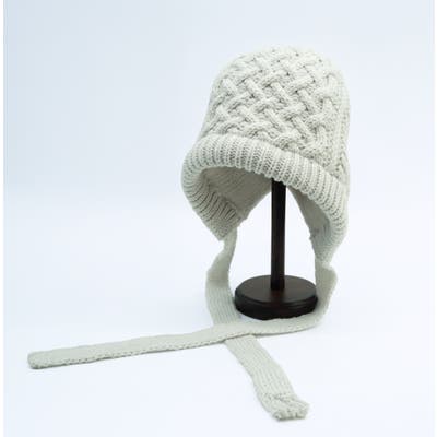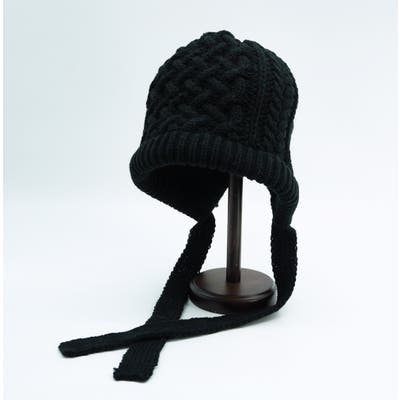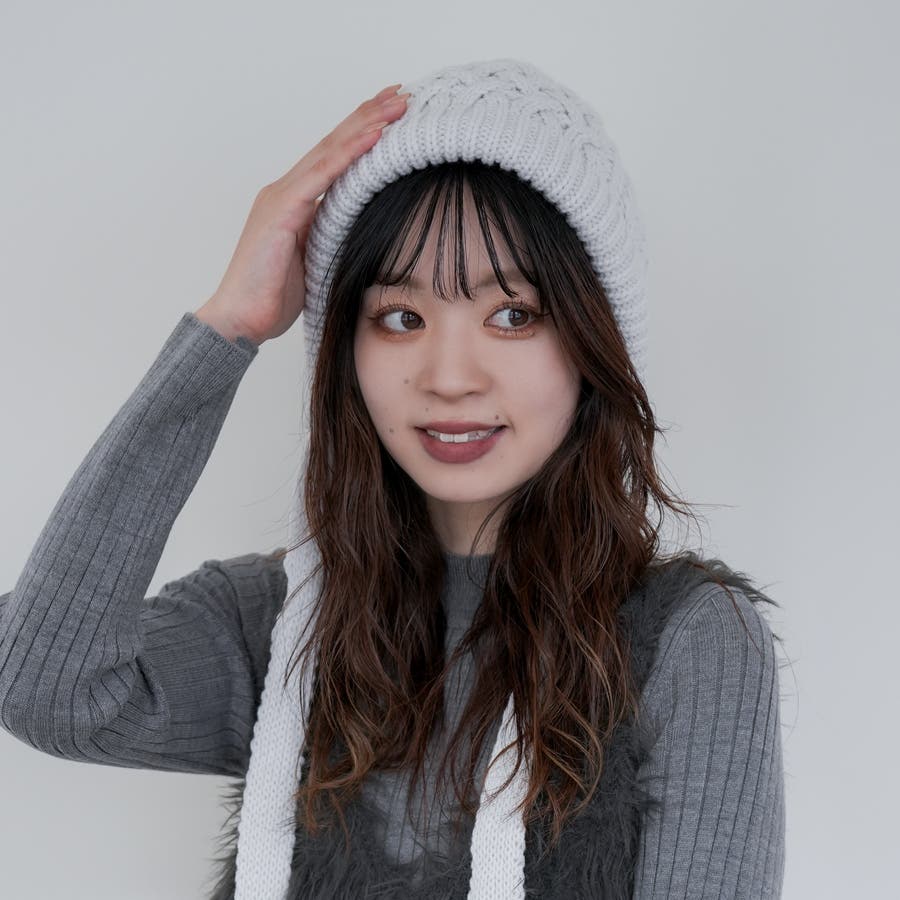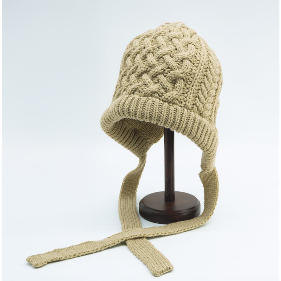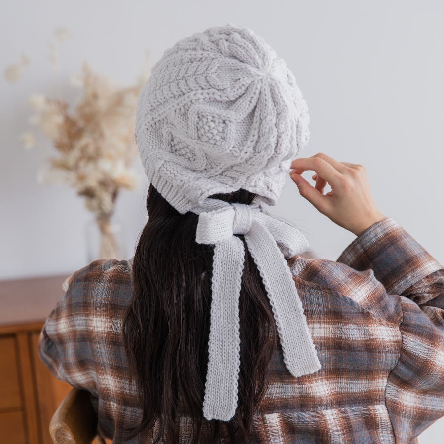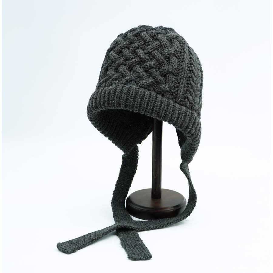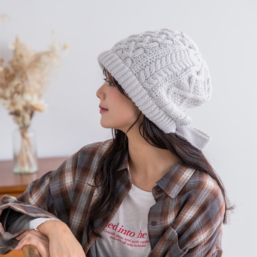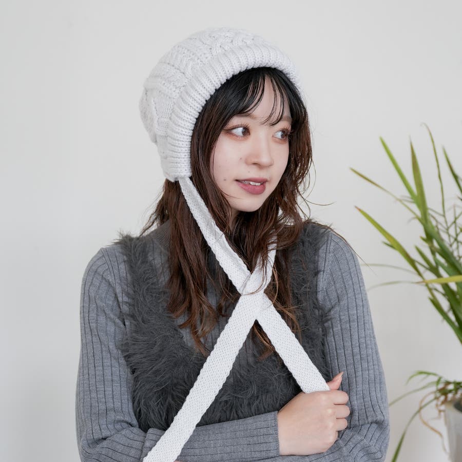 ケーブル編みの立体感が目を引く、トレンド感たっぷりのボンネットニット帽。
