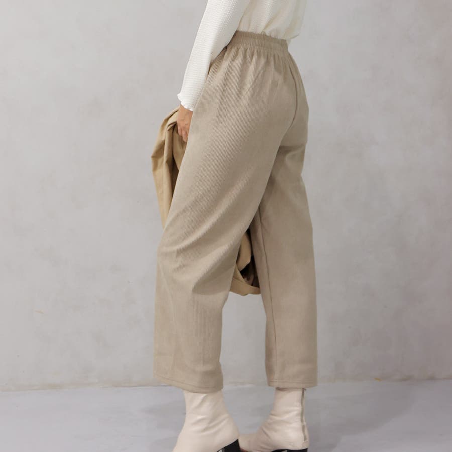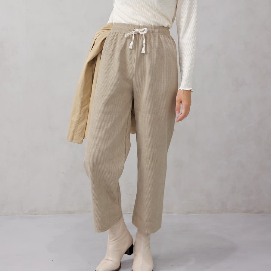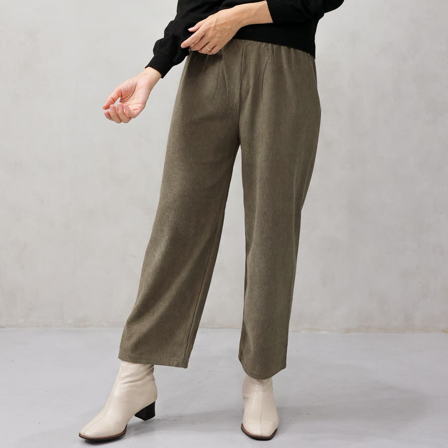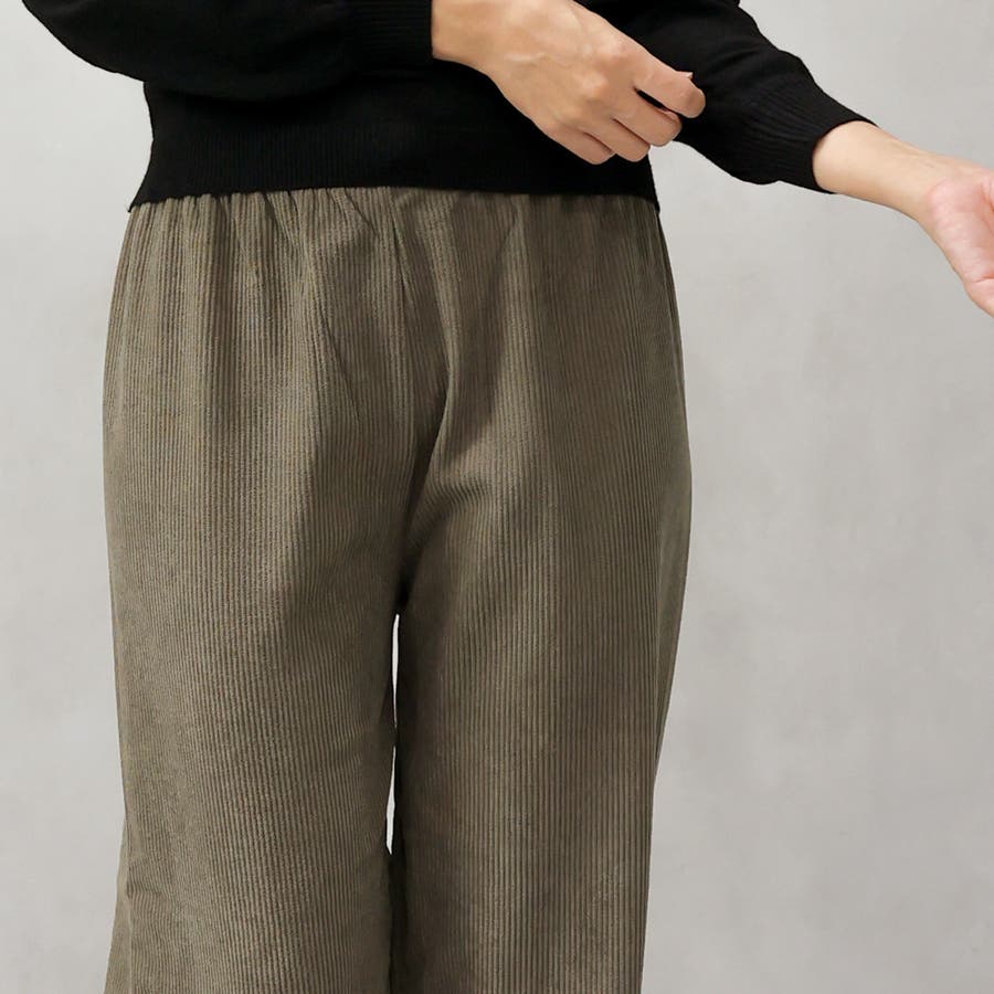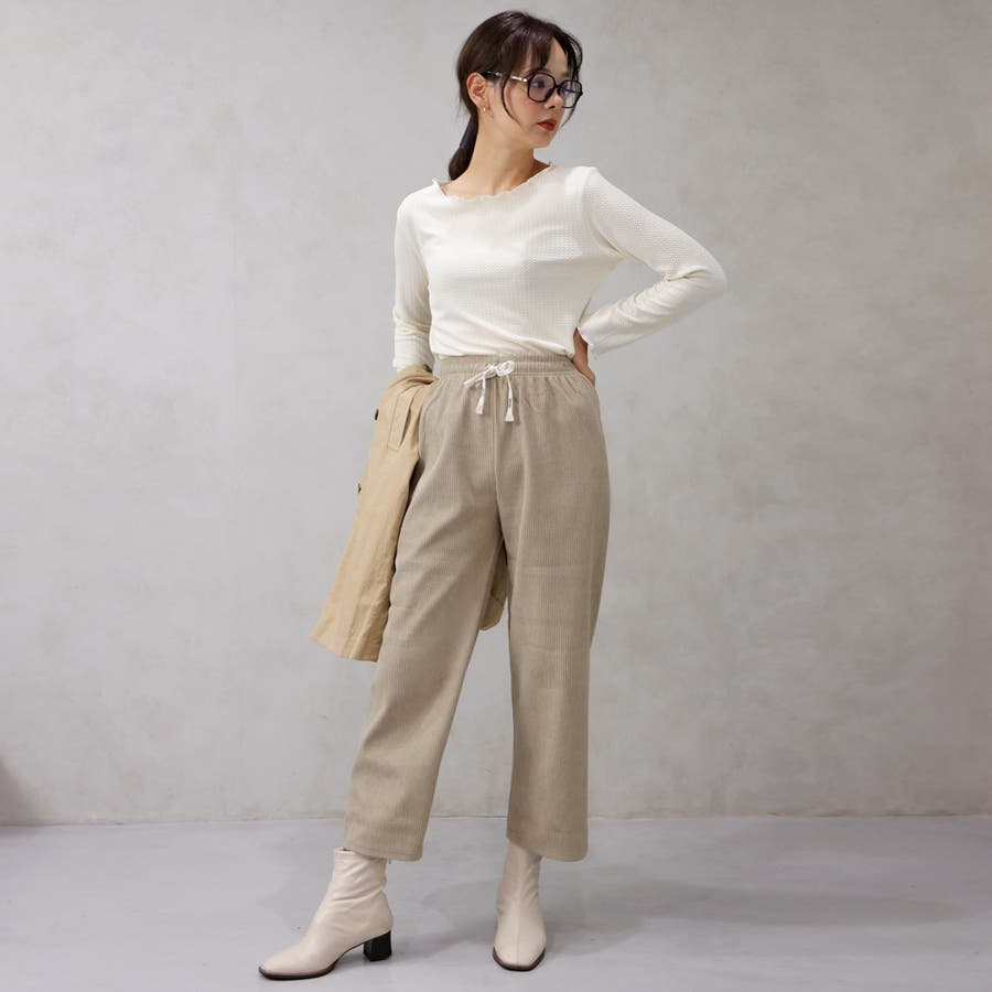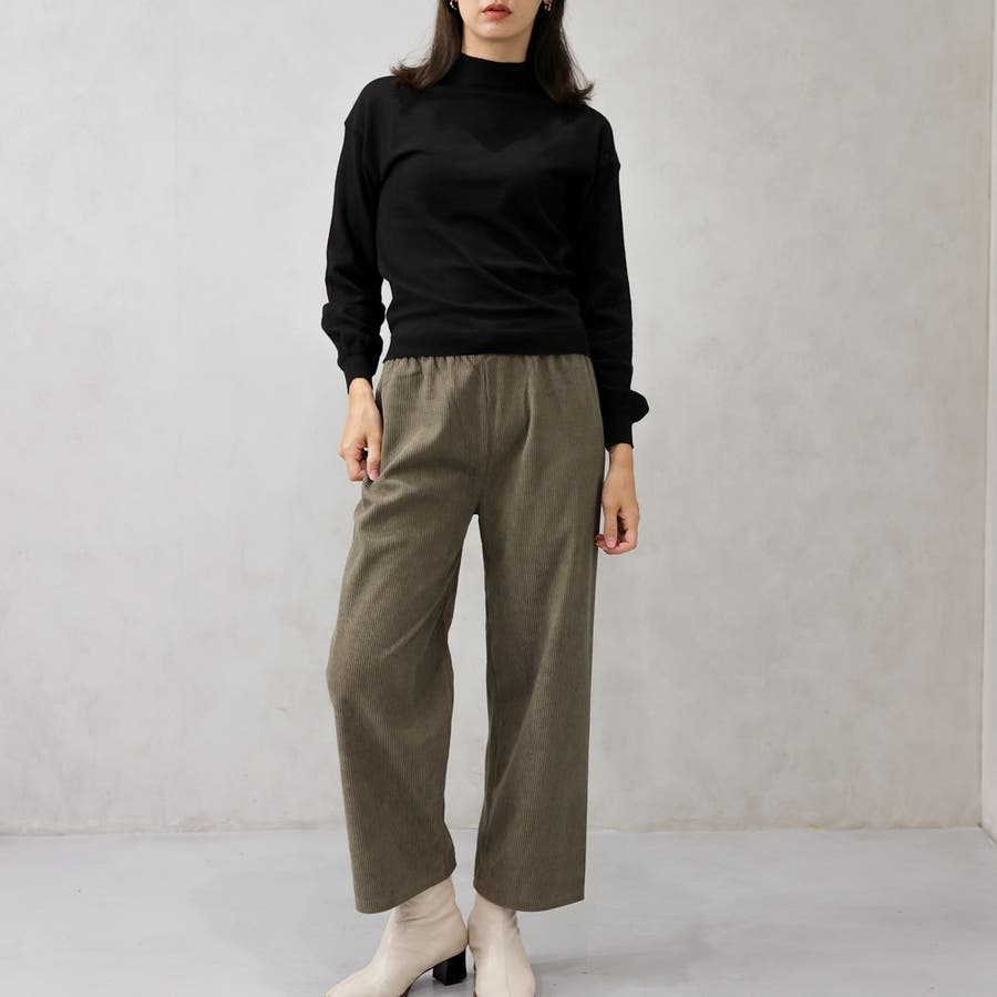 幅広いコーディネートに着回しのきく、ワイドコールのゆるパンツ。